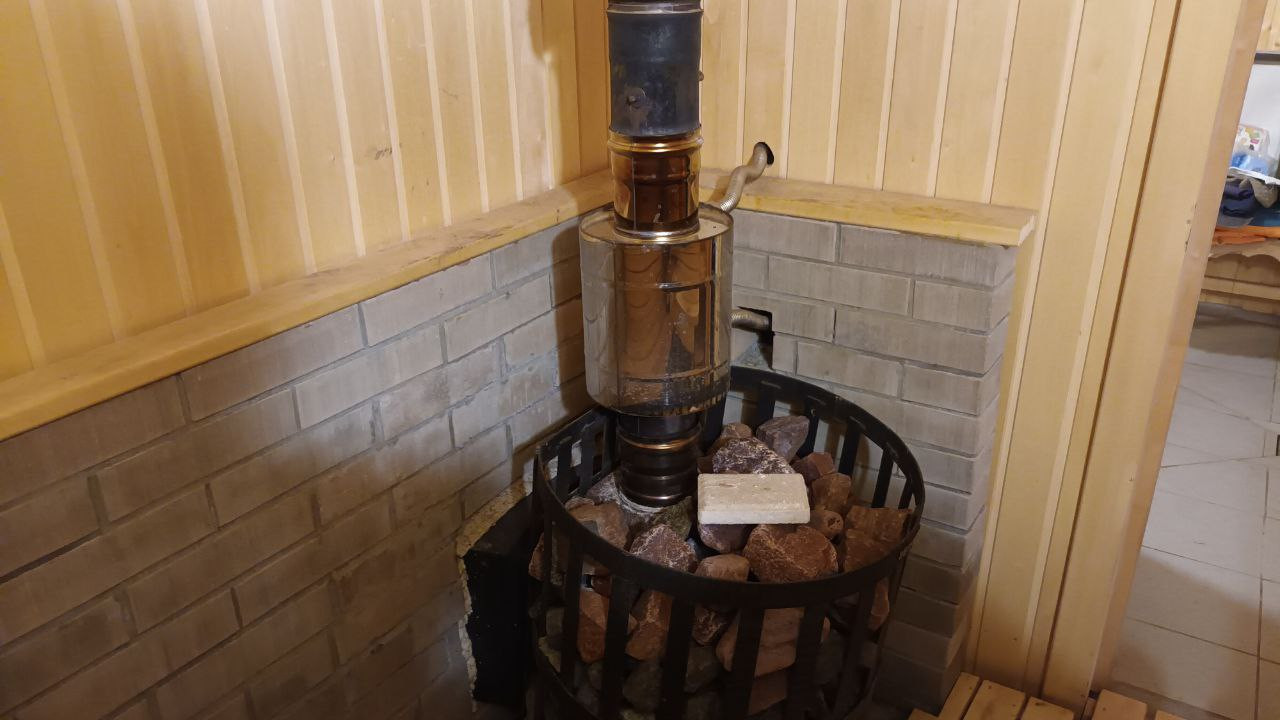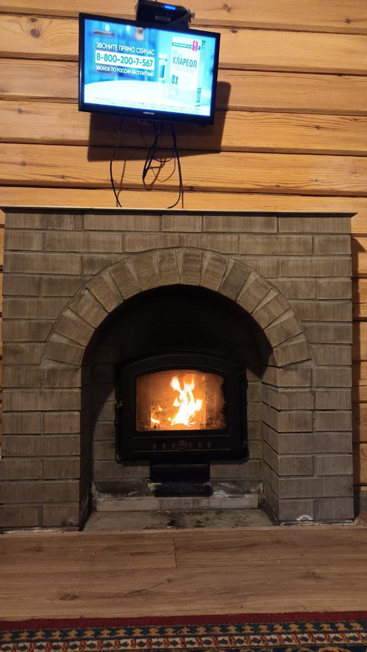 Чугуннaя печь со стеклом  и имитацией камина, комната отдыха, кухня и прихожая.
