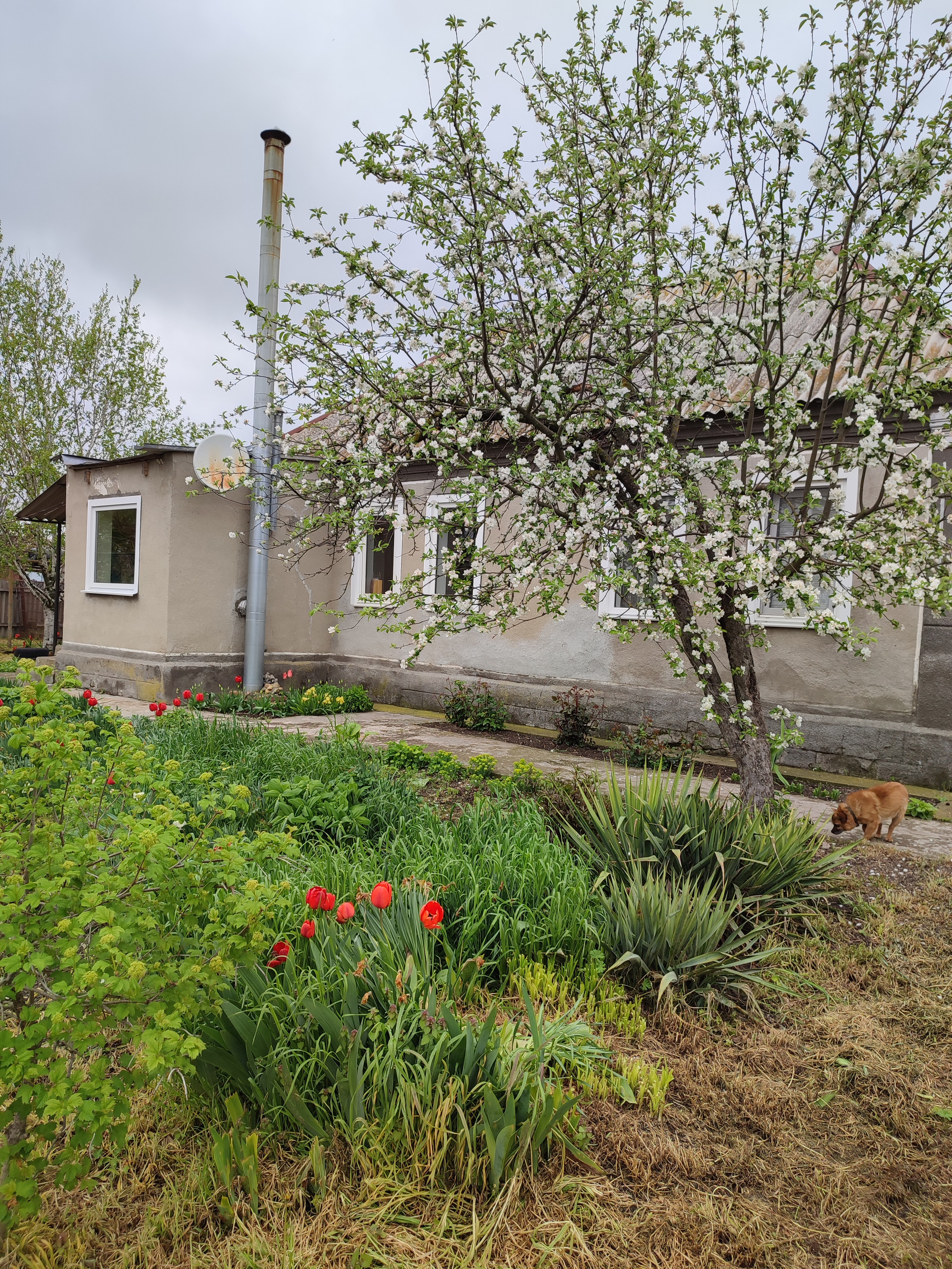 Дом очень тёплый из бутового камня. Окна м/п. Вода в доме, холодная и горячая. Ванна. Сад, огород, кустарники.цветники. металлический гараж