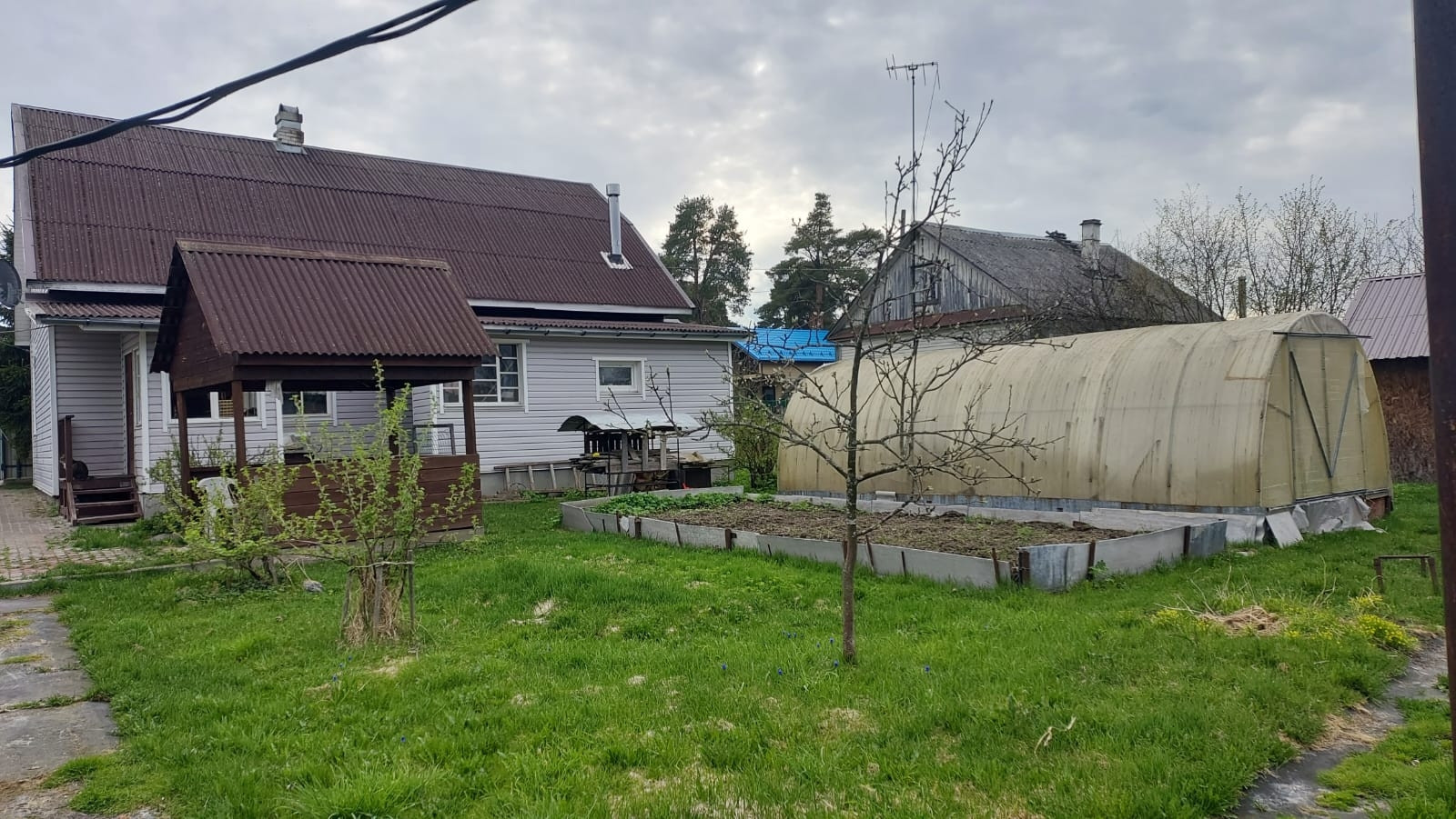 Участок разработан. Растут плодове деревья, кустарники, теплица.