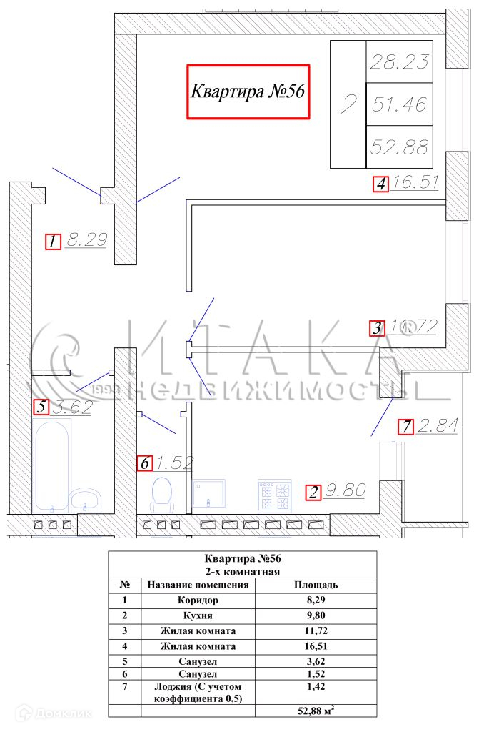 Общая площадь 52.88 м2