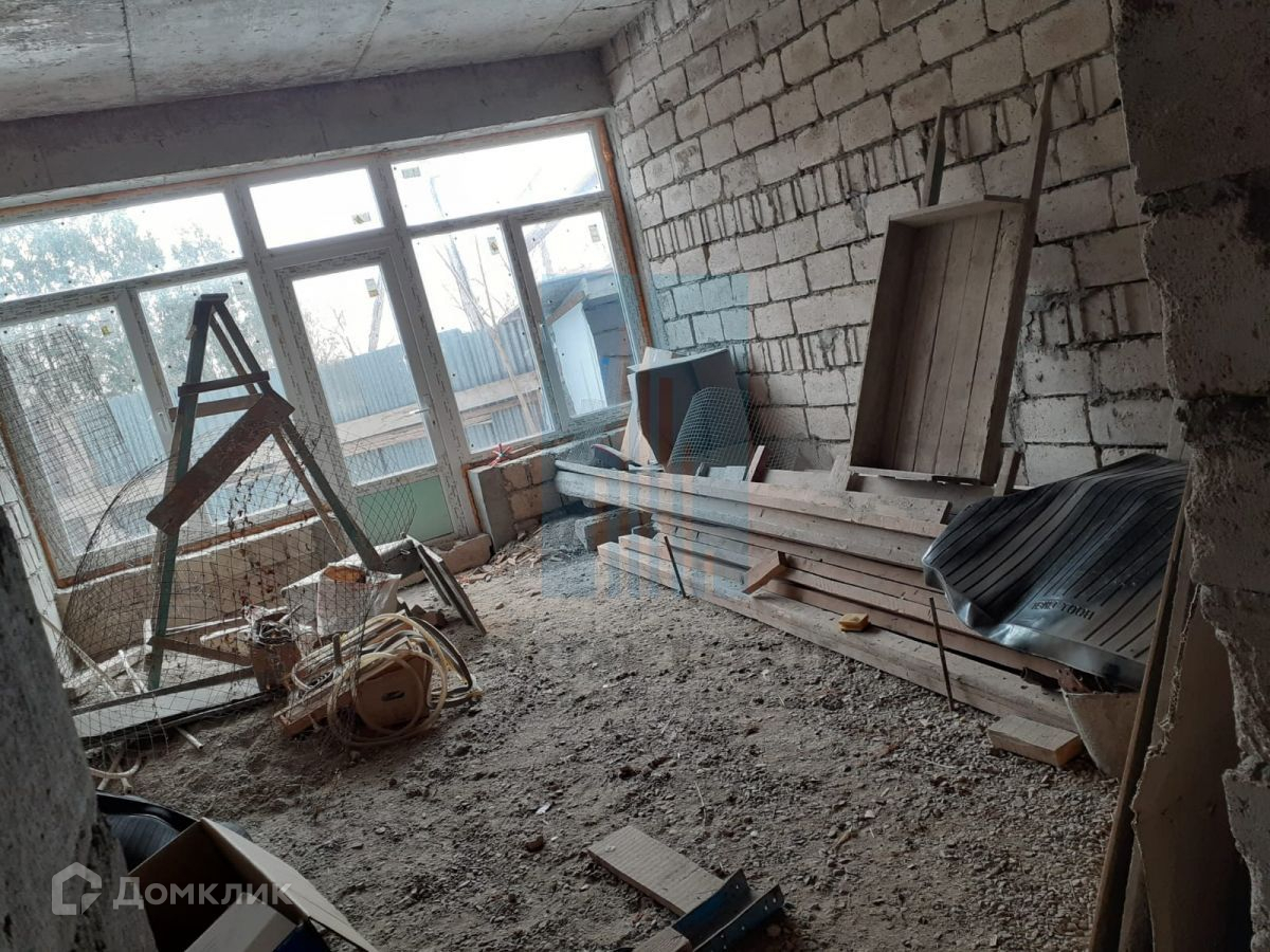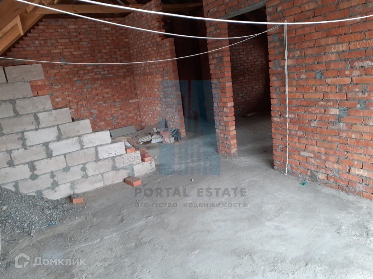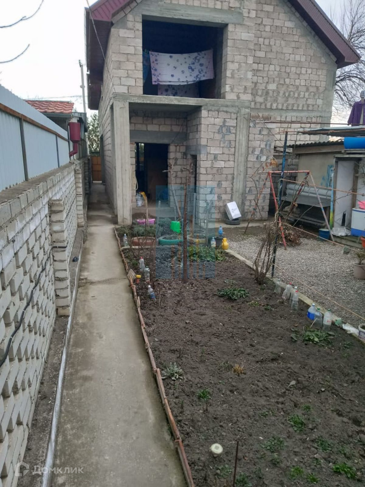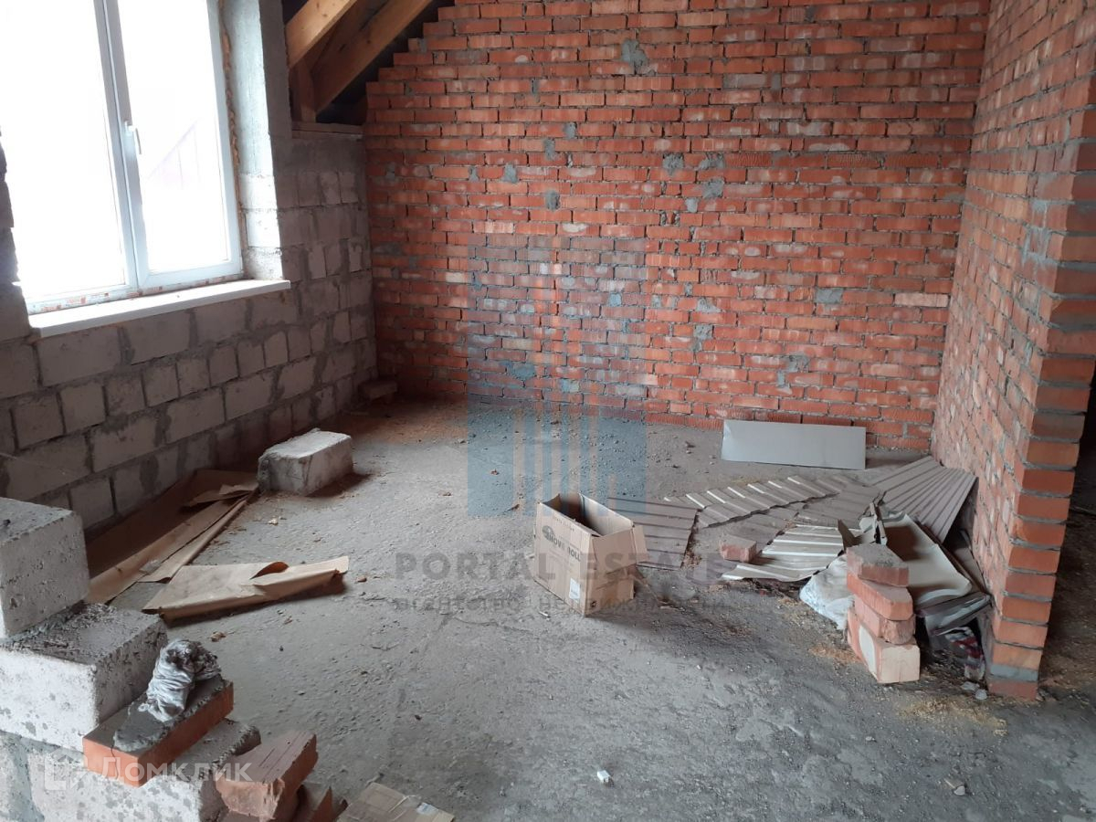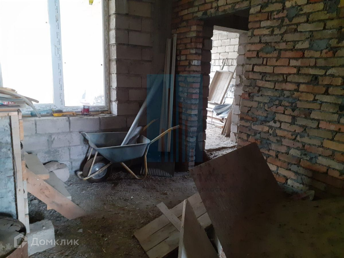 В начале участка с выходом на улицу, построен двухэтажный дом 173 кв.м. Дом не достроен: возведены стены -теплоблок (толщина 40 см), перекрытия - монолит (толщина 20 см), внутренние перегородки - кирпич, окна - пластик. Между этажами монолитная бетонная лестница. Фундамент монолитный. Первый этаж планировался под бизнес (салон красоты),  выделено место под гараж, санузел.  Второй этаж имеет три комнаты, кухню, санузел. Имеется разрешение на строительство 2016г, дом строился по проекту.