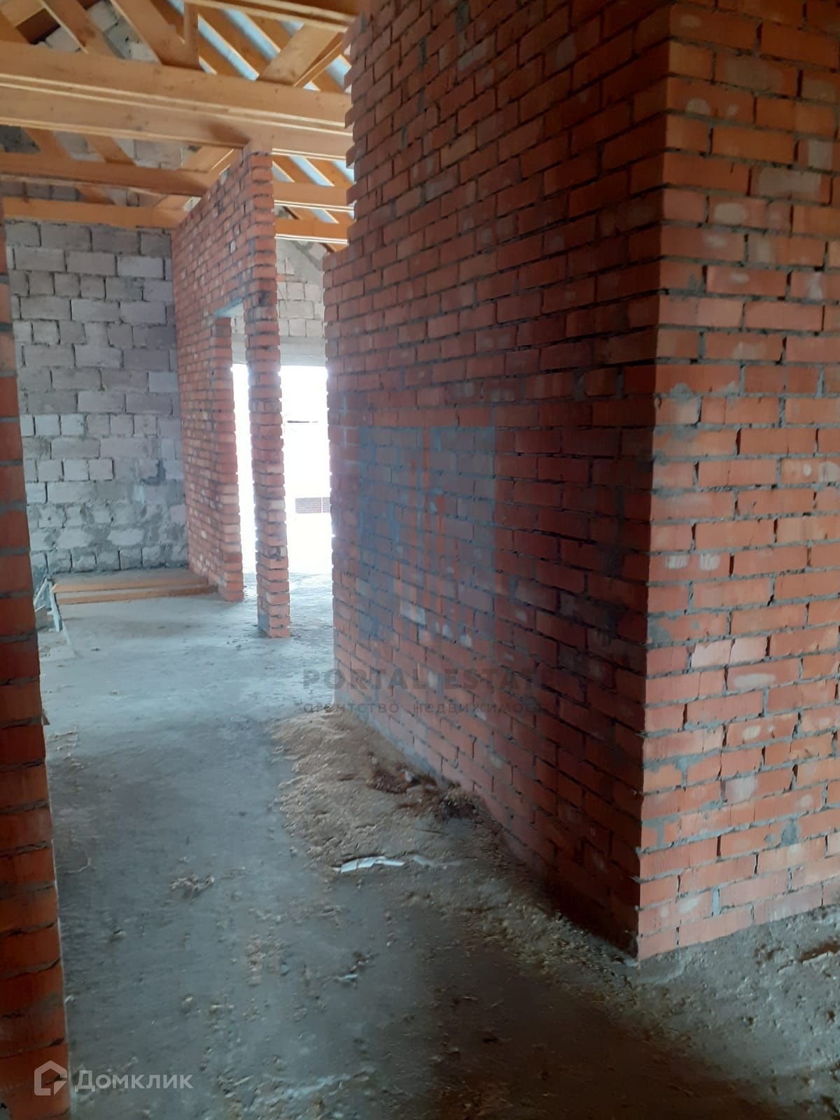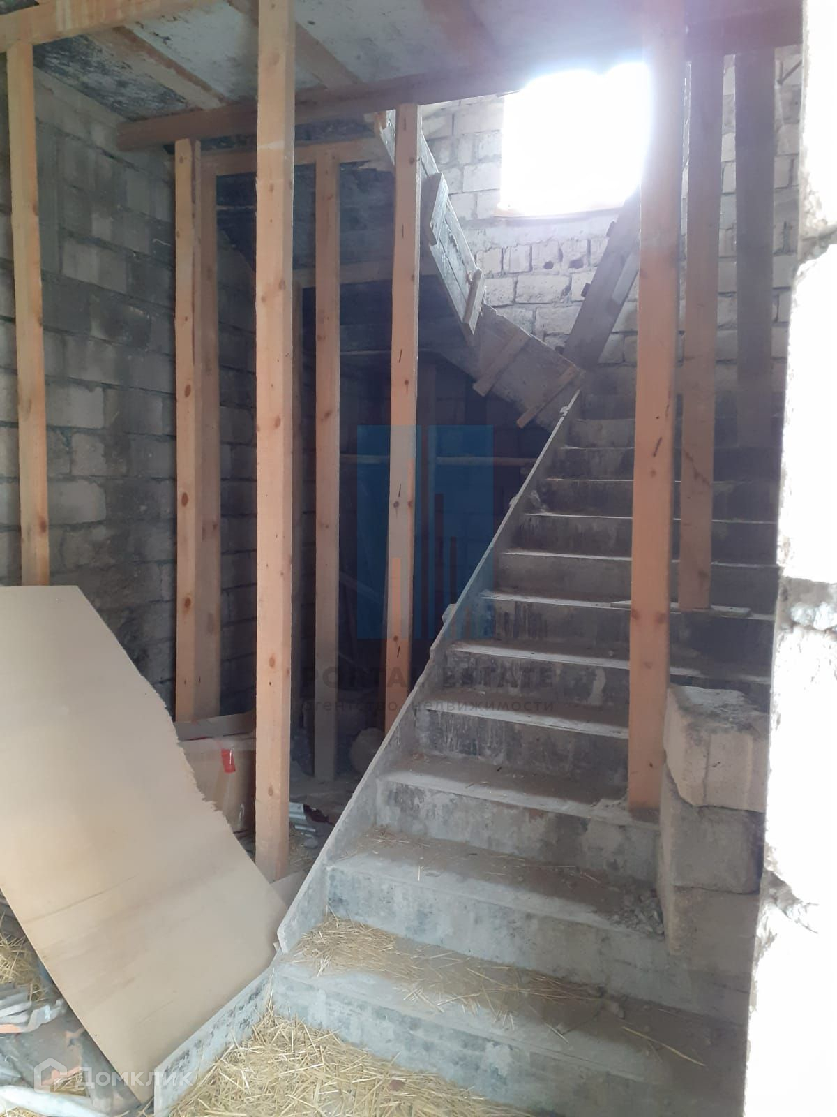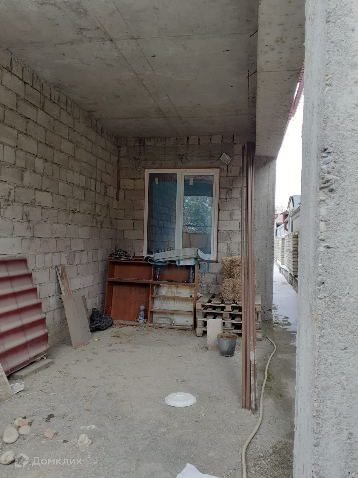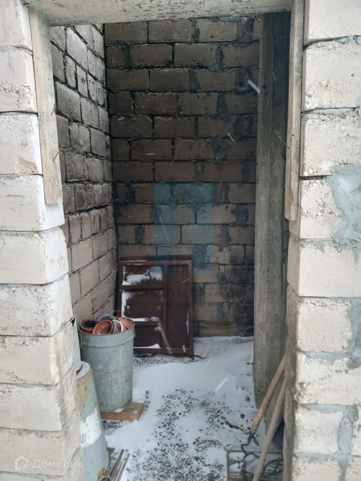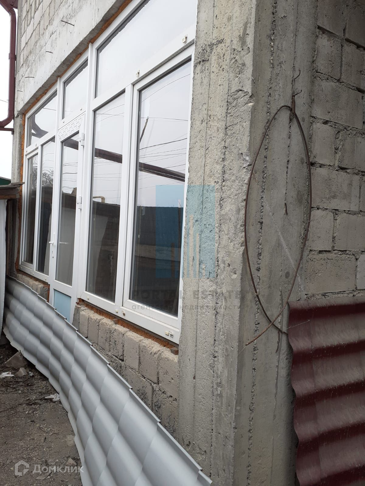 В начале участка с выходом на улицу, построен двухэтажный дом 173 кв.м. Дом не достроен: возведены стены -теплоблок (толщина 40 см), перекрытия - монолит (толщина 20 см), внутренние перегородки - кирпич, окна - пластик. Между этажами монолитная бетонная лестница. Фундамент монолитный. Первый этаж планировался под бизнес (салон красоты),  выделено место под гараж, санузел.  Второй этаж имеет три комнаты, кухню, санузел. Имеется разрешение на строительство 2016г, дом строился по проекту.