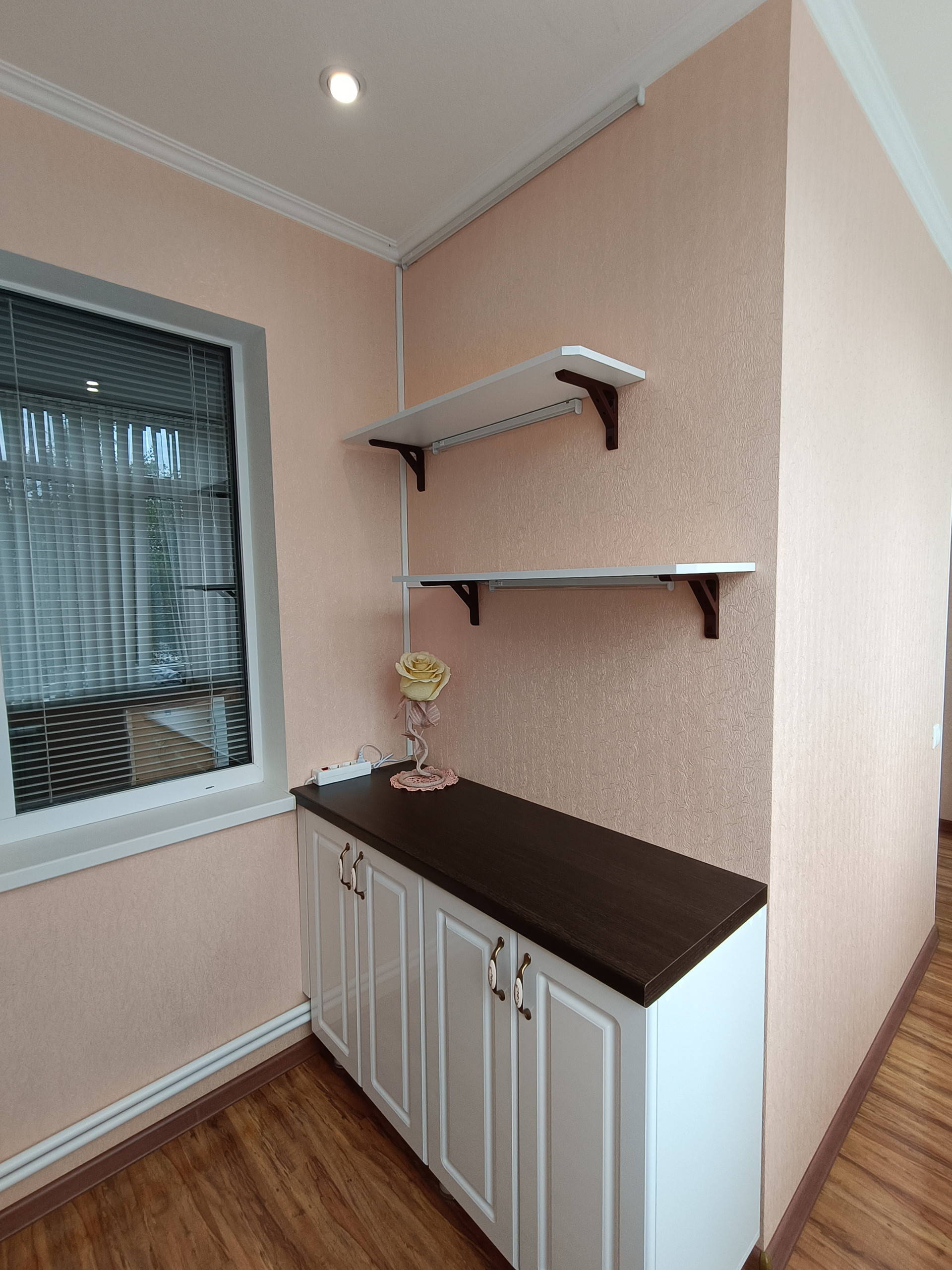 Большая отапливаемая лоджия (примерно 5 кв.м.), как отдельная небольшая комната со встроенной мебелью.