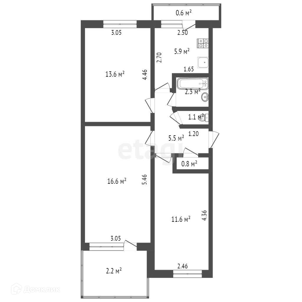 Общая площадь 57.4 м2