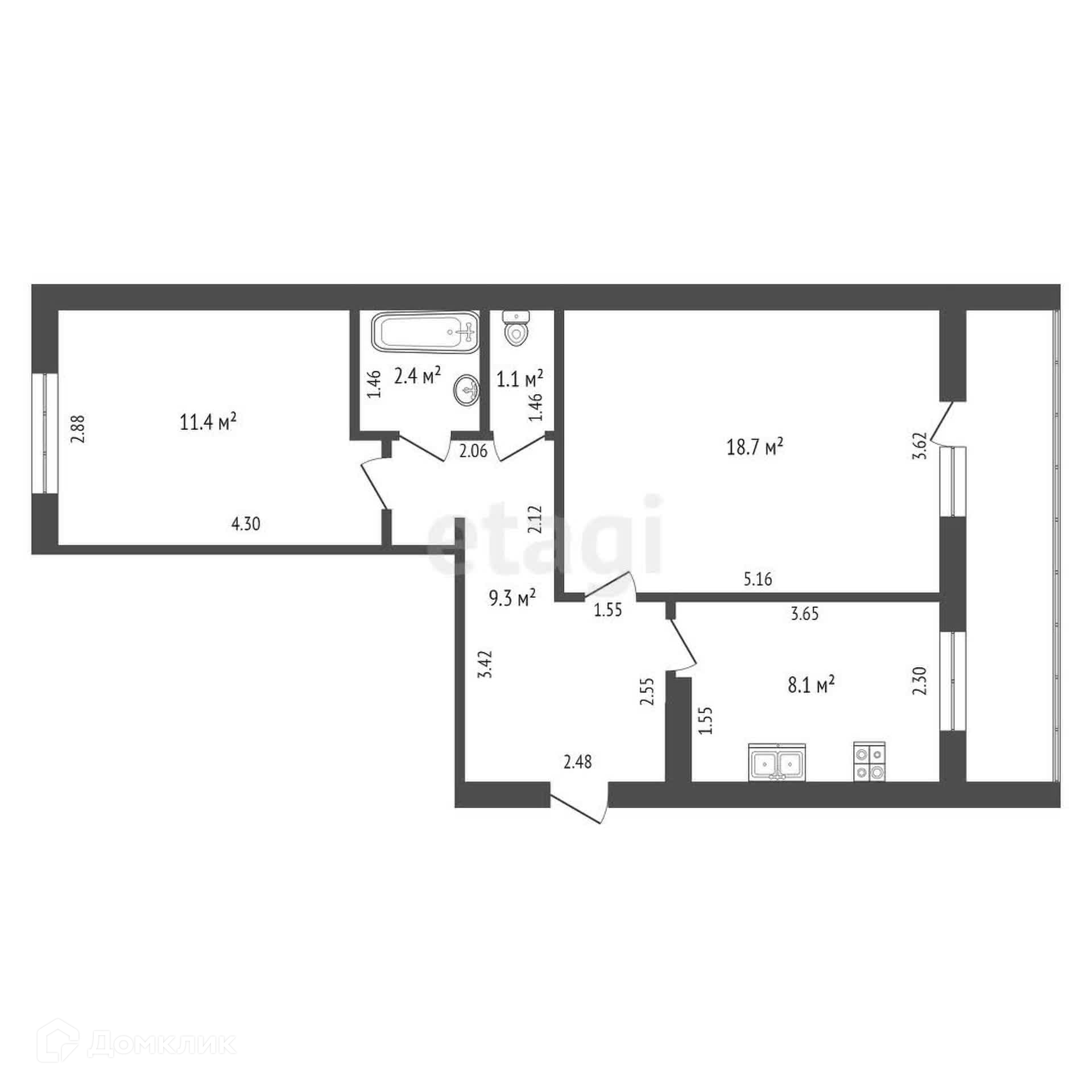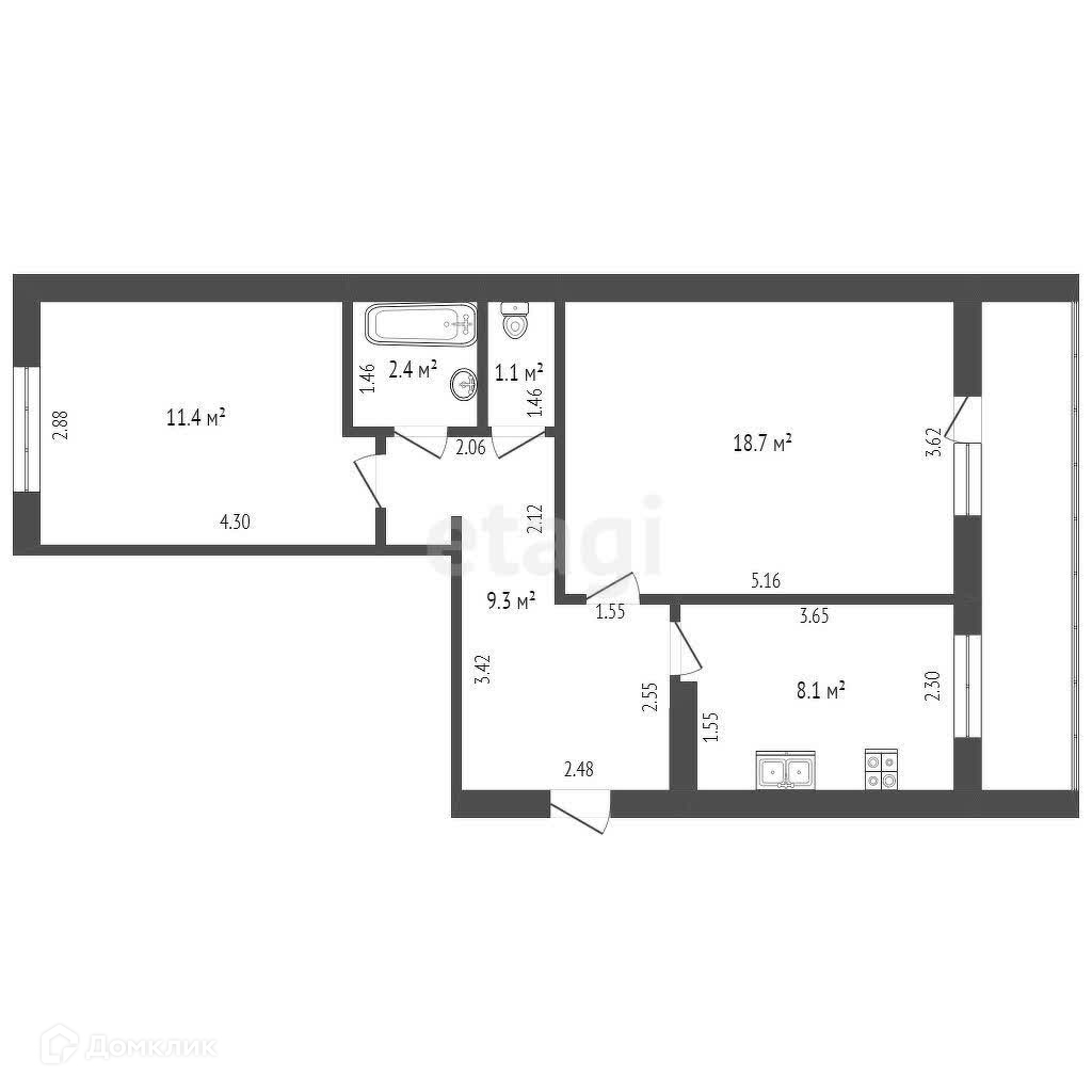 Общая площадь 52.3 м2