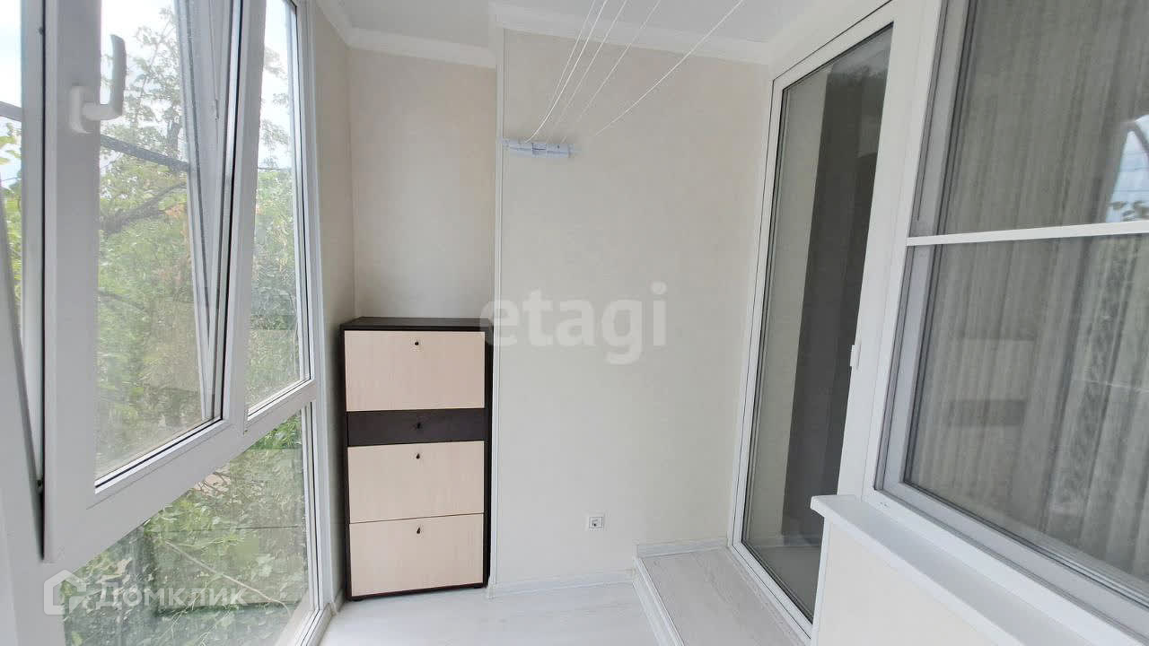 Балкон застеклен пластиковыми, панорамными окнами.