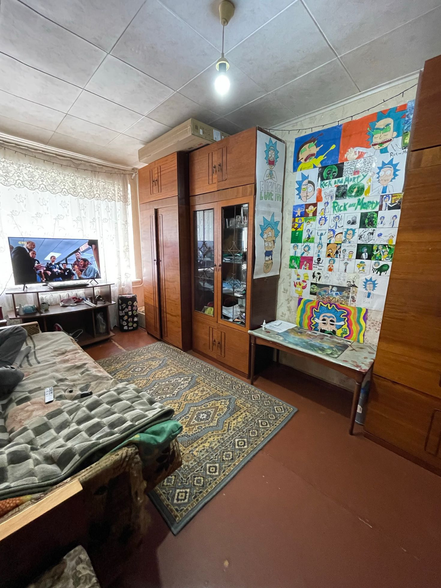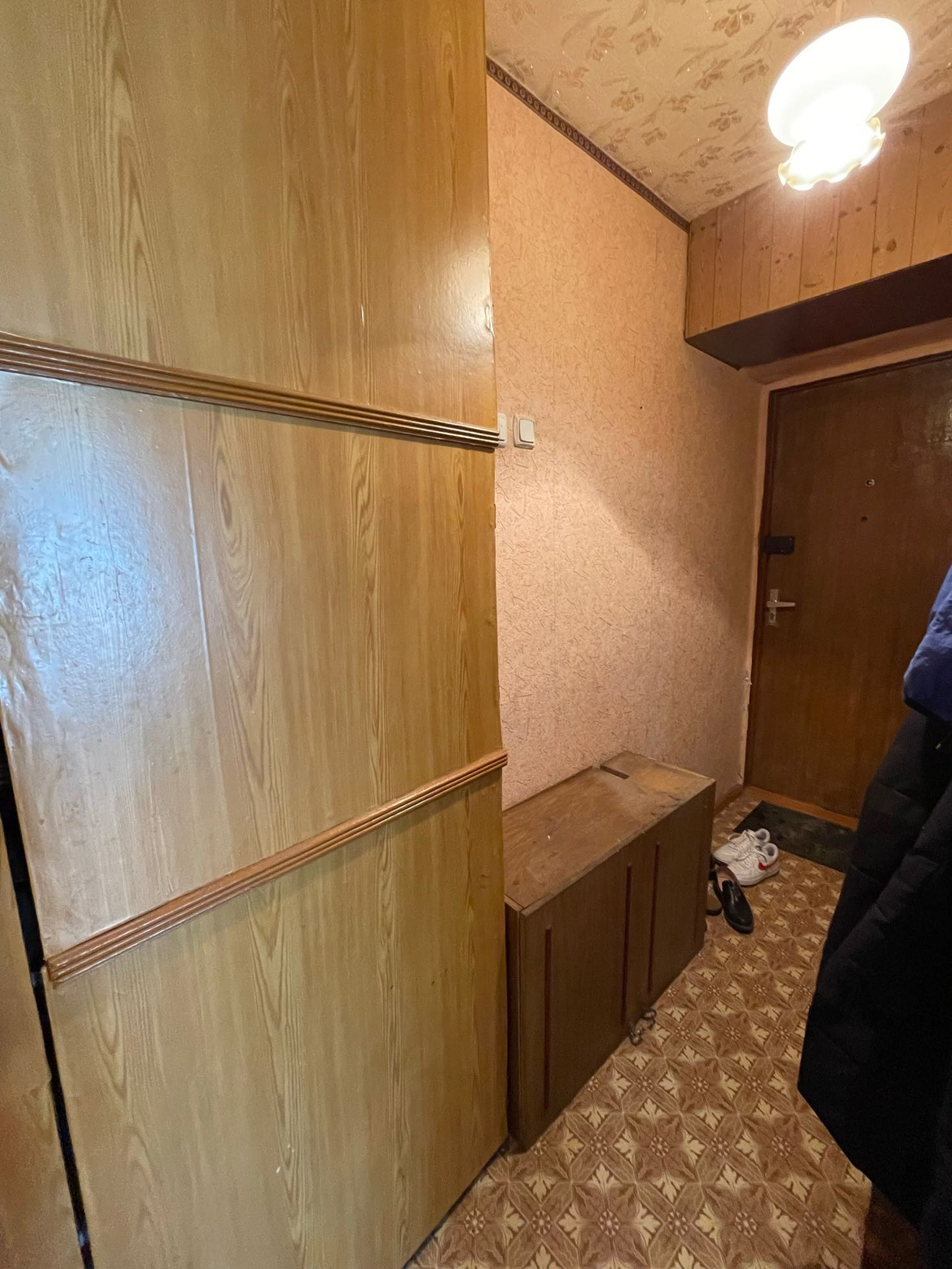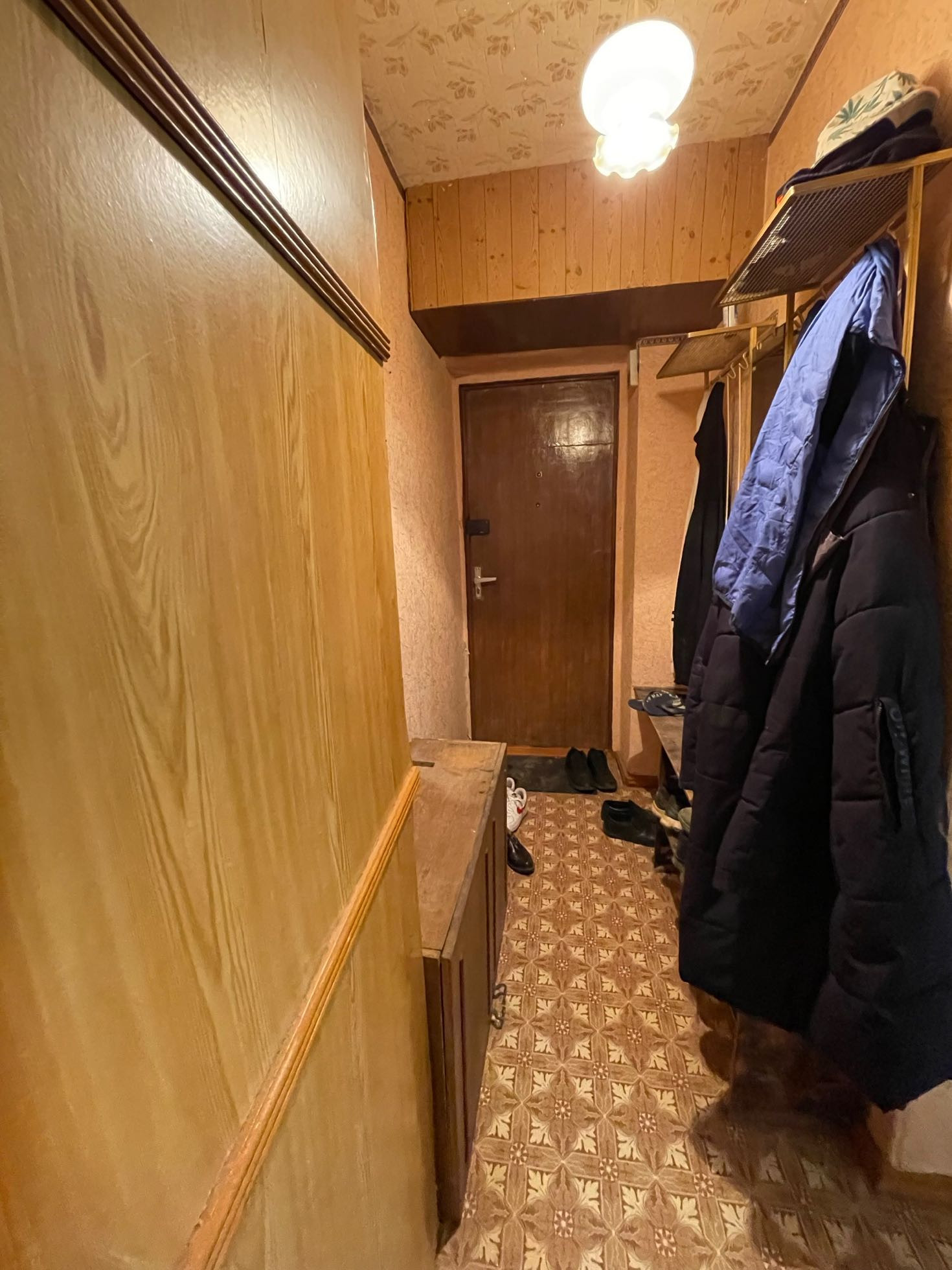 В квартире установлены люстры для освещения комнат. Имеется кровать, несколько шкафов, столы и стулья.