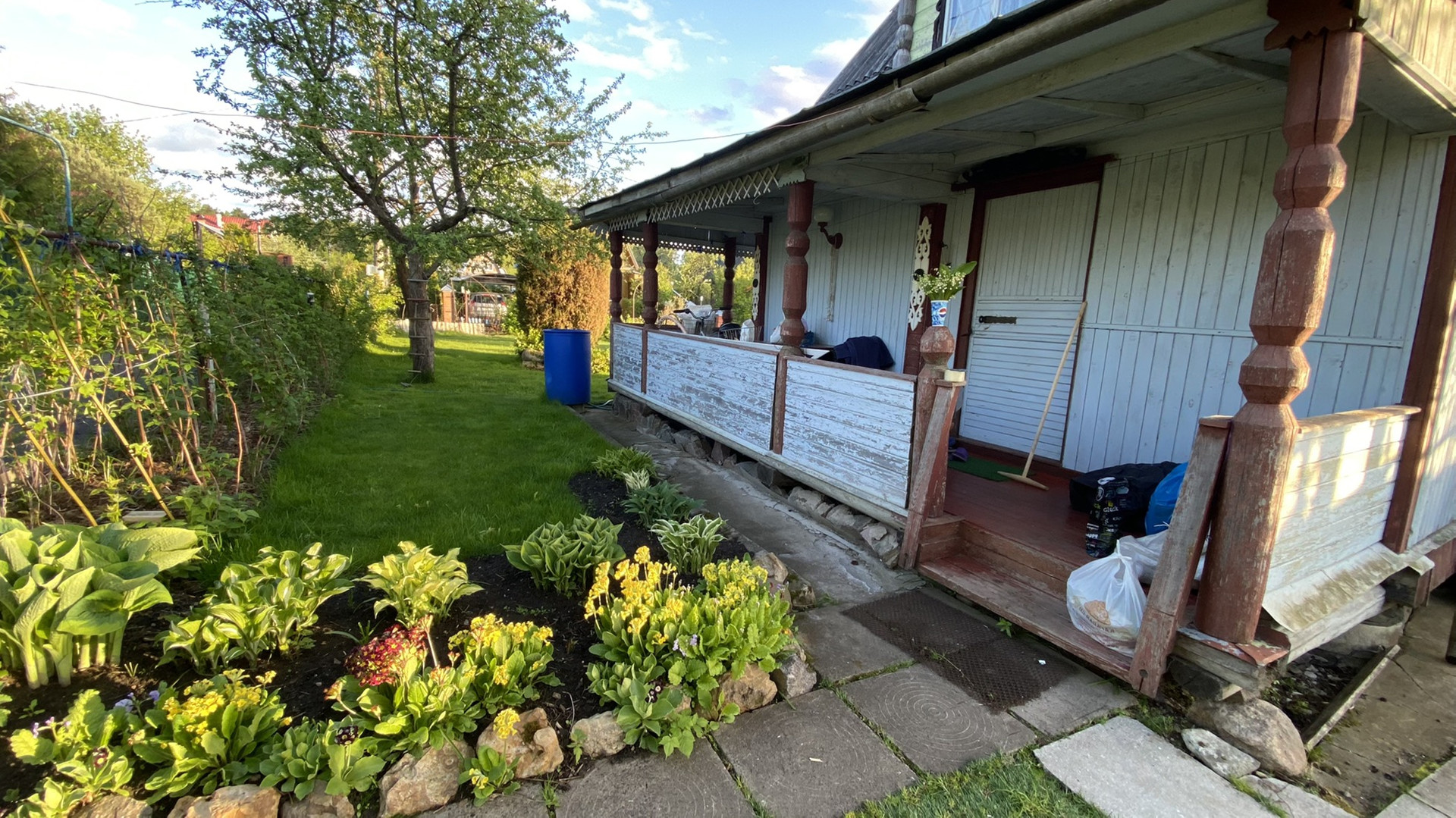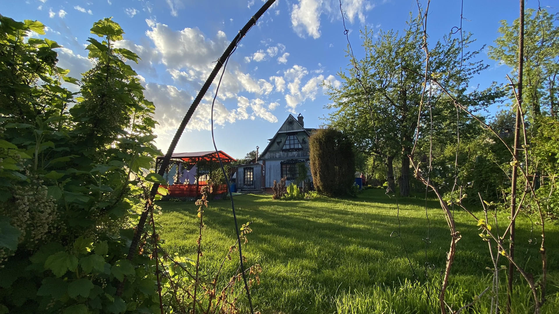 Территория участка и огорода полностью ухоженная, большая площадь газона, грядки, две теплицы (6 и 8 метров) из поликарбоната, много культурных насаждений с хорошим ежегодным урожаем. В теплицах и на отдельных грядках сделана подводка для капельного полива. От дороги участок отделен естественной изгородью из малины и плодовых деревьев. На участке имеется большая затененная беседка со стационарным столом и лавками на компанию 10-14 чел.