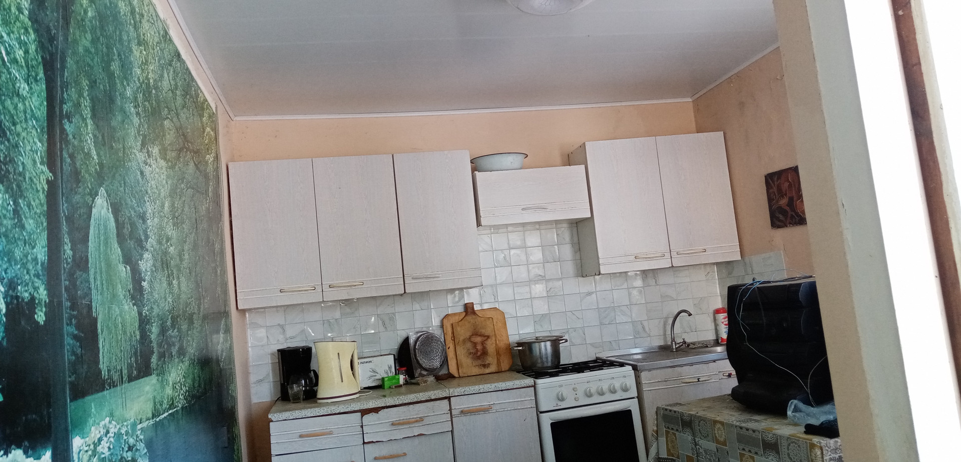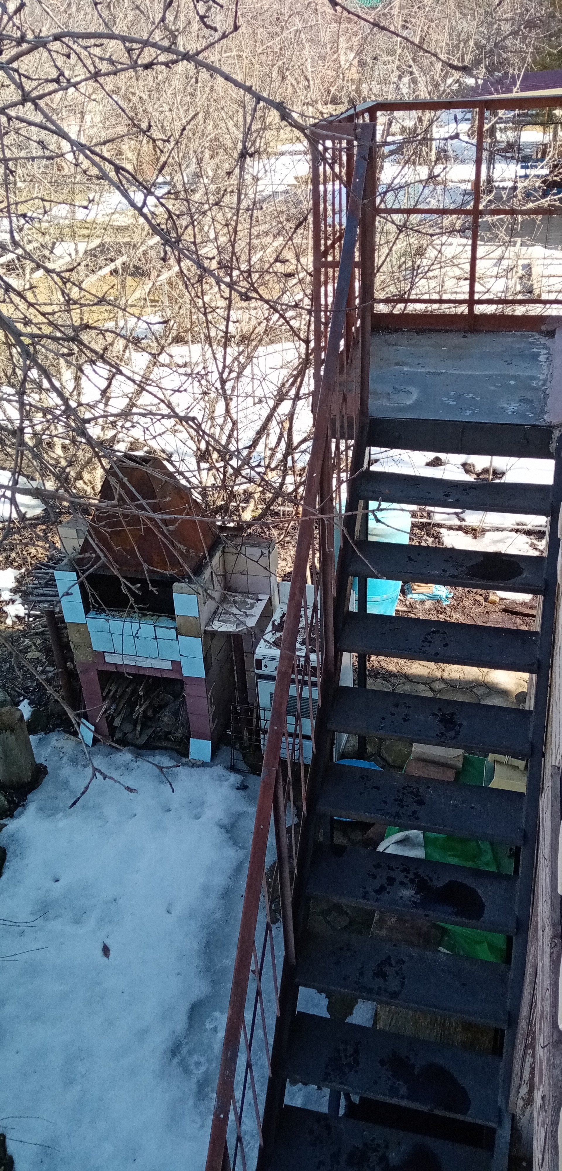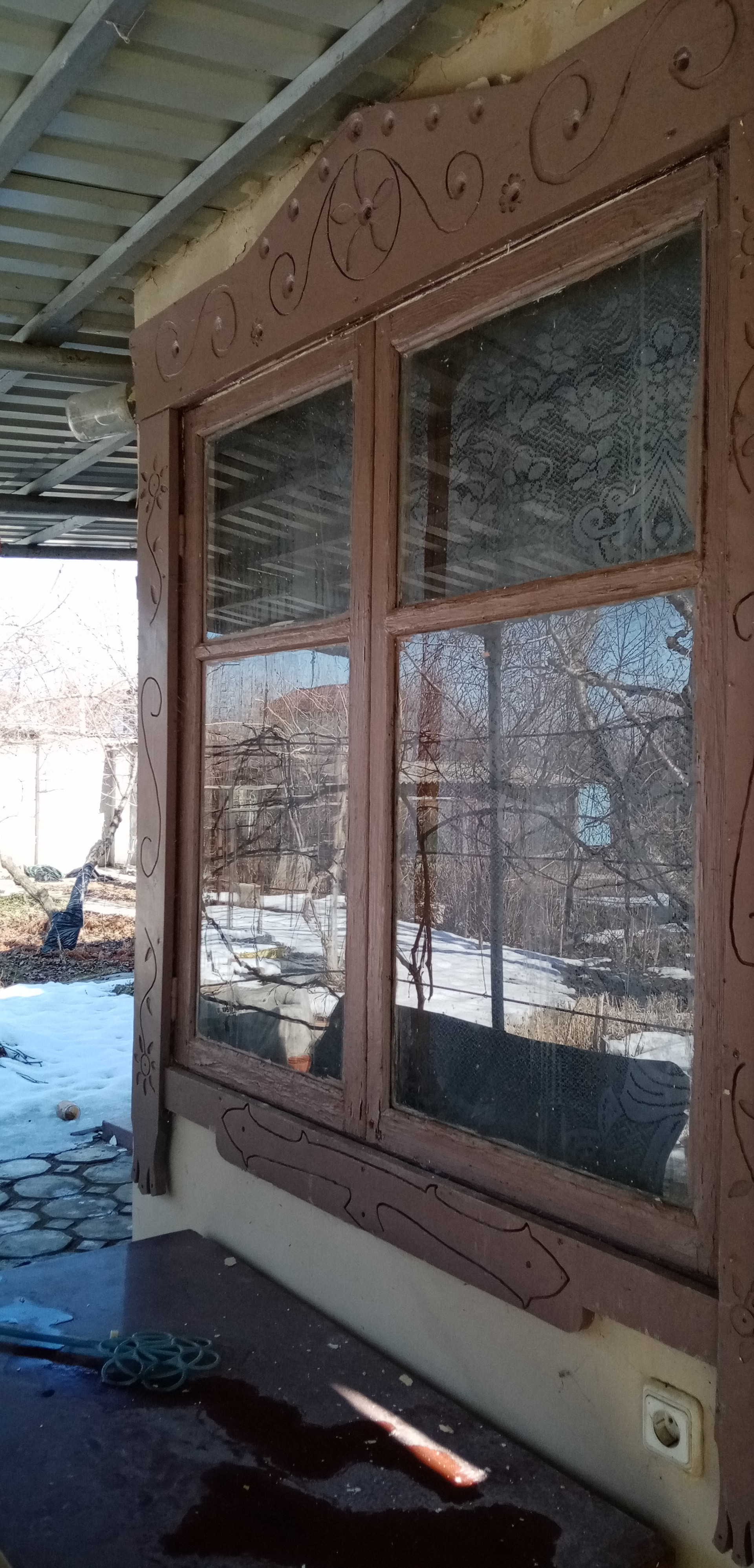 1й этаж- комната 18м2, кухня 13 м2, гараж 18 м2, перед входом в дом - беседка, обвита виноградом -21м2.
