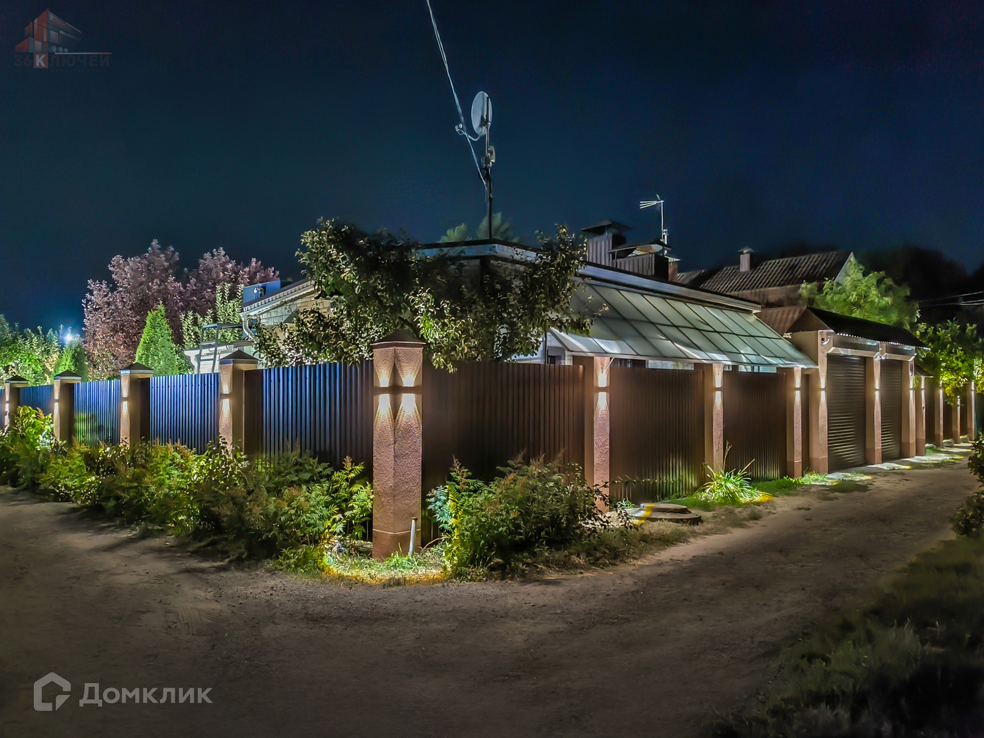 Высокий забор с кирпичными столбами с отделкой под короед, зашитый проф. листом и подсветкой.