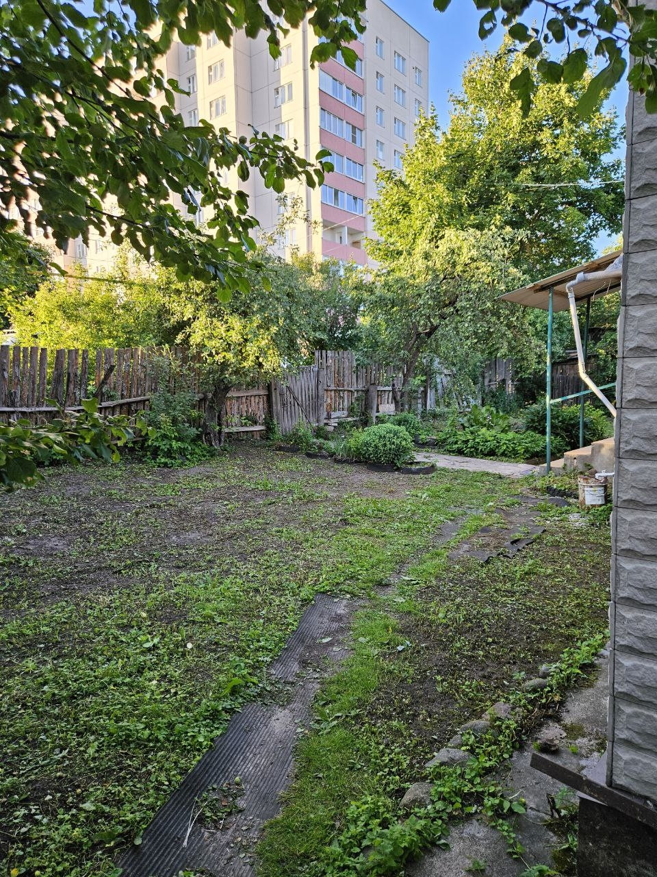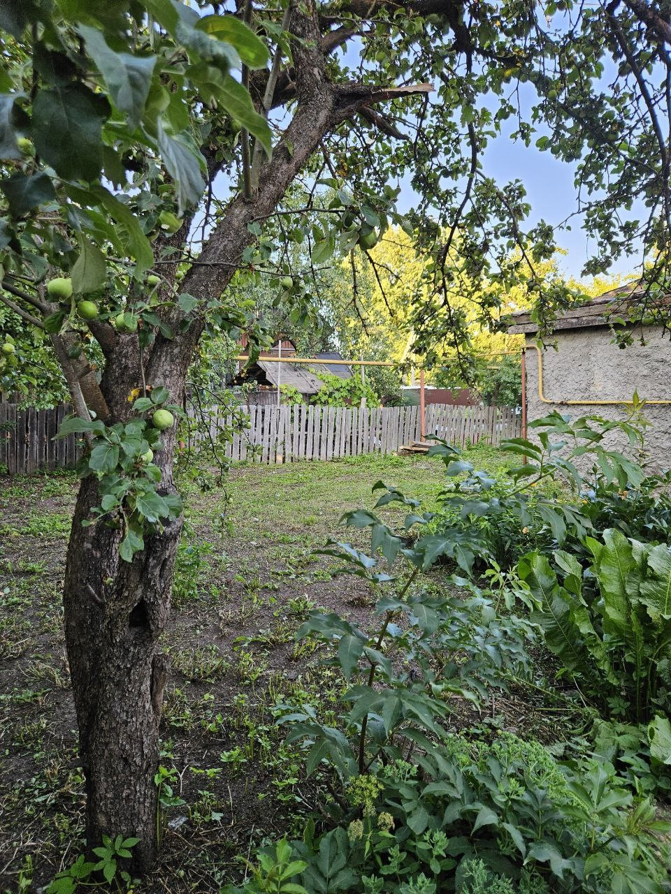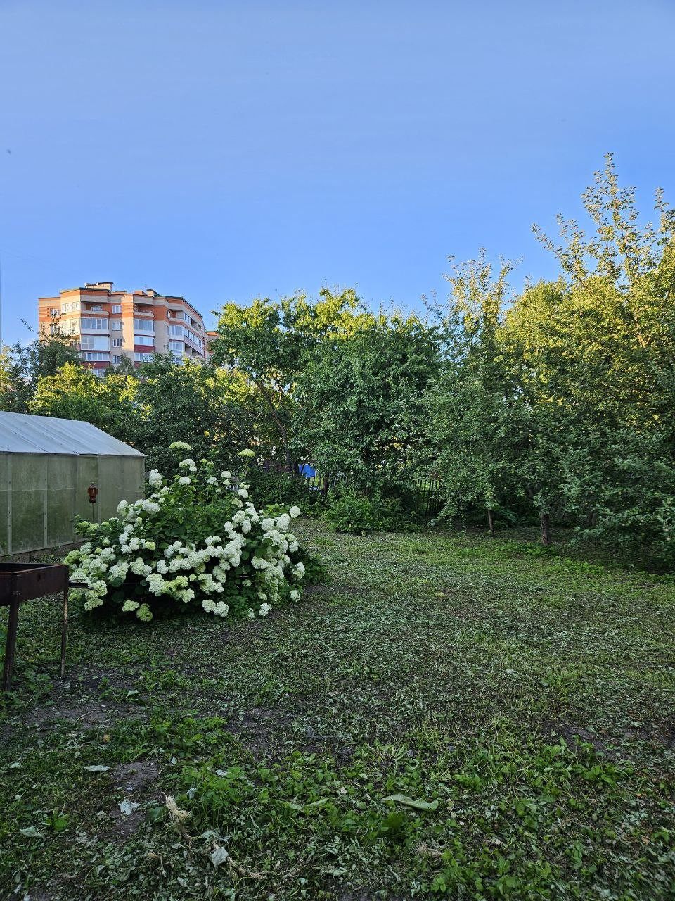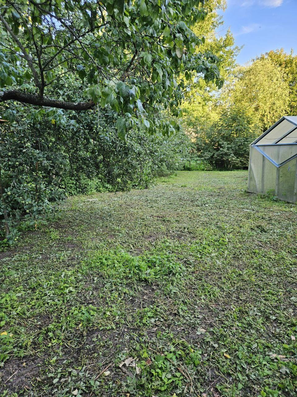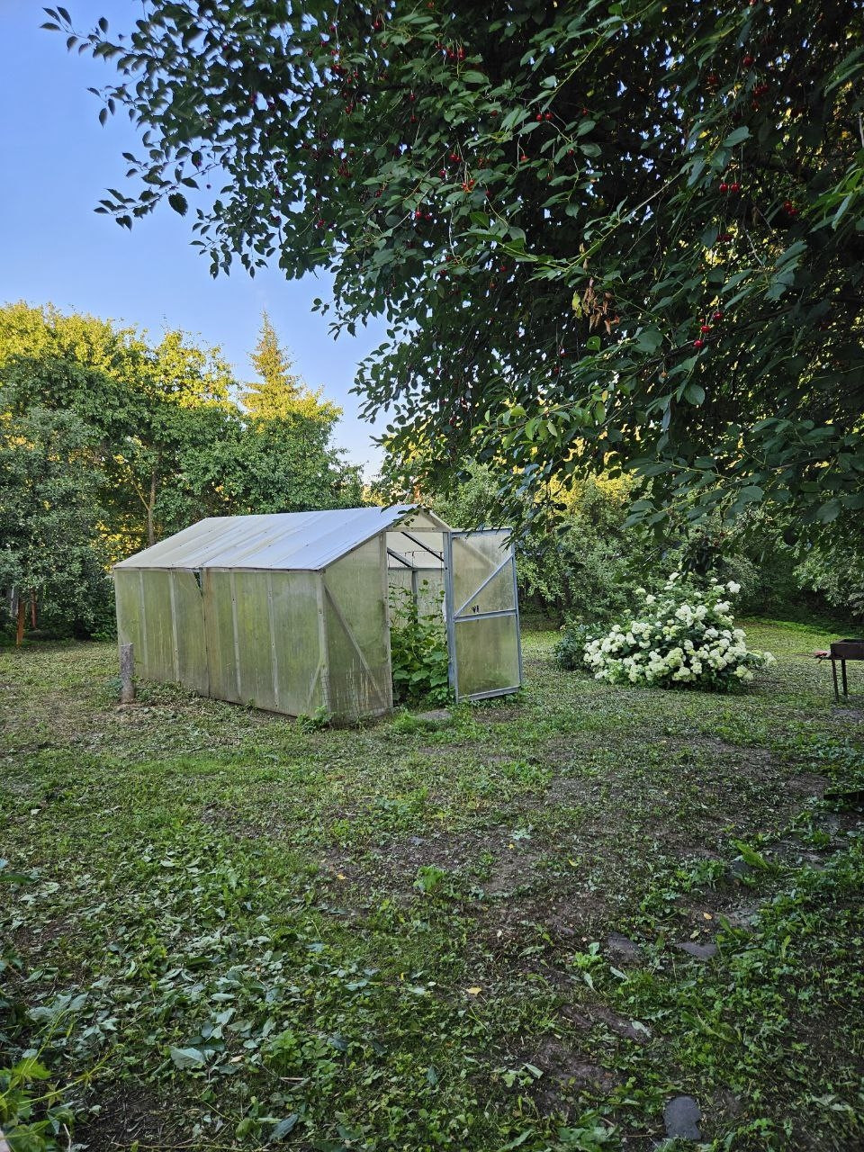 На участке плодово-ягодные деревья, теплица.