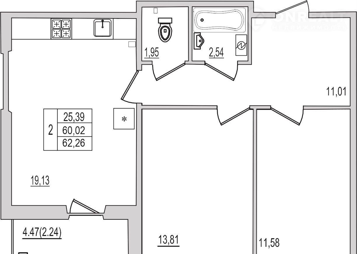 Общая площадь 62.3 м2