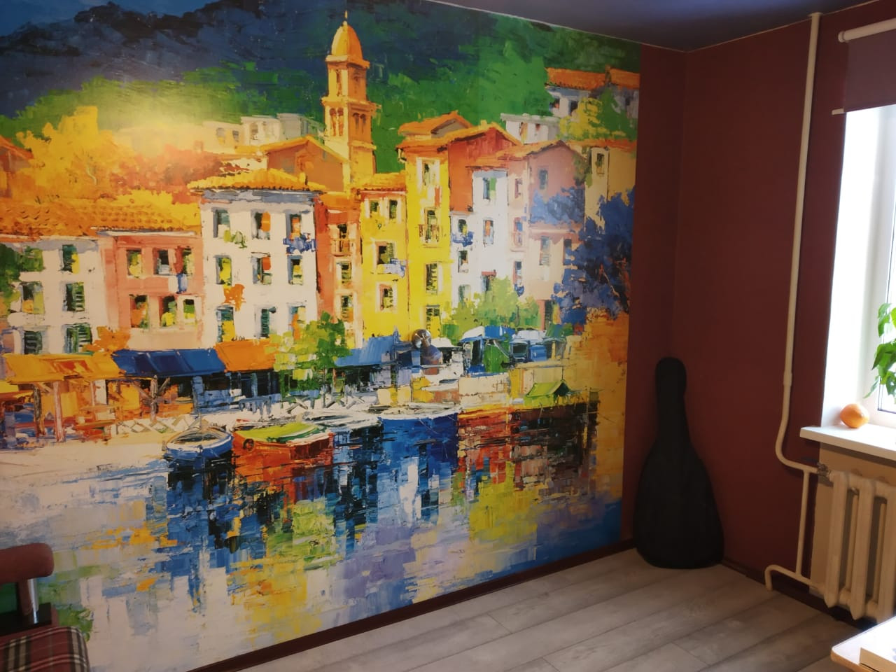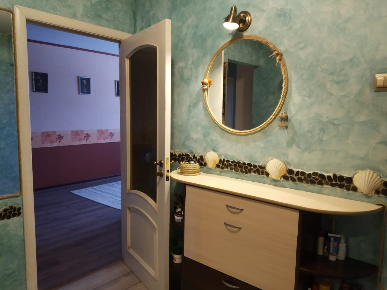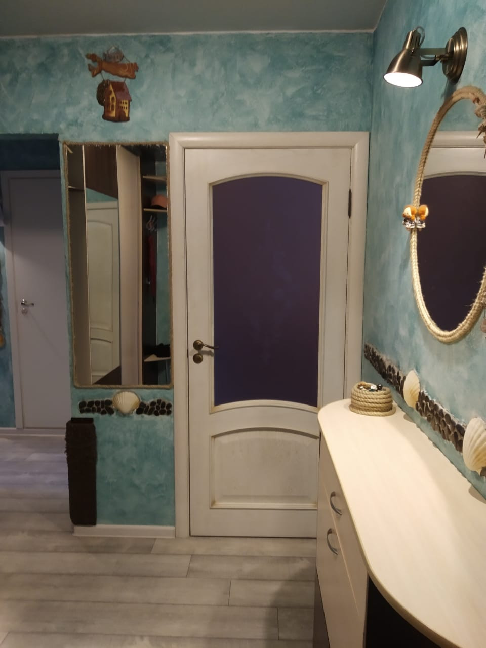 На стенах кухни, прихожей и коридора- декоративная штукатурка с инсталяцией из натурального камня и норвежских гребешков. На всех окнах двухкамерные стеклопакеты.