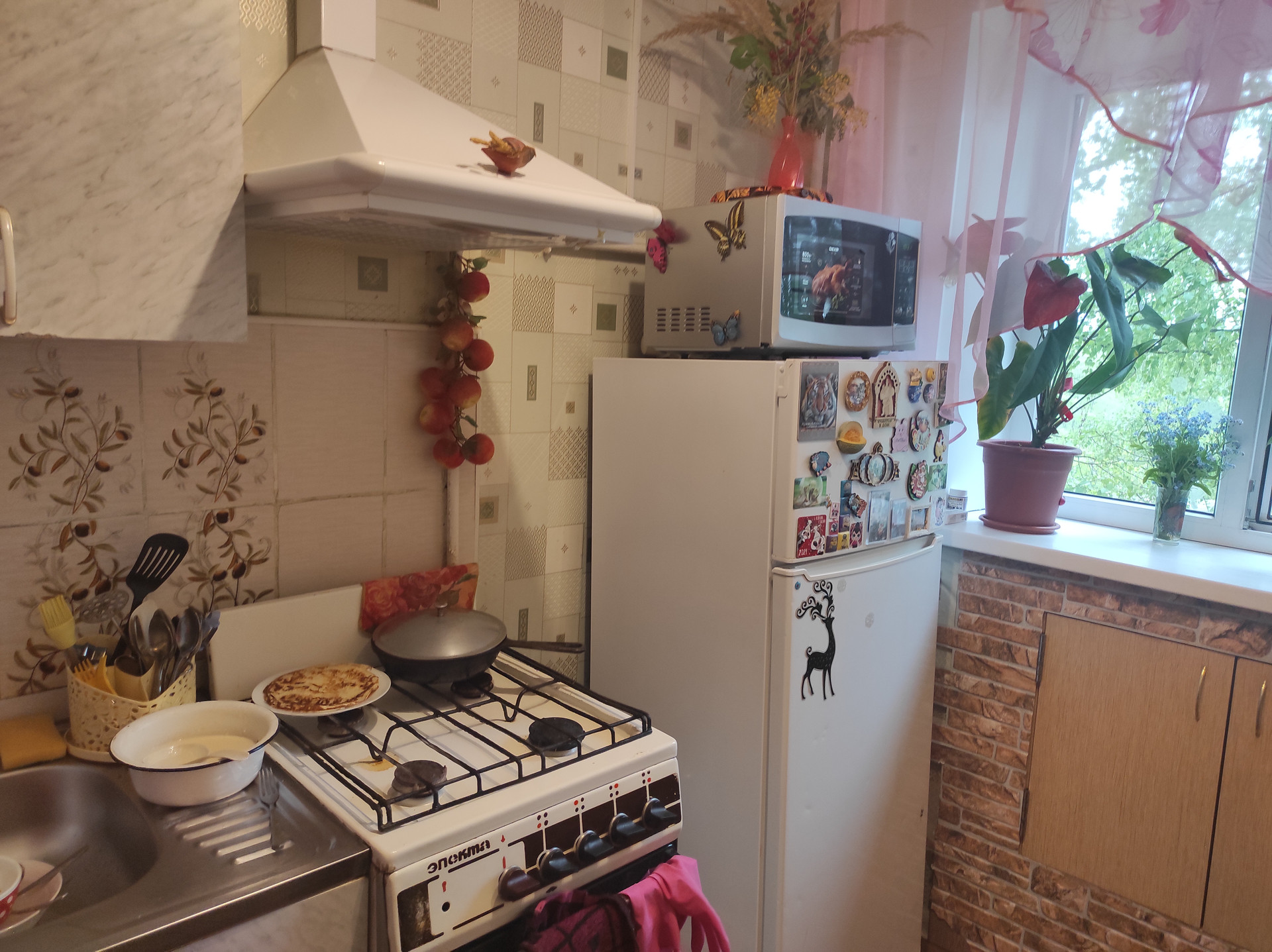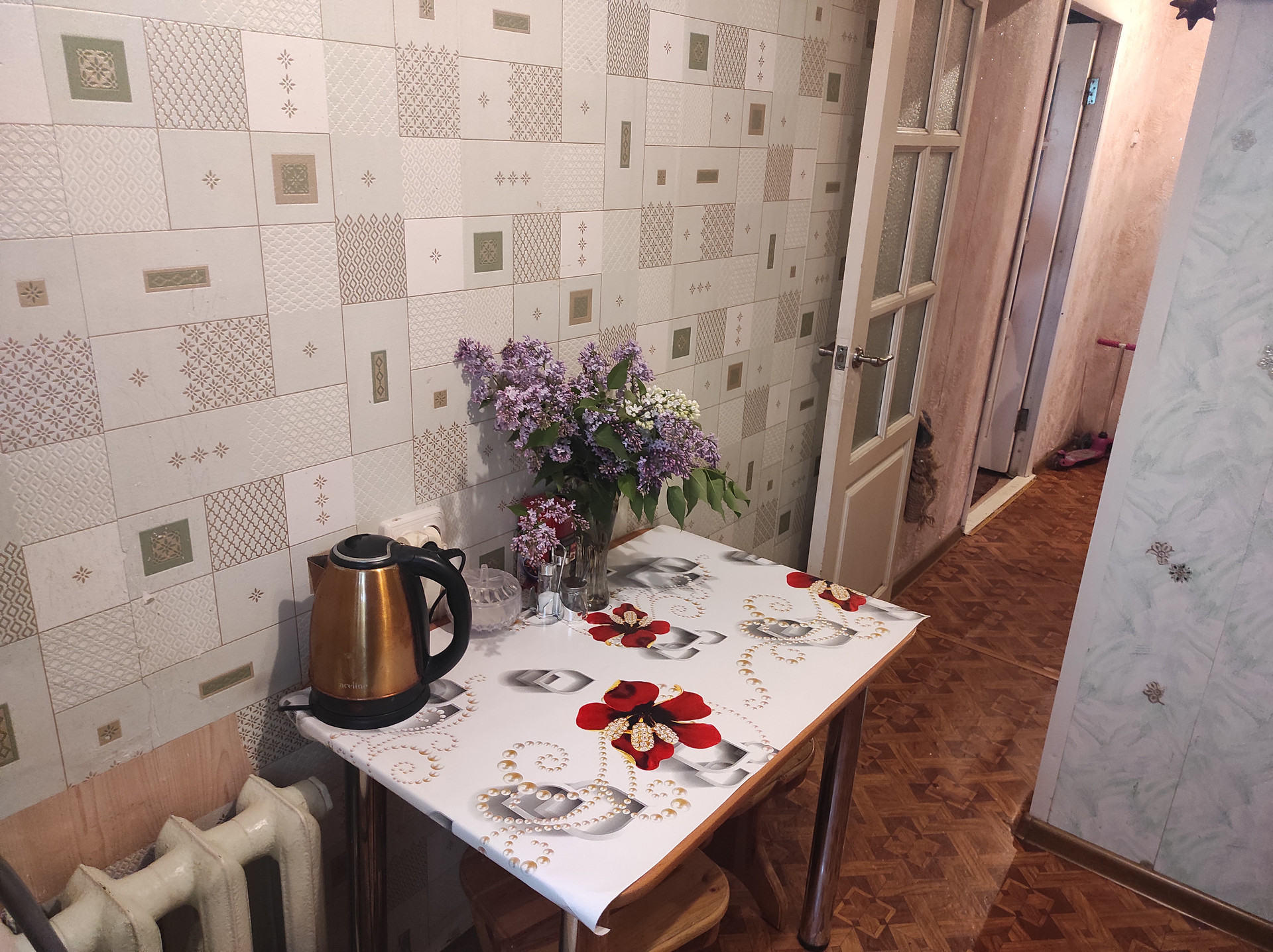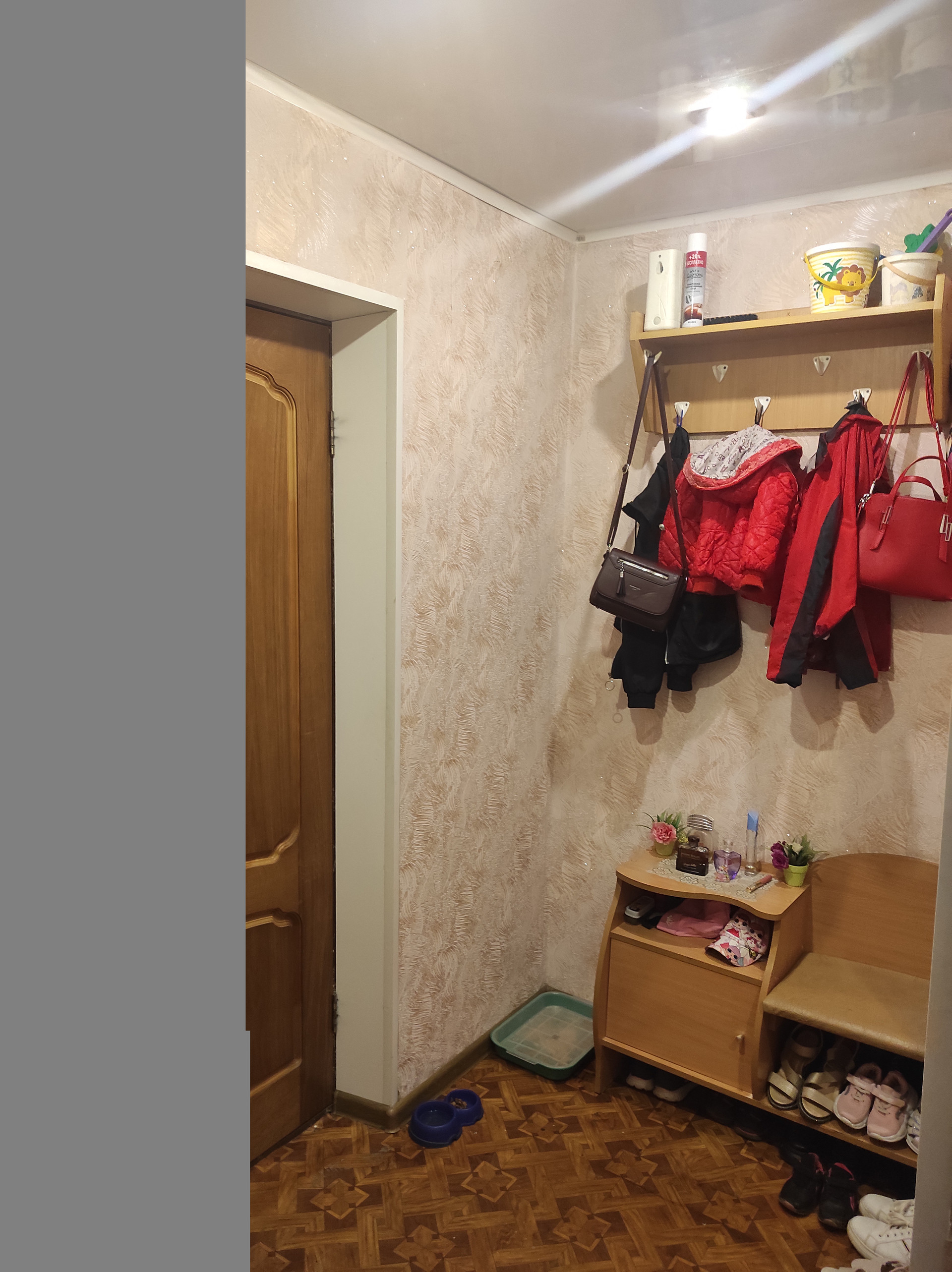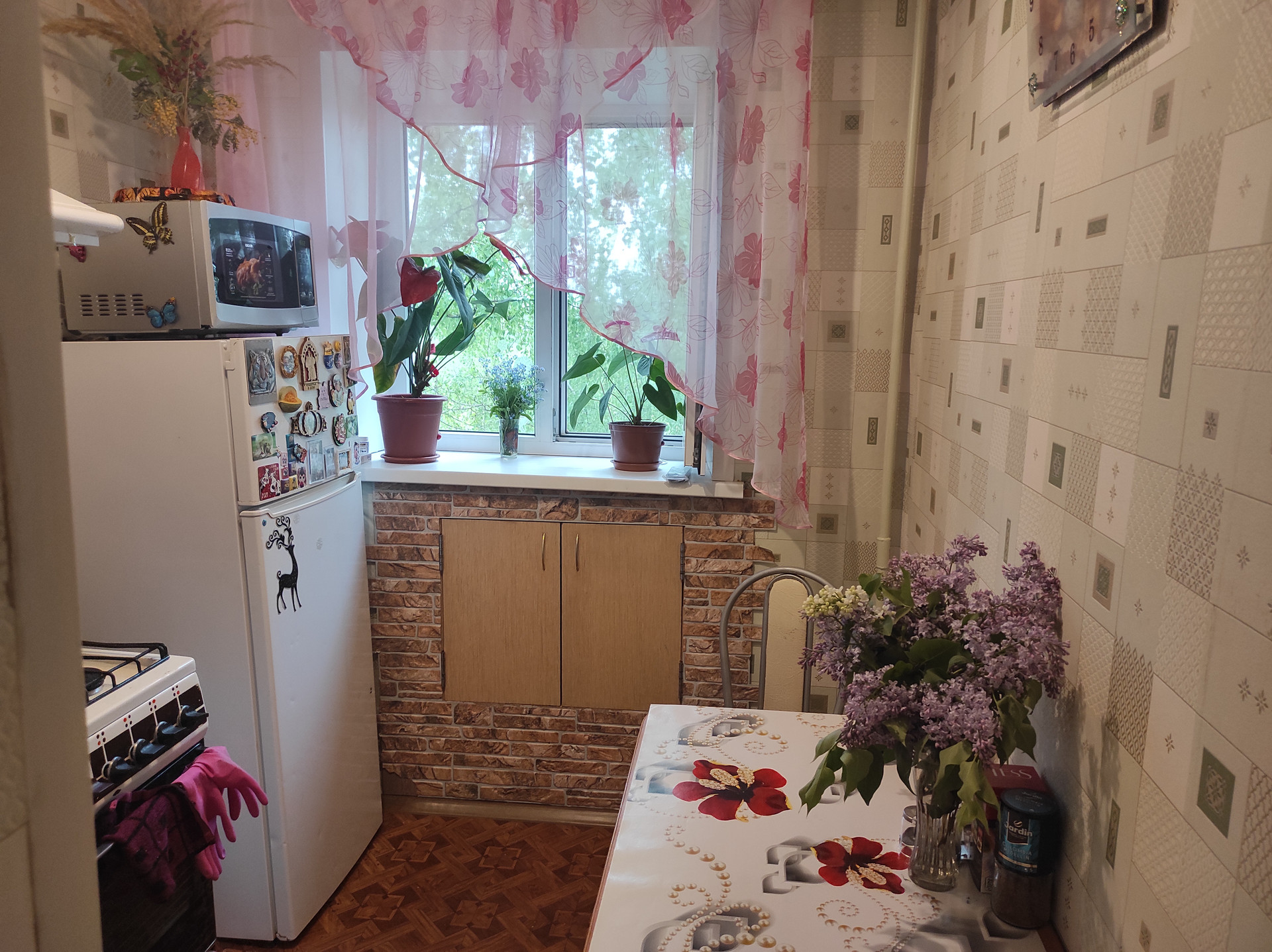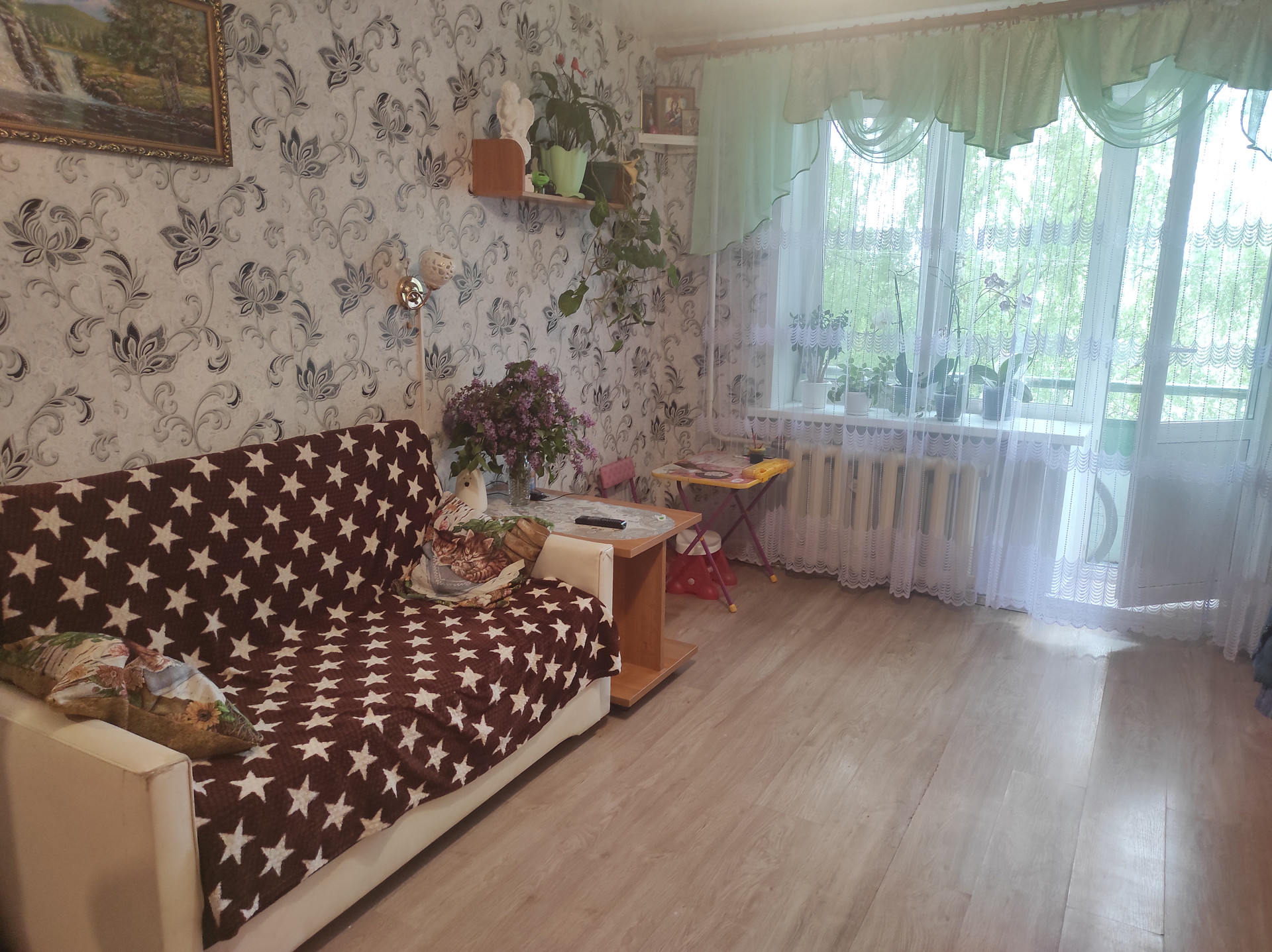 В квартире хороший ремонт, санузел в кафеле, потолки натяжные. Окна стеклопакеты, есть балкон. И мебели  остаётся хорошая большая стенка, кухонный гарнитур.