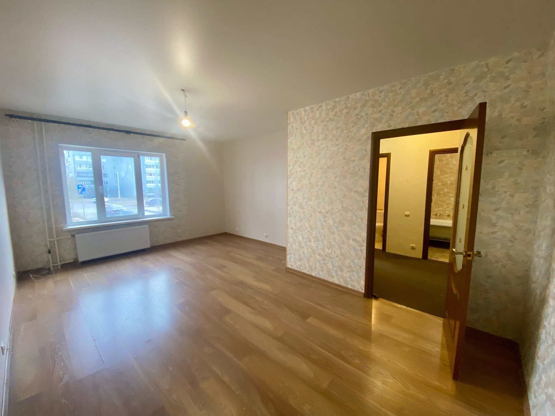 Тёплая, светлая квартира нестандартной планировки. Комната больше 20кв.м - прекрасная возможность разделения на разные зоны. На полу постелен ламинат. Кухня почти 8 кв.м, электрический "тёплый пол", кафель. Везде окна ПВХ. Имеется застеклённый балкон, с выходом из кухни. Санузлы раздельные, большие по площади, кафель.