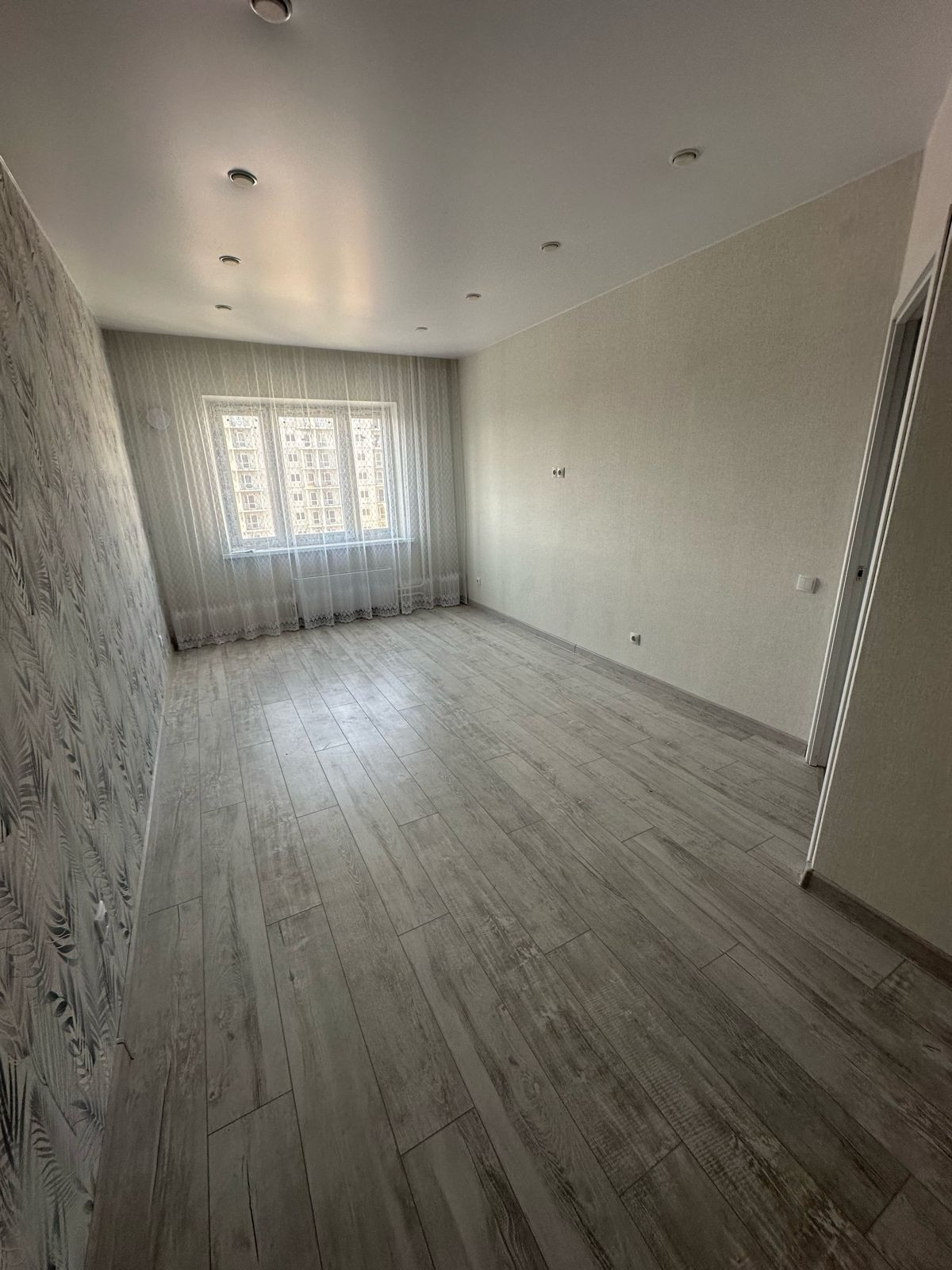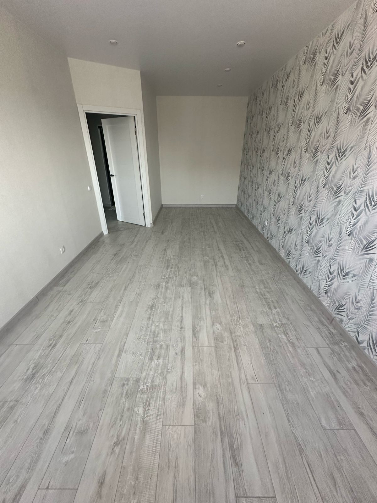 Стены - обои, пол - ламинат и плитка, по всей квартире натяжные потолки, установлены межкомнатные двери, сан. техника, встроенный кухонный гарнитур.