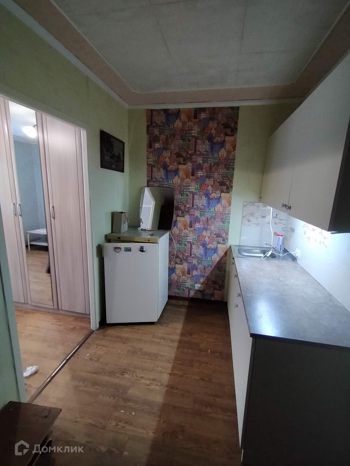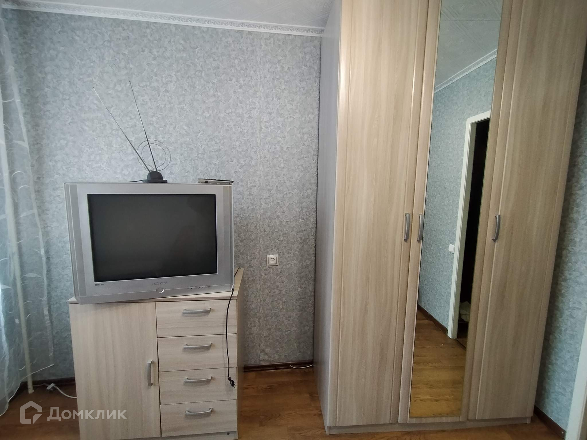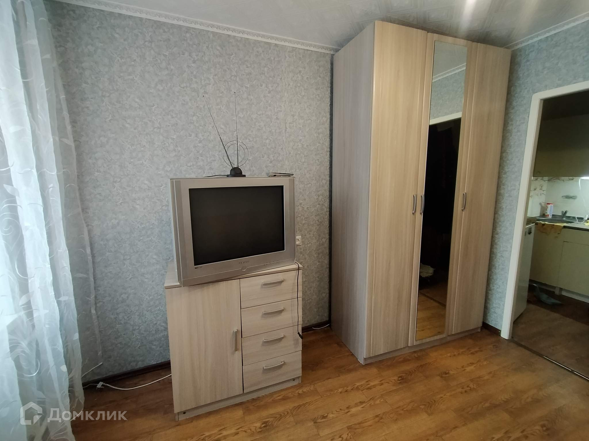 В комнате вся необходимая мебель и техника. Нет только стиральной машинки. Выделена зона кухни и прихожая.