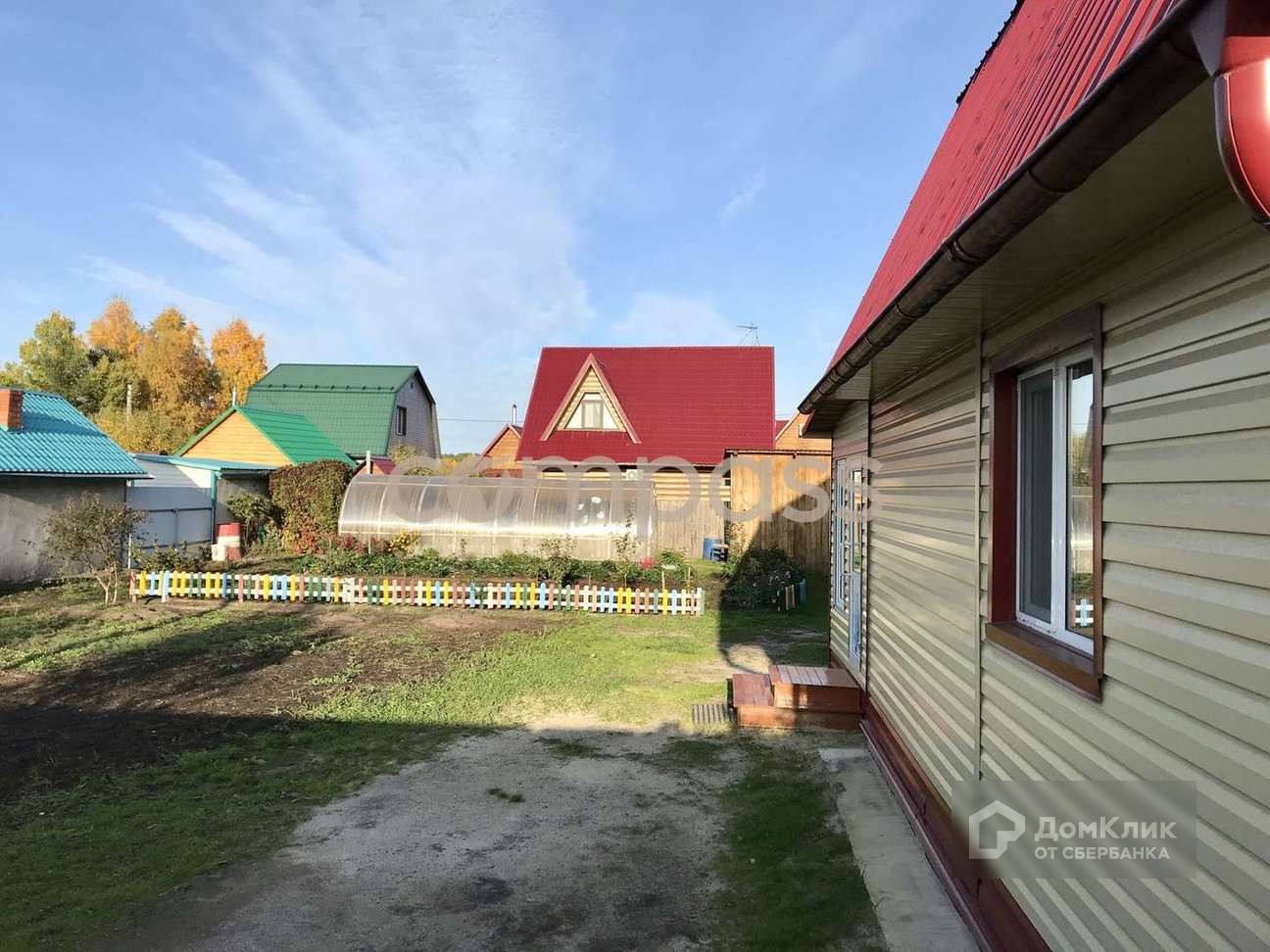 Участок 6 соток, про периметру огорожен высоким забором из профнастила с калиткой и распашными воротами для заезда автомобиля. Из надземных сооружений так же есть хорошая жаркая, чистая баня, теплица и беседка, уличный туалет. Участок разработан под небольшое количество грядок и плодово-ягодные насаждения.