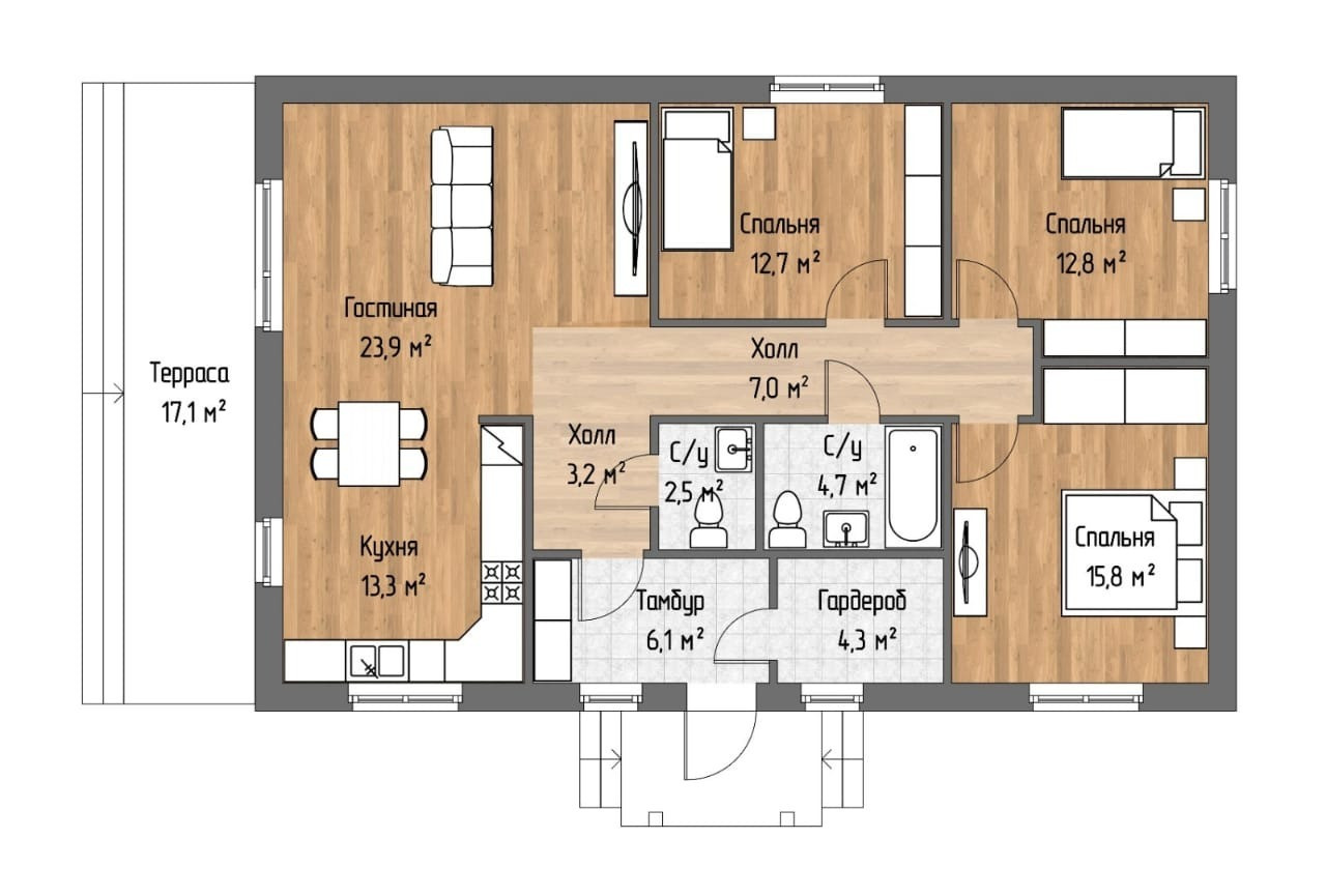 Общая площадь дома: 123.4 кв.м.