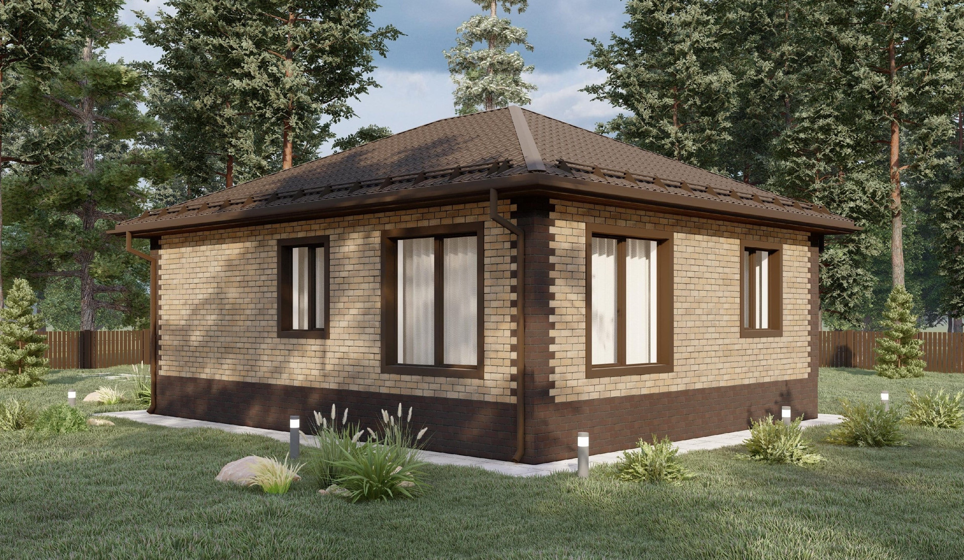 Этот проект классического одноэтажного дома однозначно универсален: он может быть возведён как загородный дом выходного дня так и в качестве дома для постоянного проживания. Планировка дома – простая, но в то же время очень удобная. На жилой площади в 64,66 м2 разместились кухня-гостиная, 3 весьма не маленьких спальни, сан. узел , ьех. помещение и  даже отдельная кладовая комната.