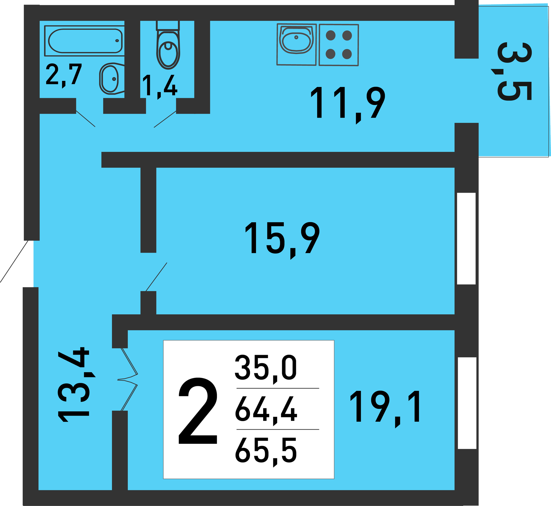 Общая площадь 64.4 м2