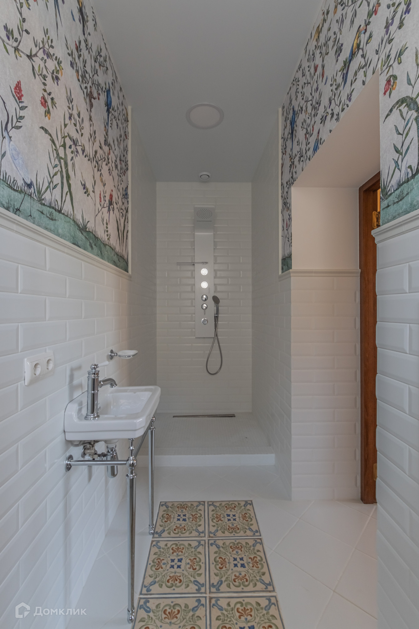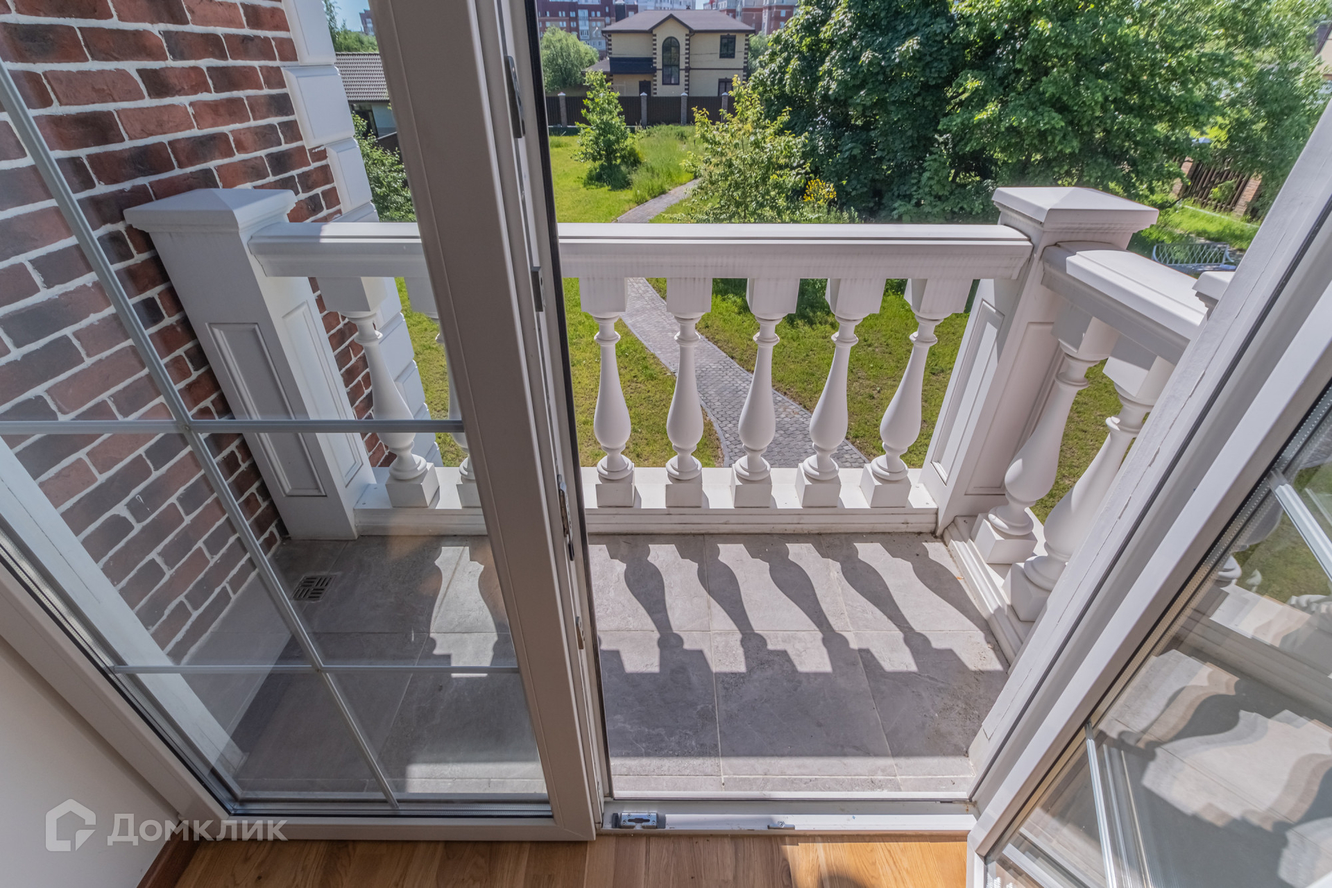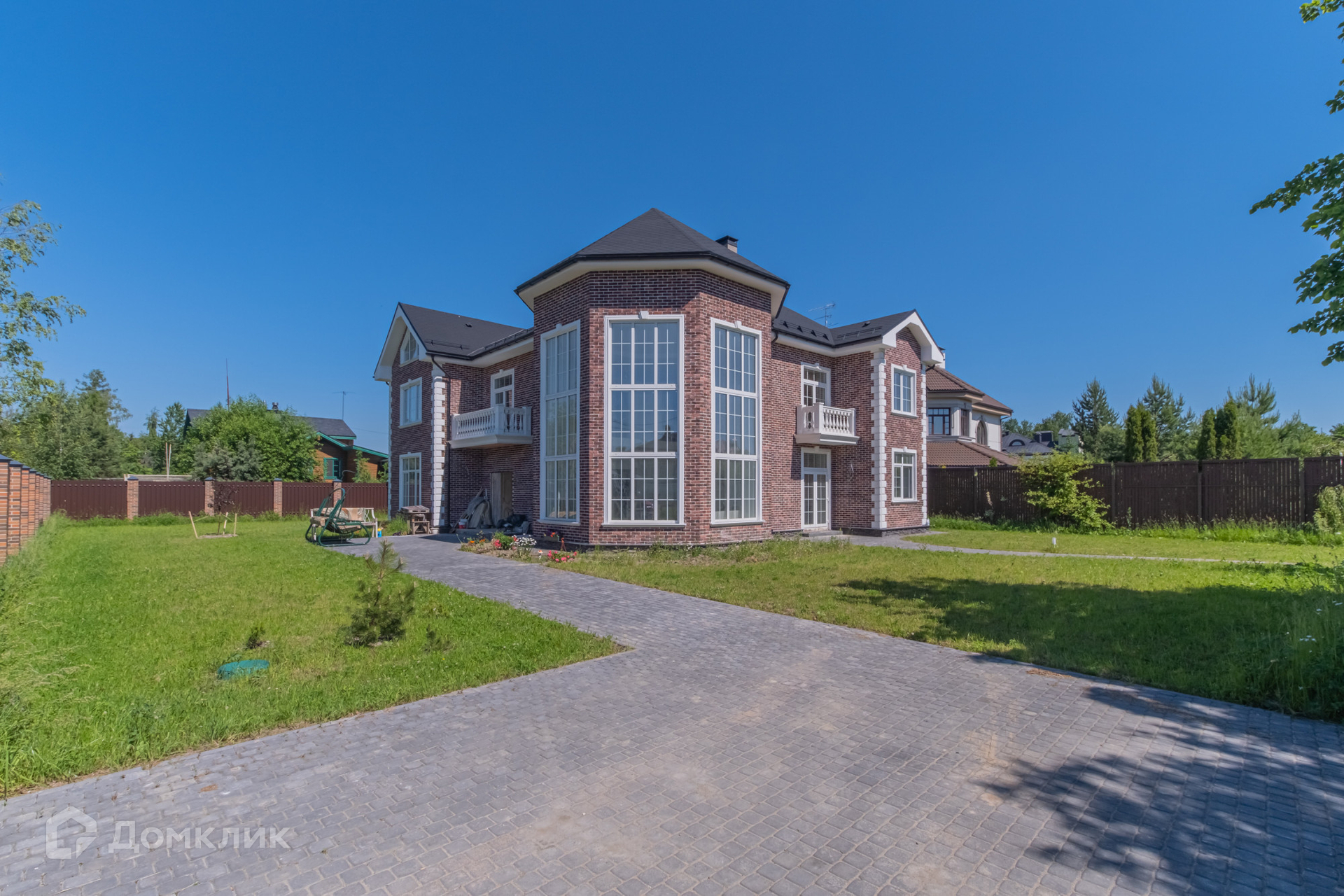 Площадь кирпичного коттеджа составляет 600 м². На первом этаже которого расположена кухня гостиная с панорамными окнами и вторым светом, точкой притяжения в гостиной является  камин, где можно любоваться живым огнем.
