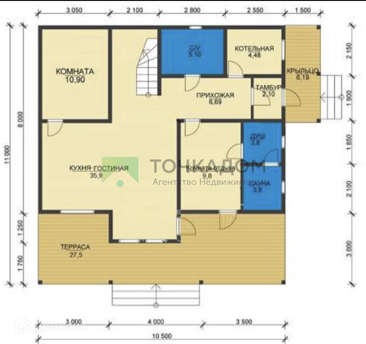 Общая площадь 195 кв.м, 2 этажа. Есть терраса.