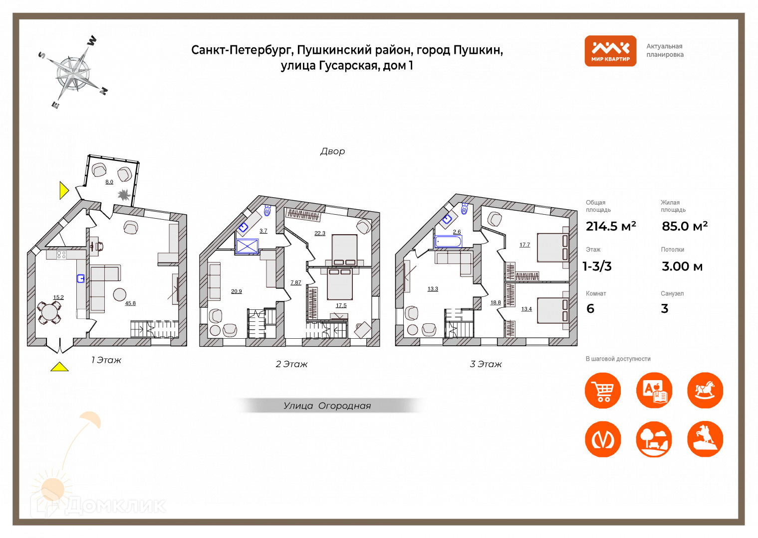Общая площадь 214м , 3 этажа, 6 спален.