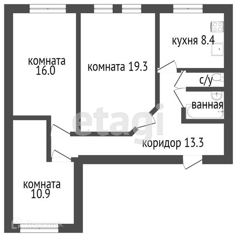 Комнаты раздельные, просторные: 19,3; 16,0; 10,9 м2.
