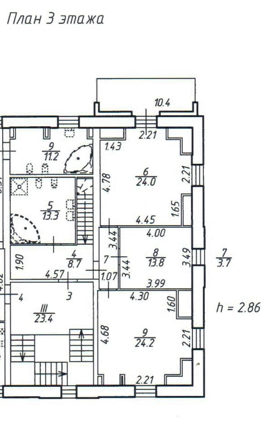 Планировка: три отдельные комнаты, кухня, объединенная с гостиной. 2 санузла. Потолки 3м на втором этаже и 2,86 на третьем.