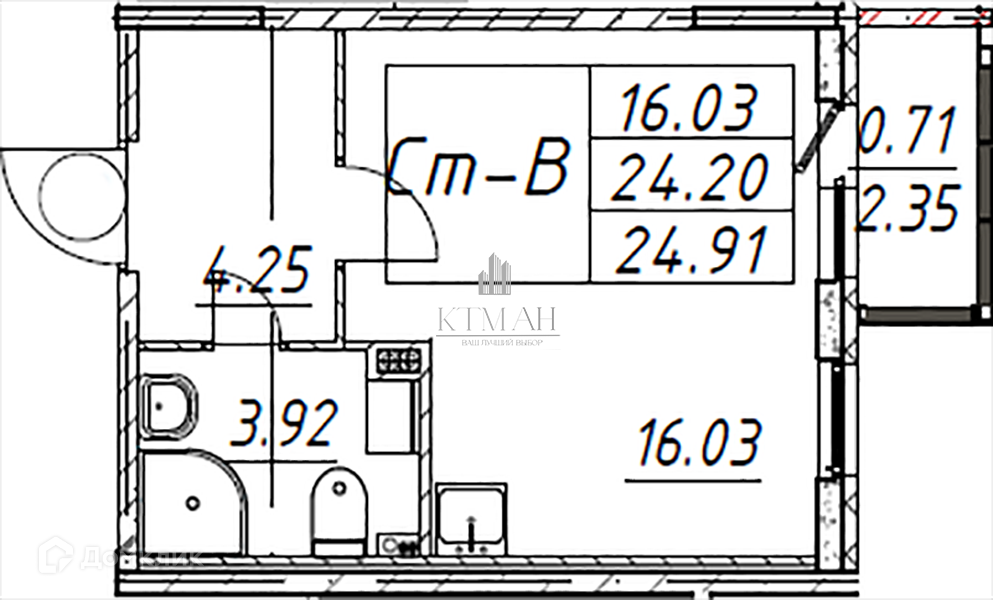 Общая площадь 24.2 кв.м ( без учета лоджии)