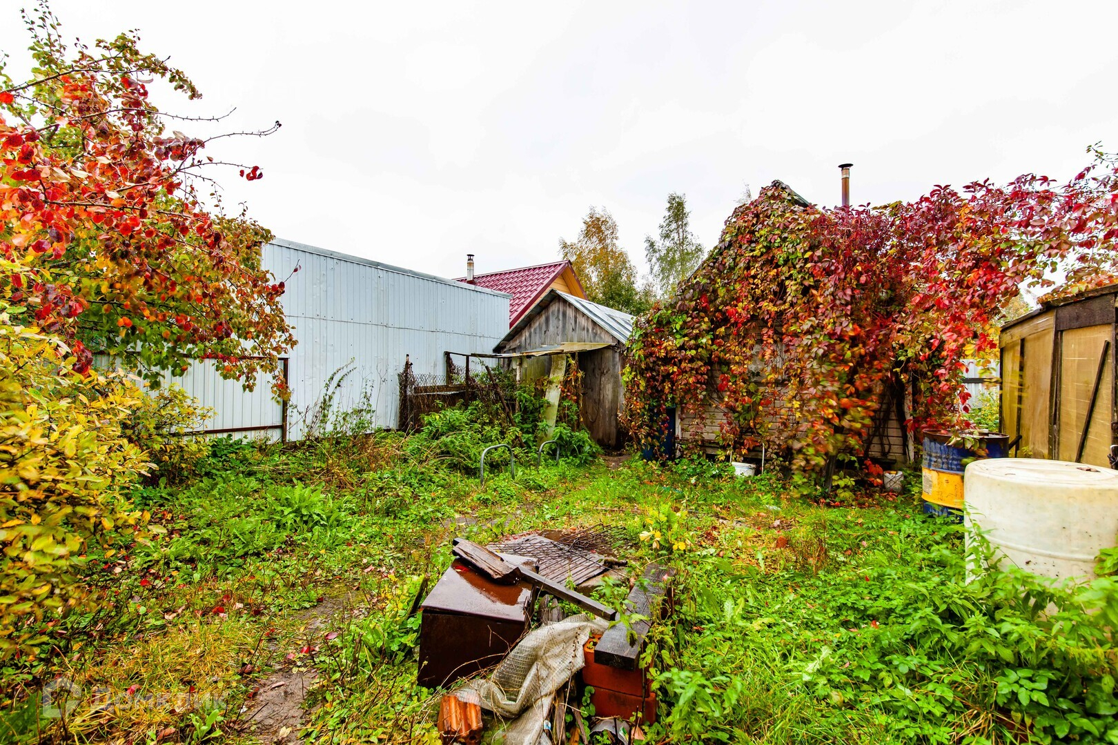 На территории участка расположен летний дом 20.3 кв.м. Древесная Баня 12 кв.м. Теплица 18 кв.м. Дровник и сарай для садовых принадлежностей.