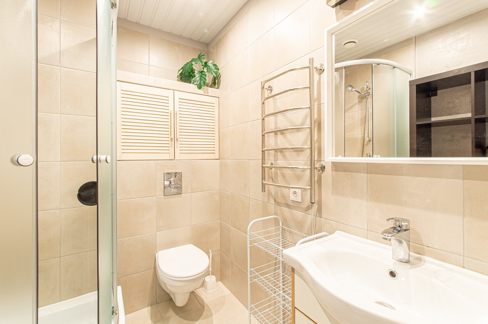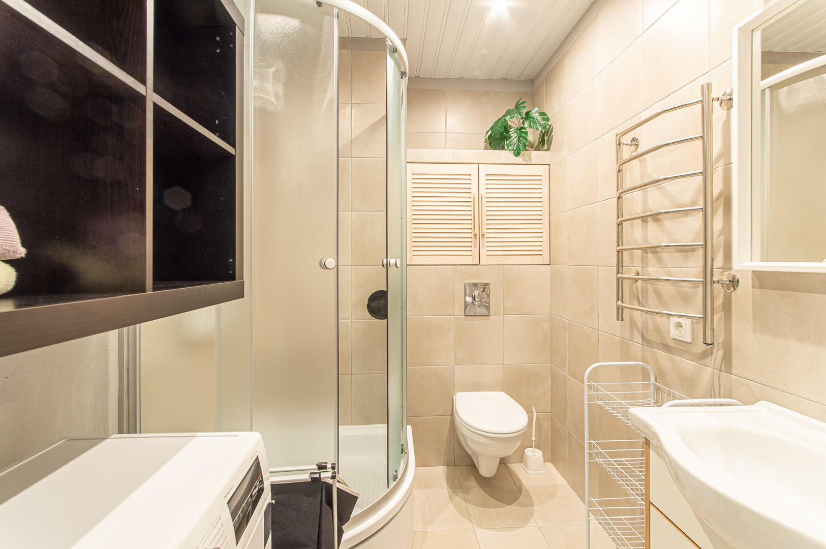 Ванная комната в кафельной плитке. Здесь установлена душевая кабина, зеркало с подсветкой, стиральная машина, полотенцесушитель.
