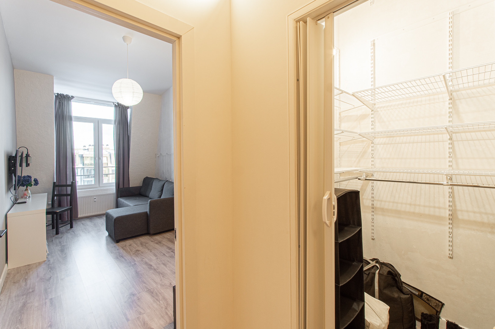 За сдвижной дверцей расположен очень вместительный многоуровневый гардероб с полочками и штангами.
