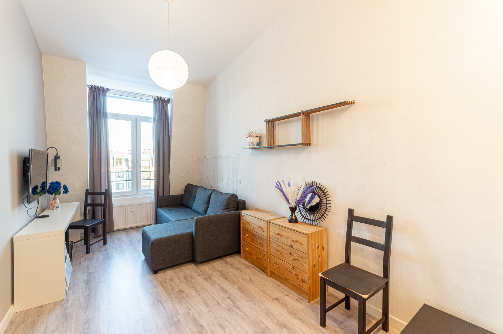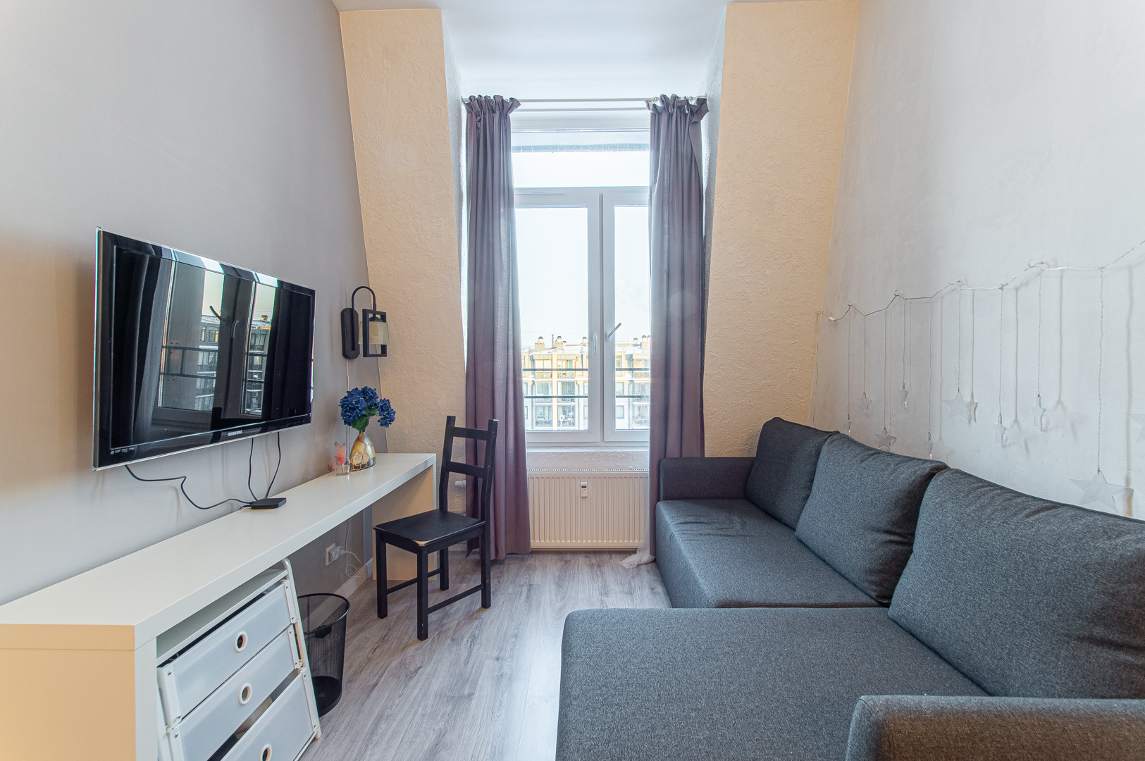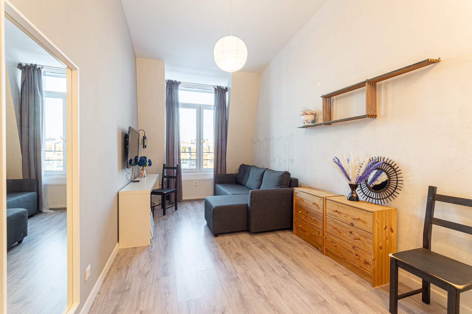 В жилой комнате расположен диван-кровать, прямо напротив рабочий стол и телевизор на кронштейне. Рядом есть вместительный комод, а также установлено зеркало в полный рост.