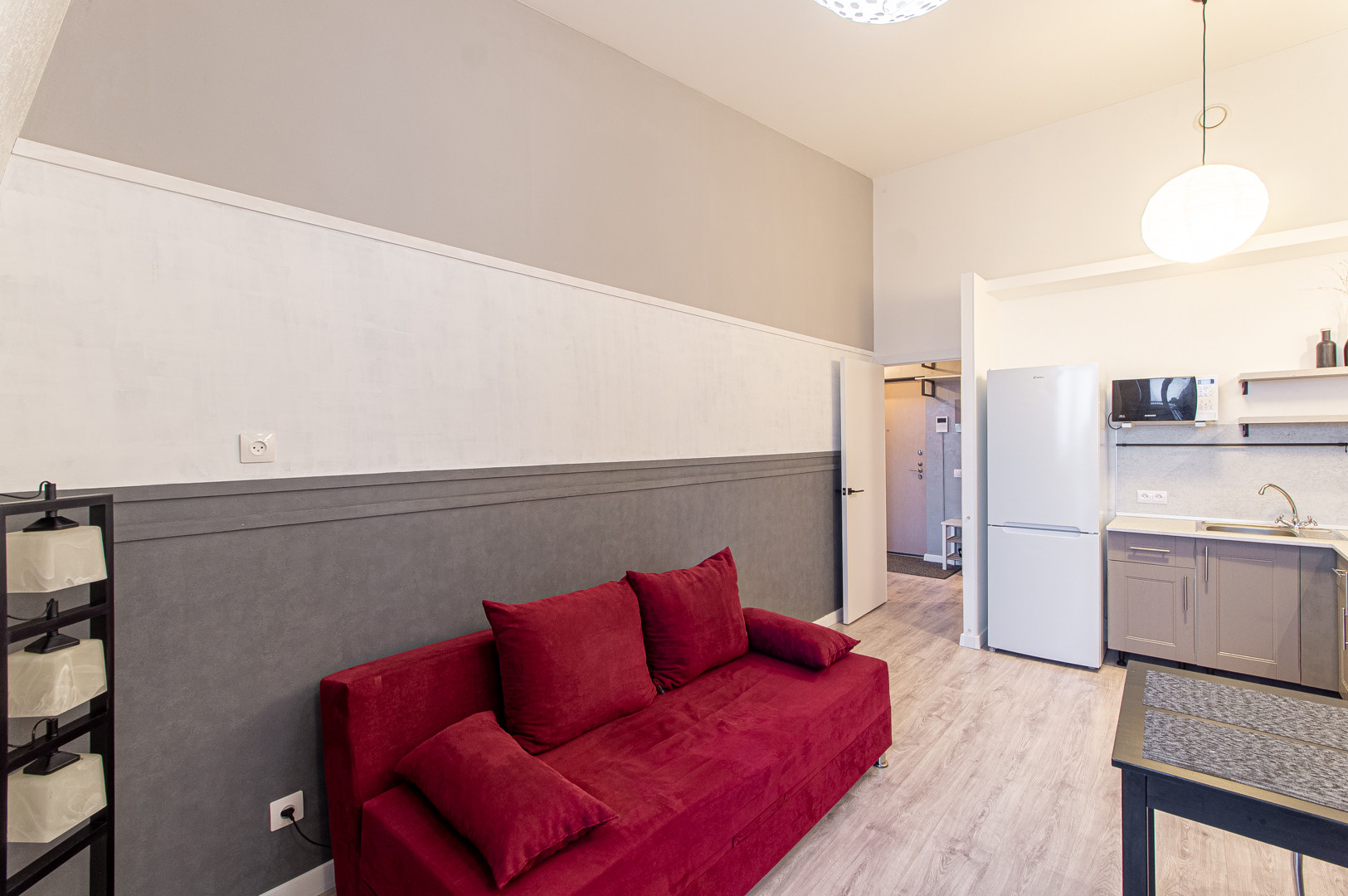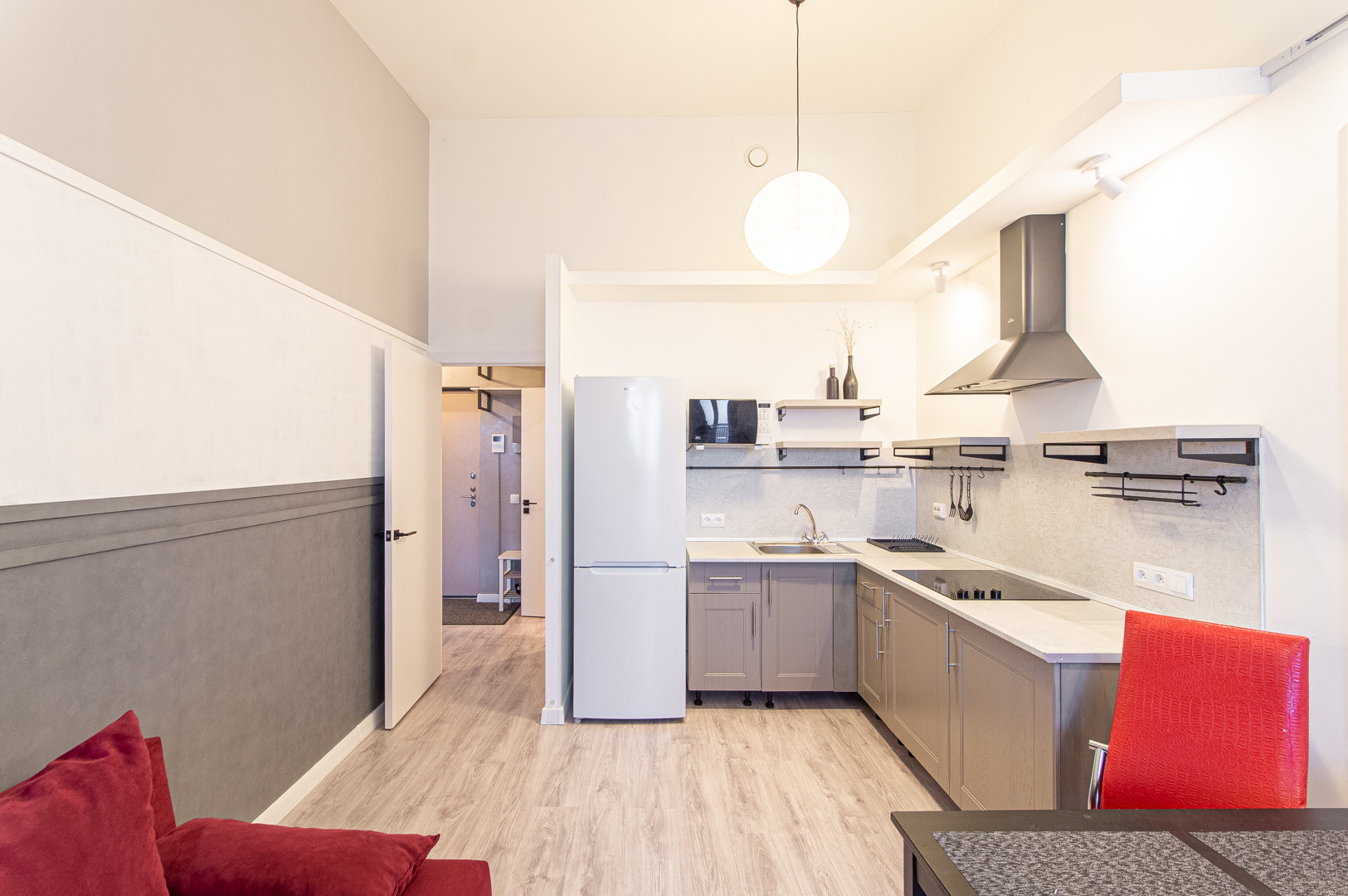 На кухне - угловой кухонный гарнитур, со встроенной варочной поверхностью, вытяжкой, микроволновкой, полноразмерным холодильником, а также обеденным столом со стульями. Диван, напольная лампа и стеллаж расположены у окна. Выход на застеклённый балкон - здесь же.