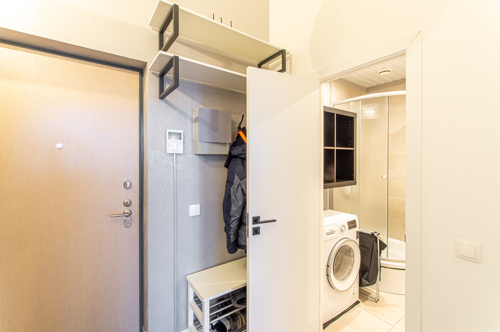 В коридоре - вешалки, полки и обувница, видеодомофон.