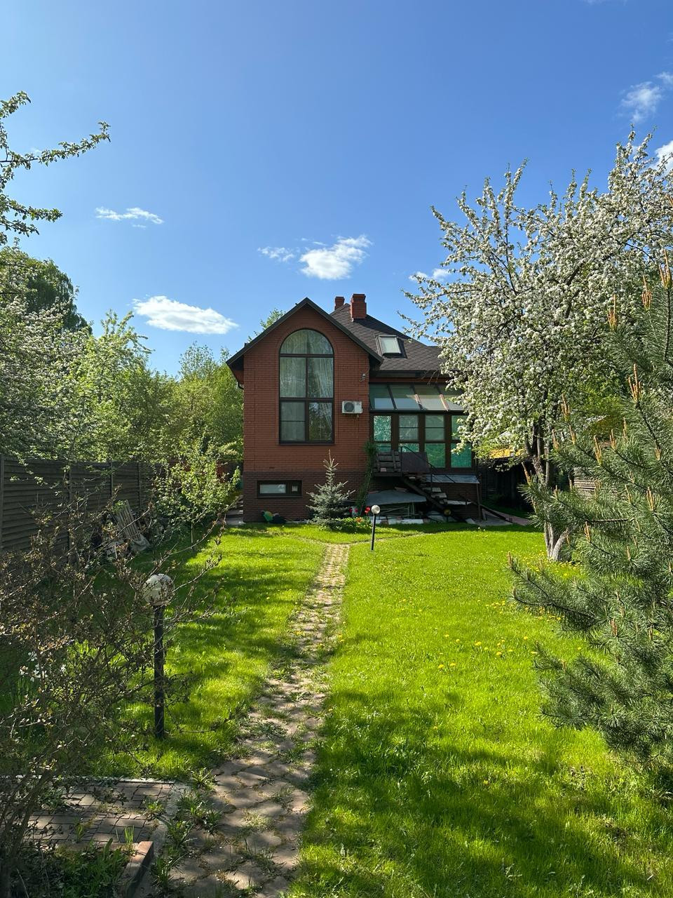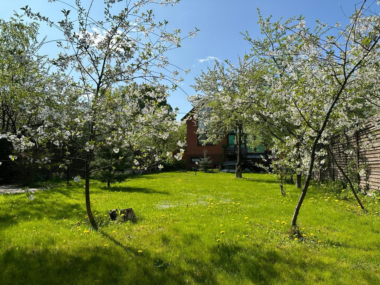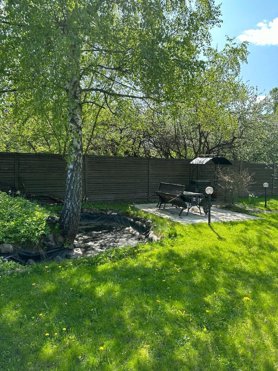 На участке, общей площадью 9,5 соток, расположился просторный двор с небольшим прудом, зона барбекю, вольер для собаки, плодовые и декоративные деревья, где вы сможете создавать незабываемые моменты с семьей и друзьями.