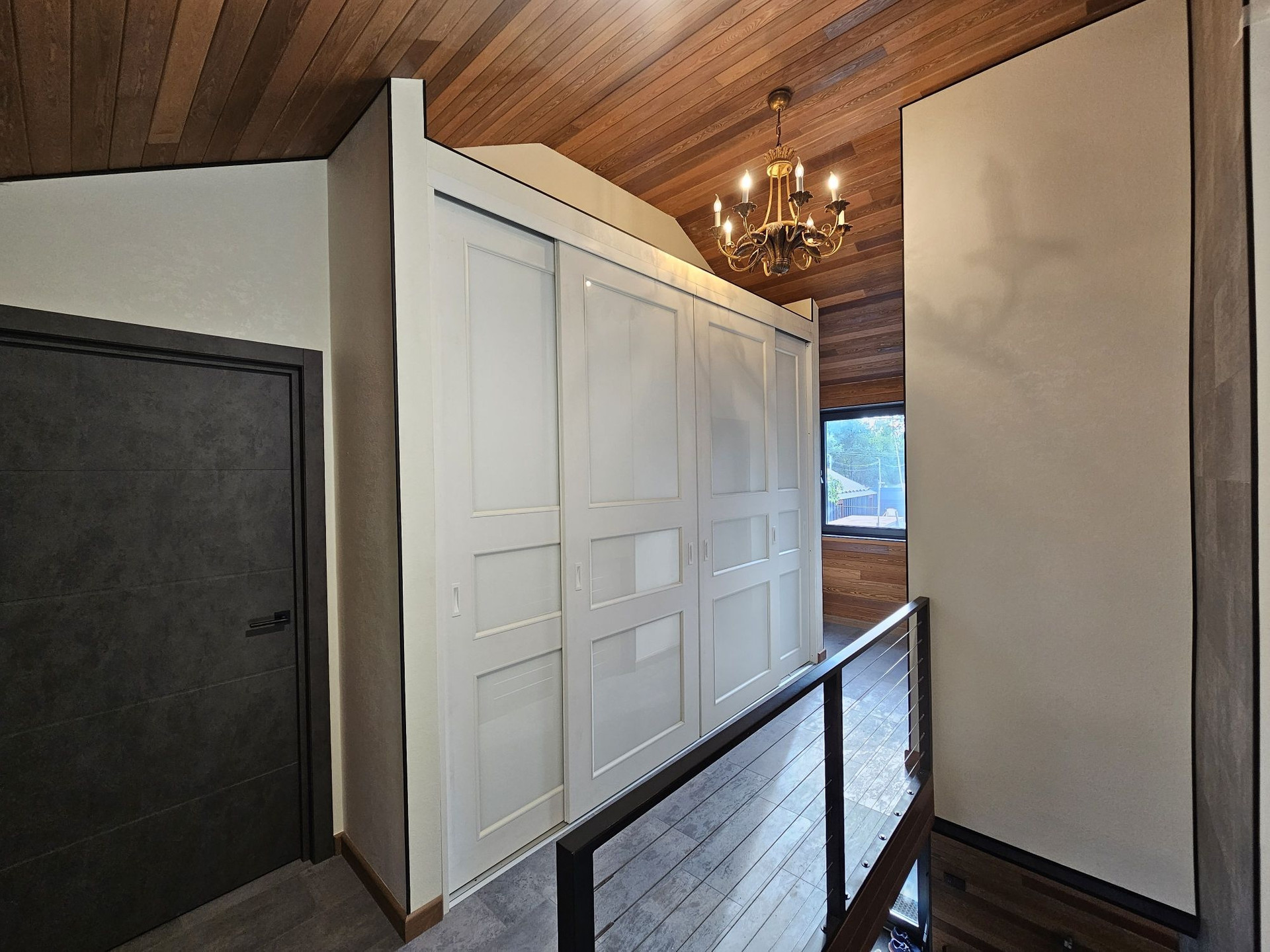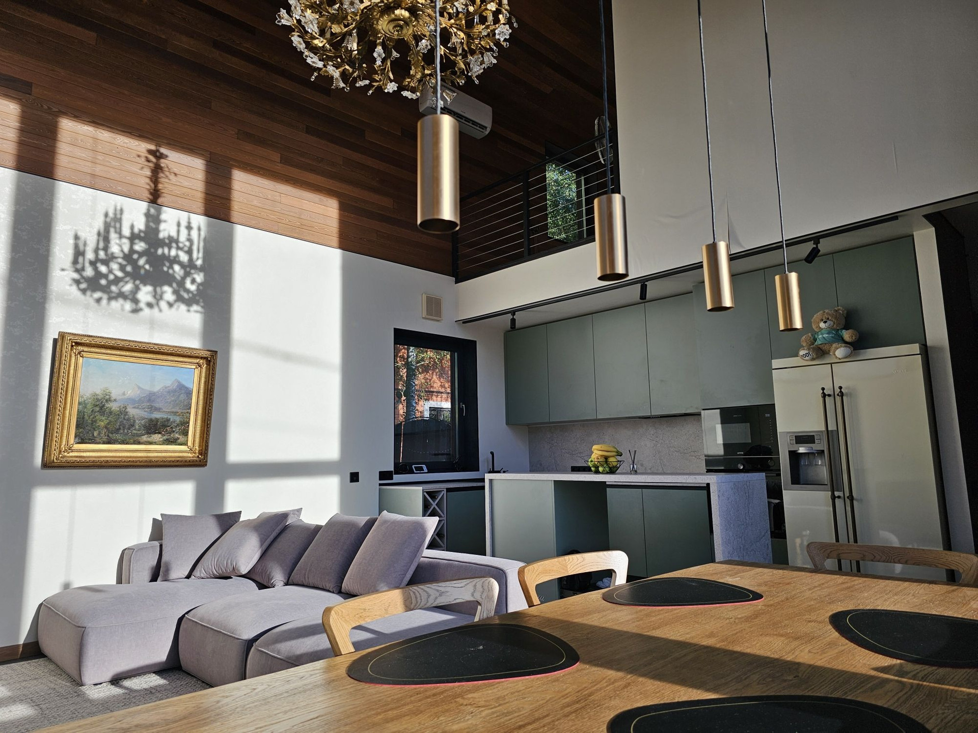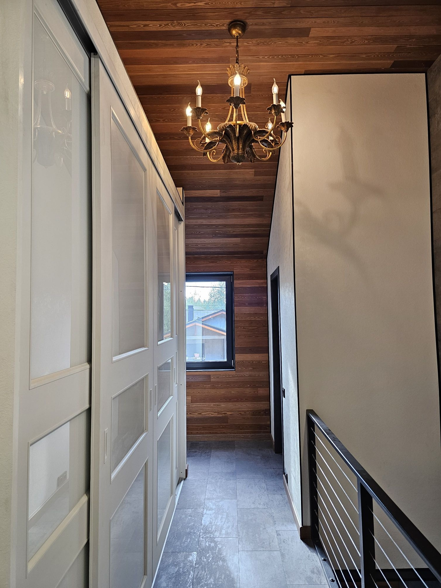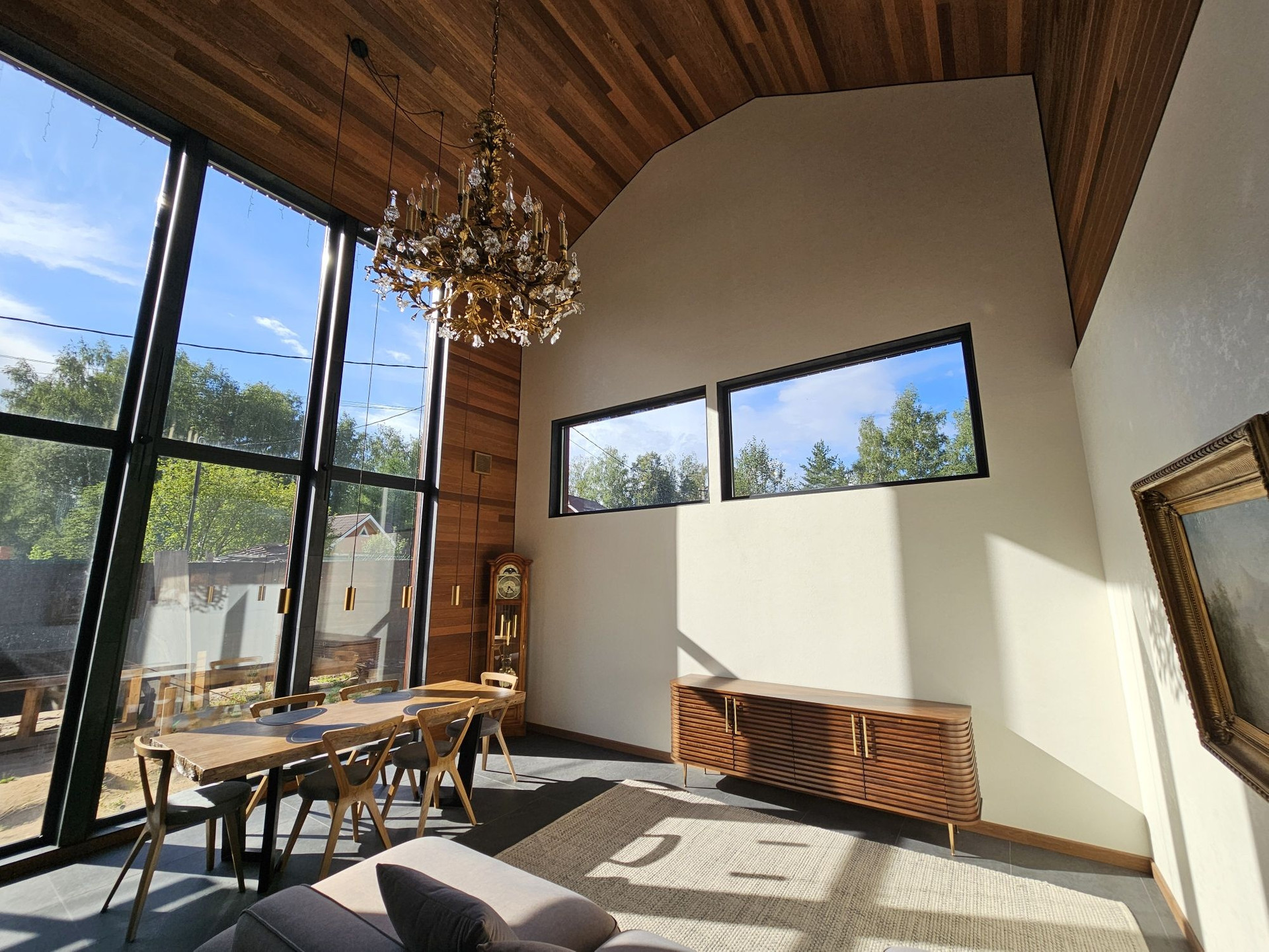 Отделка потолка и части стен лиственницей, покрытой натуральным маслом.