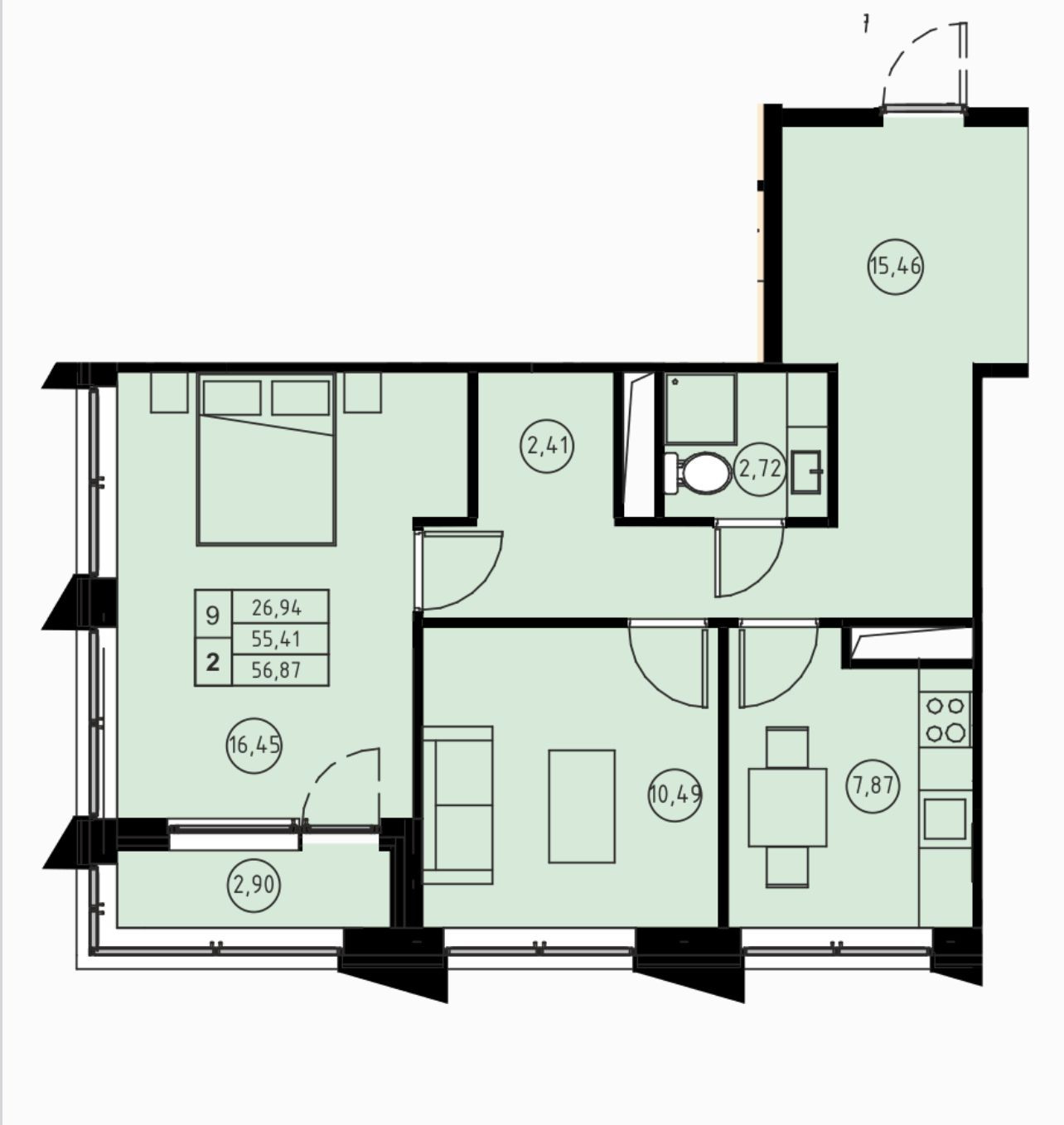 Общая площадь 57 м2