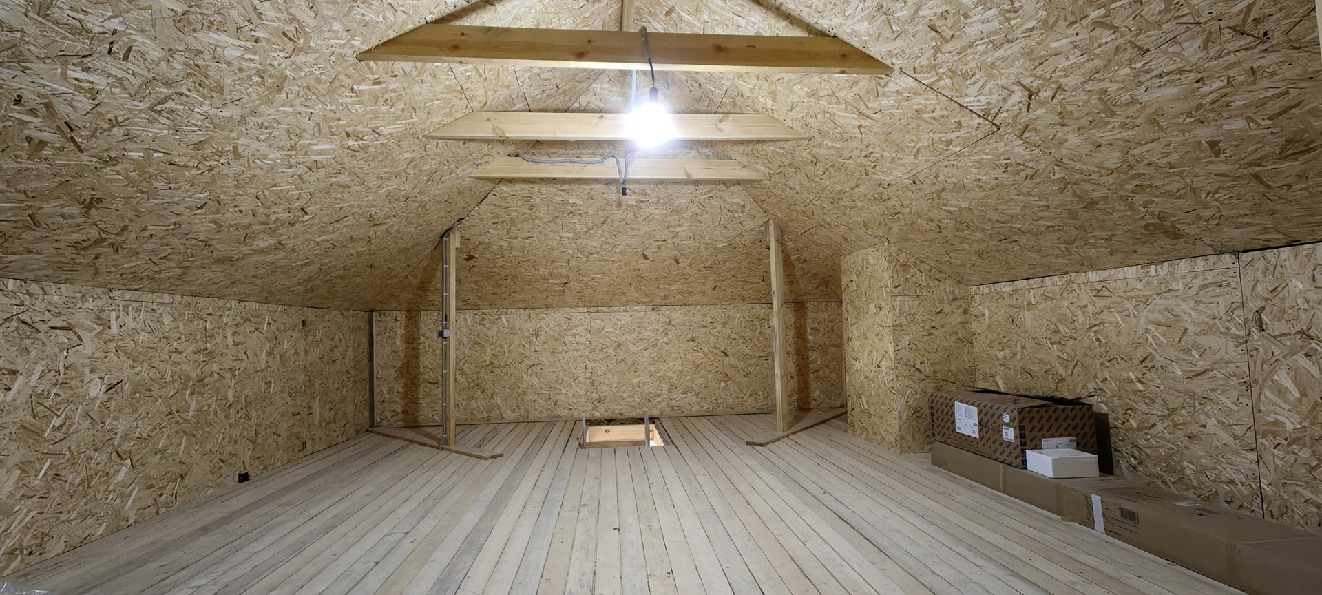 Чердак – полностью обшит ОSВ, есть освещение и розетка (лестница ждет чистовой отделки)