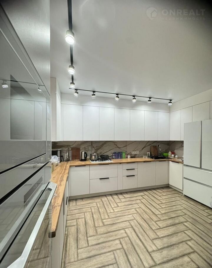Спускаясь на 1 этаж по лестнице вы окажетесь в просторной светлой кухне с новой встроенной мебелью и современной техникой.
