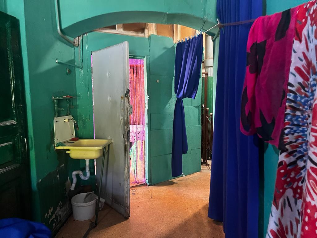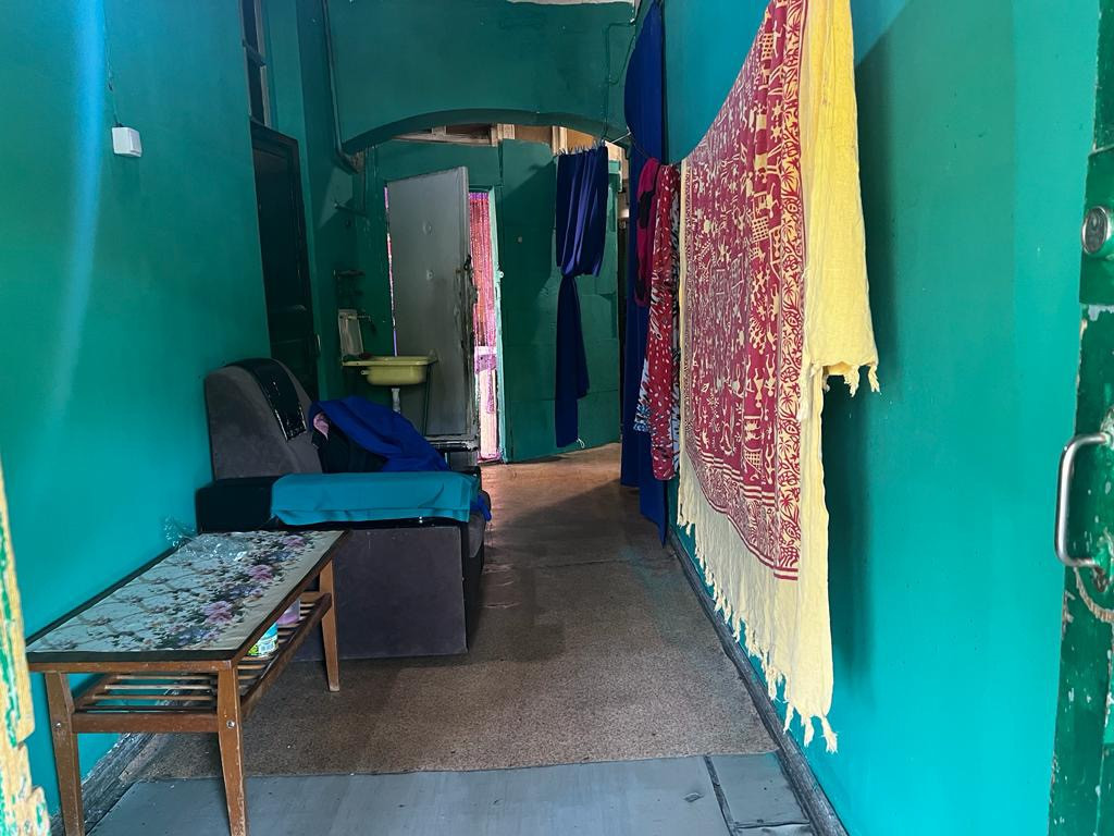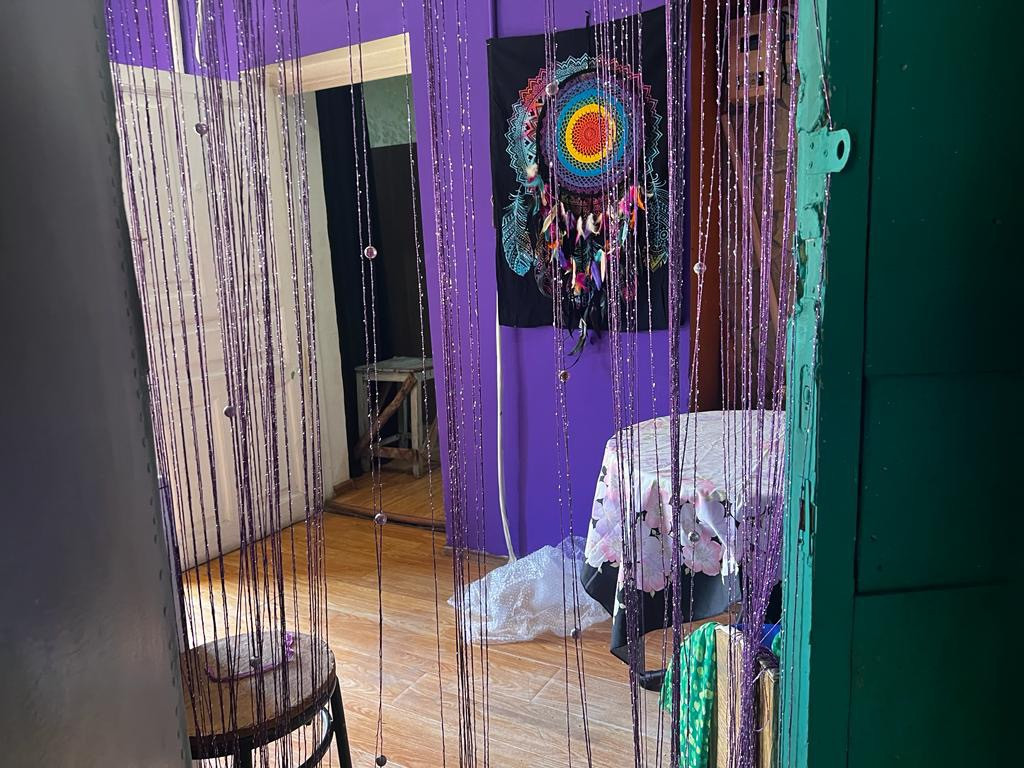 В нашей квартире снимали фильм , на фотографиях дизайнеры декорировали комнаты , коридор .