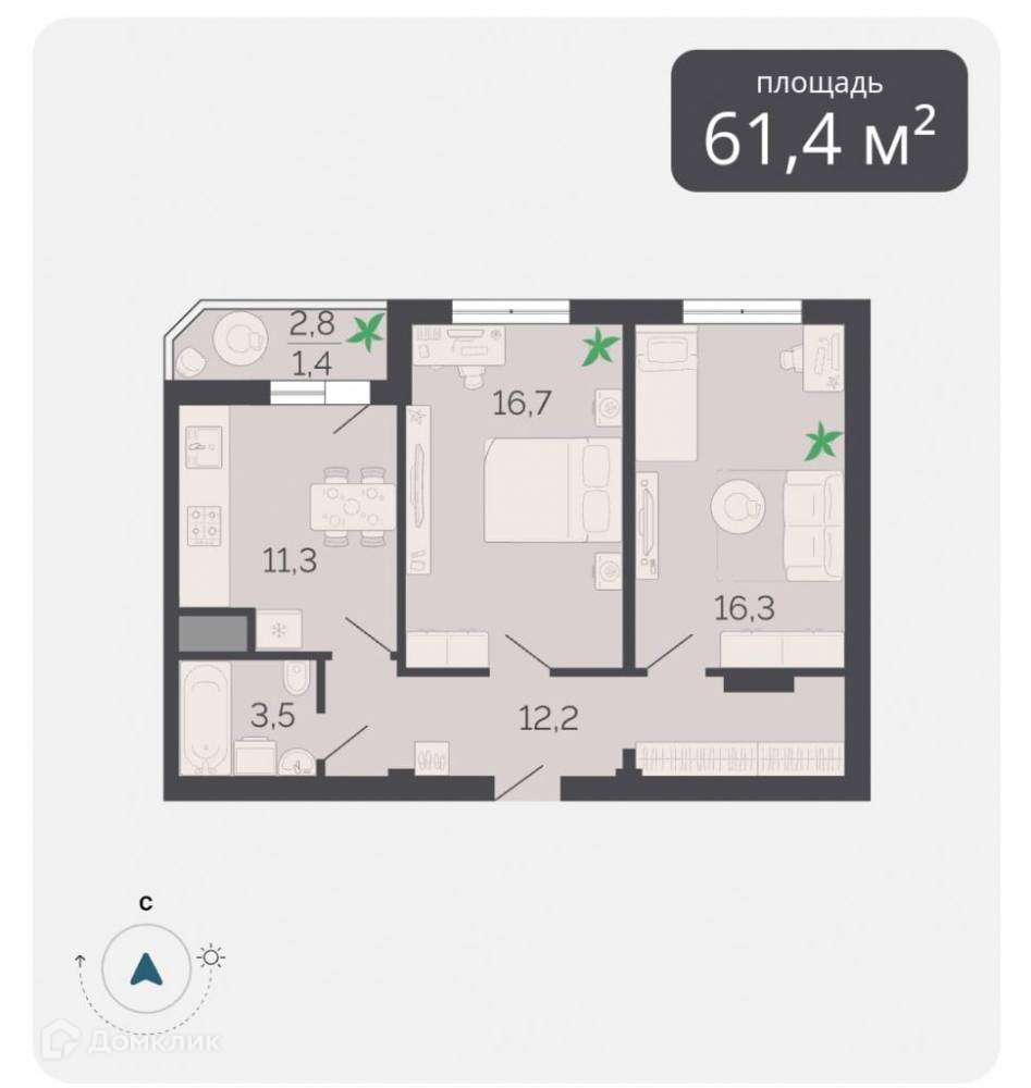 Общая площадь 61.4 м2