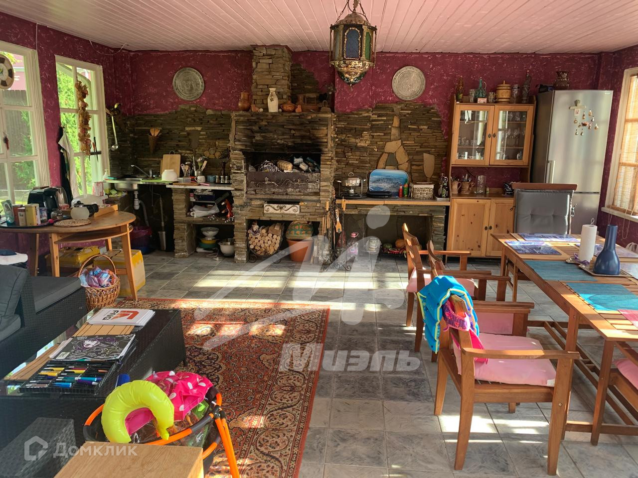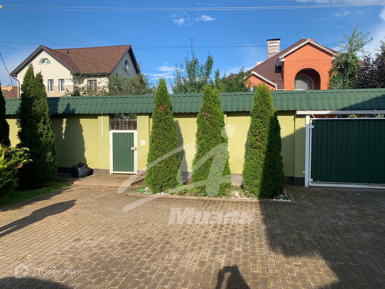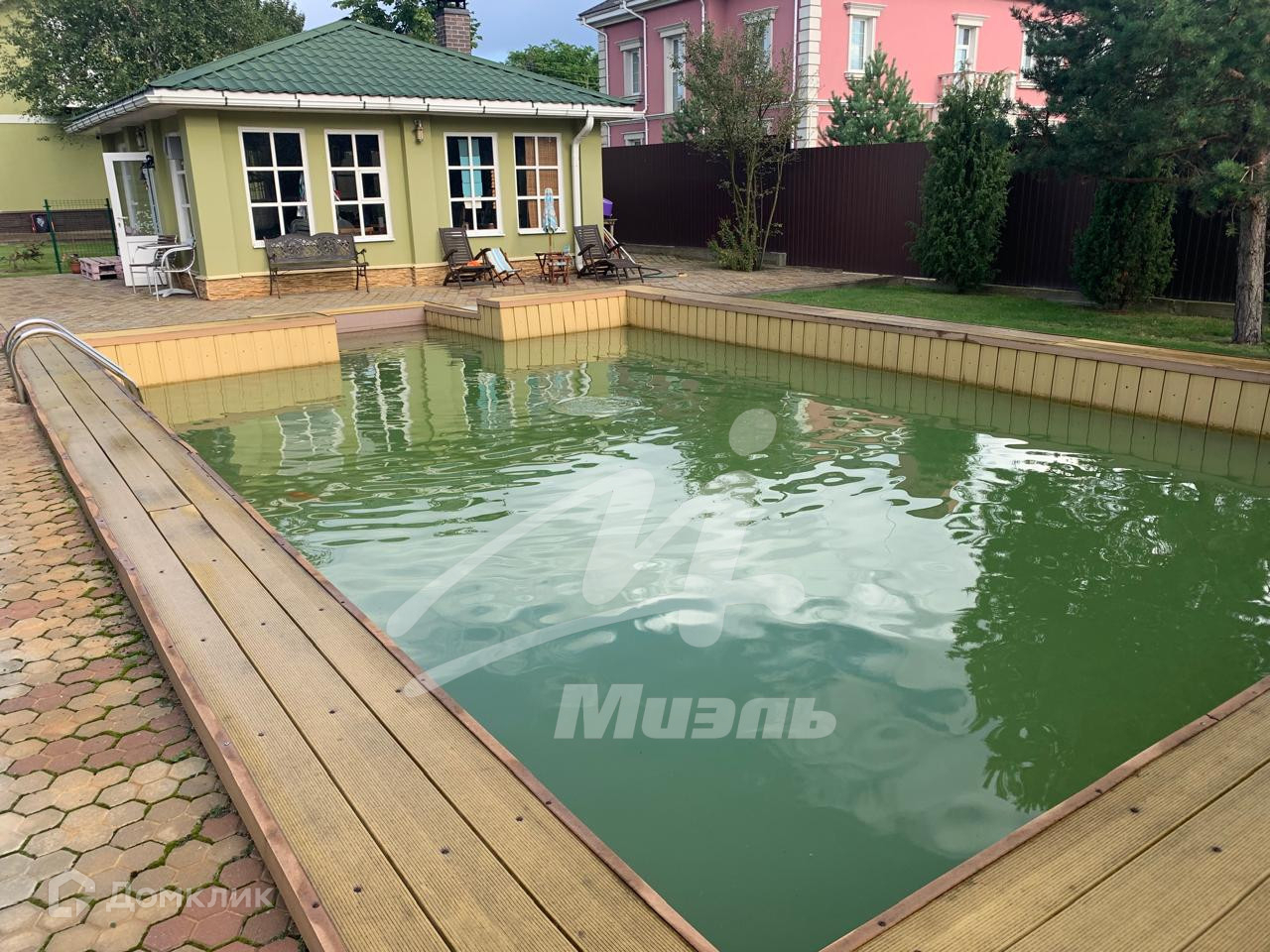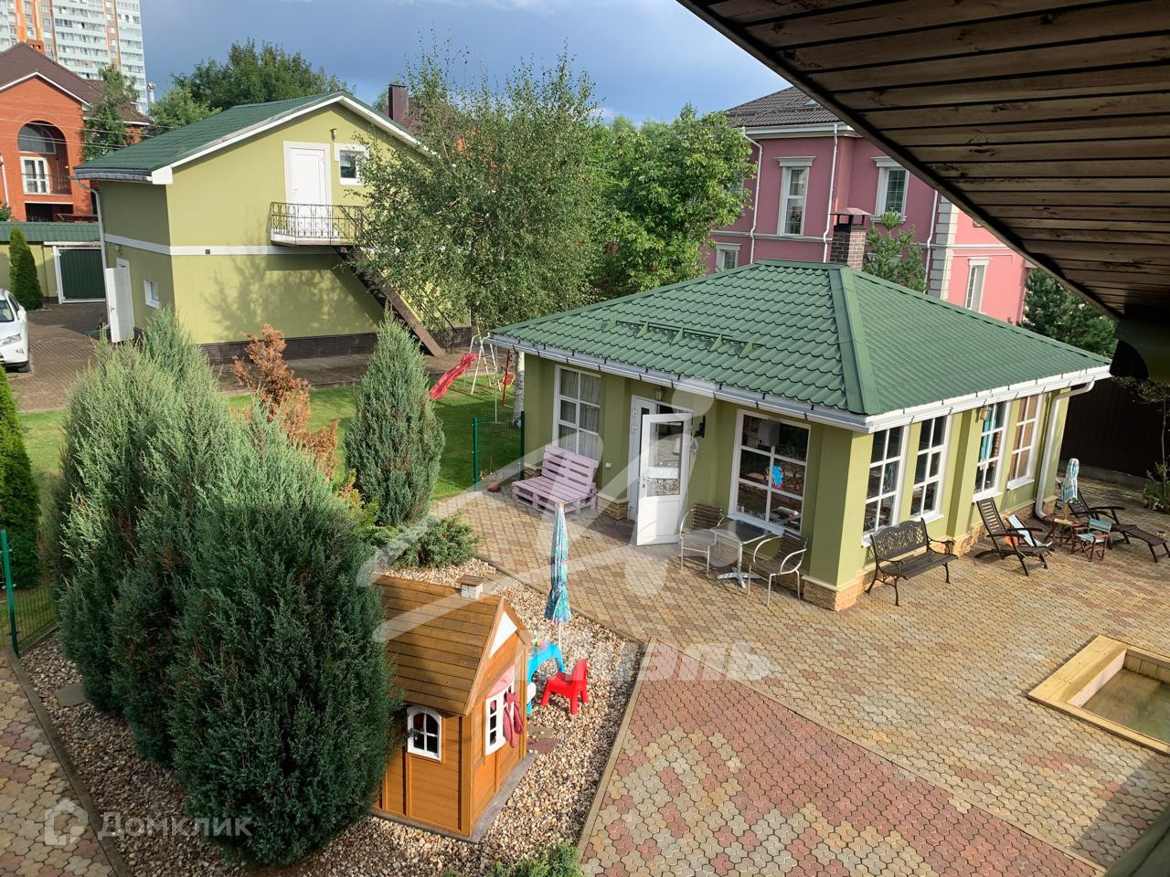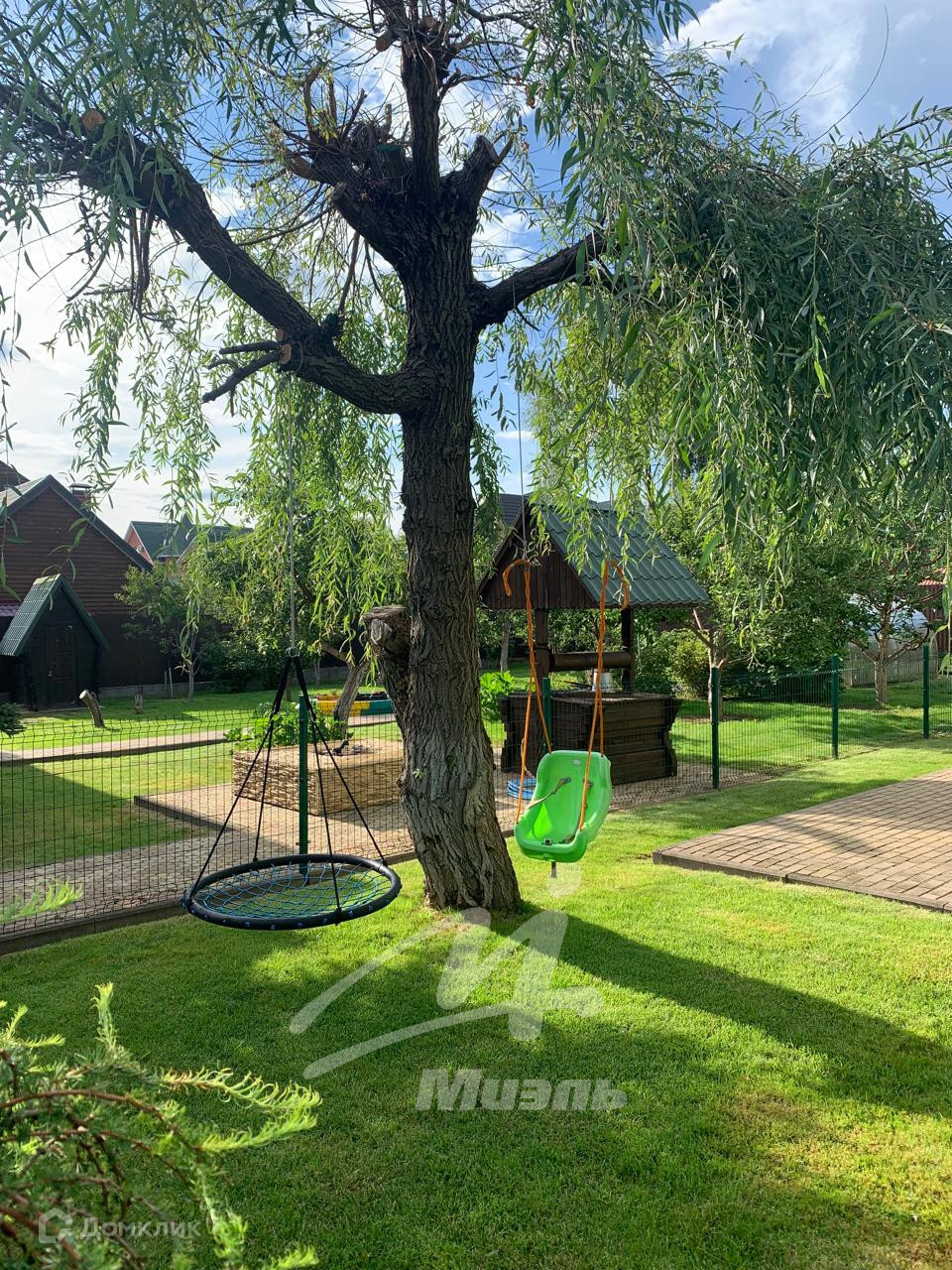 (глубина три метра), застеклённая беседка с возможностью обогрева и оборудована кирпичной системой барбекю, теплица, уличный туалет с водопроводом, вольер для собак, гараж на две машины, детская площадка с качелями. Эргономика участка позволяет дополнительные строения.