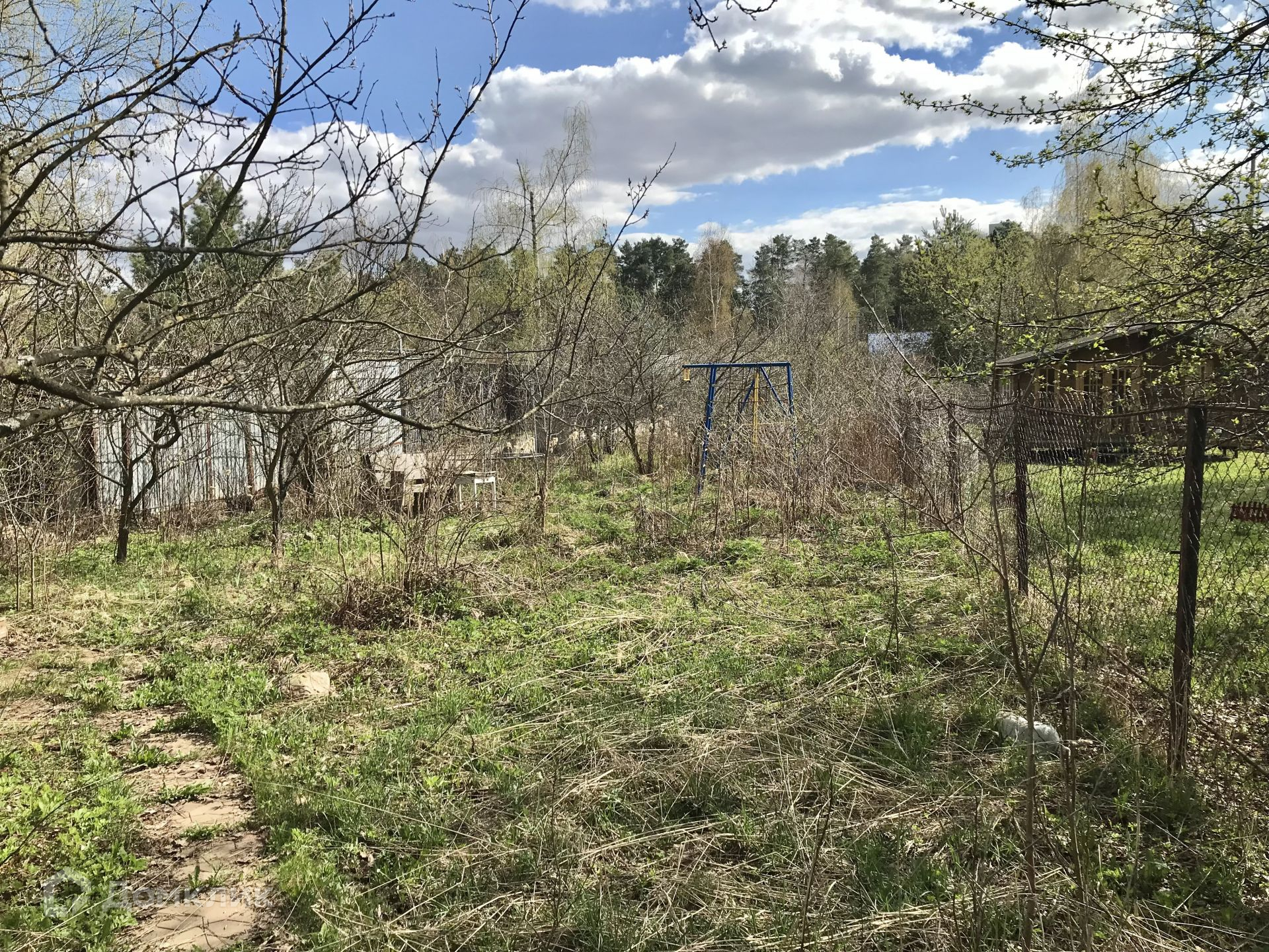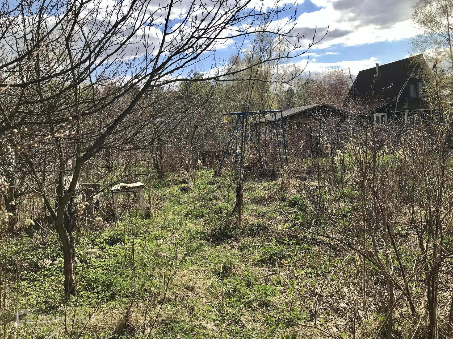На участке стоит контейнер и имеется детская площадка.