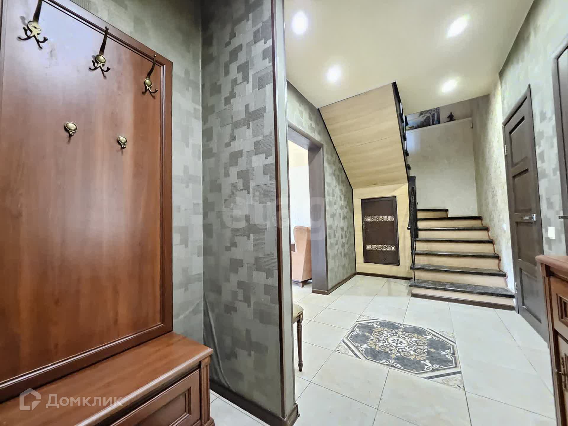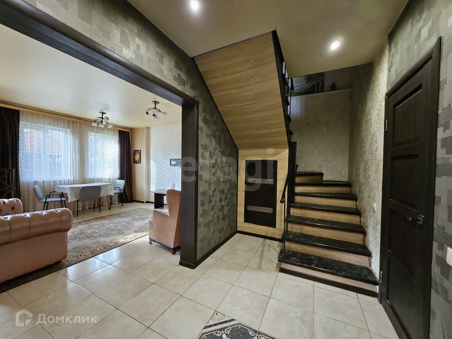 На первом этаже просторная кухня гостиная с выходом на участок, большая гардеробная комната и совместный санузел.