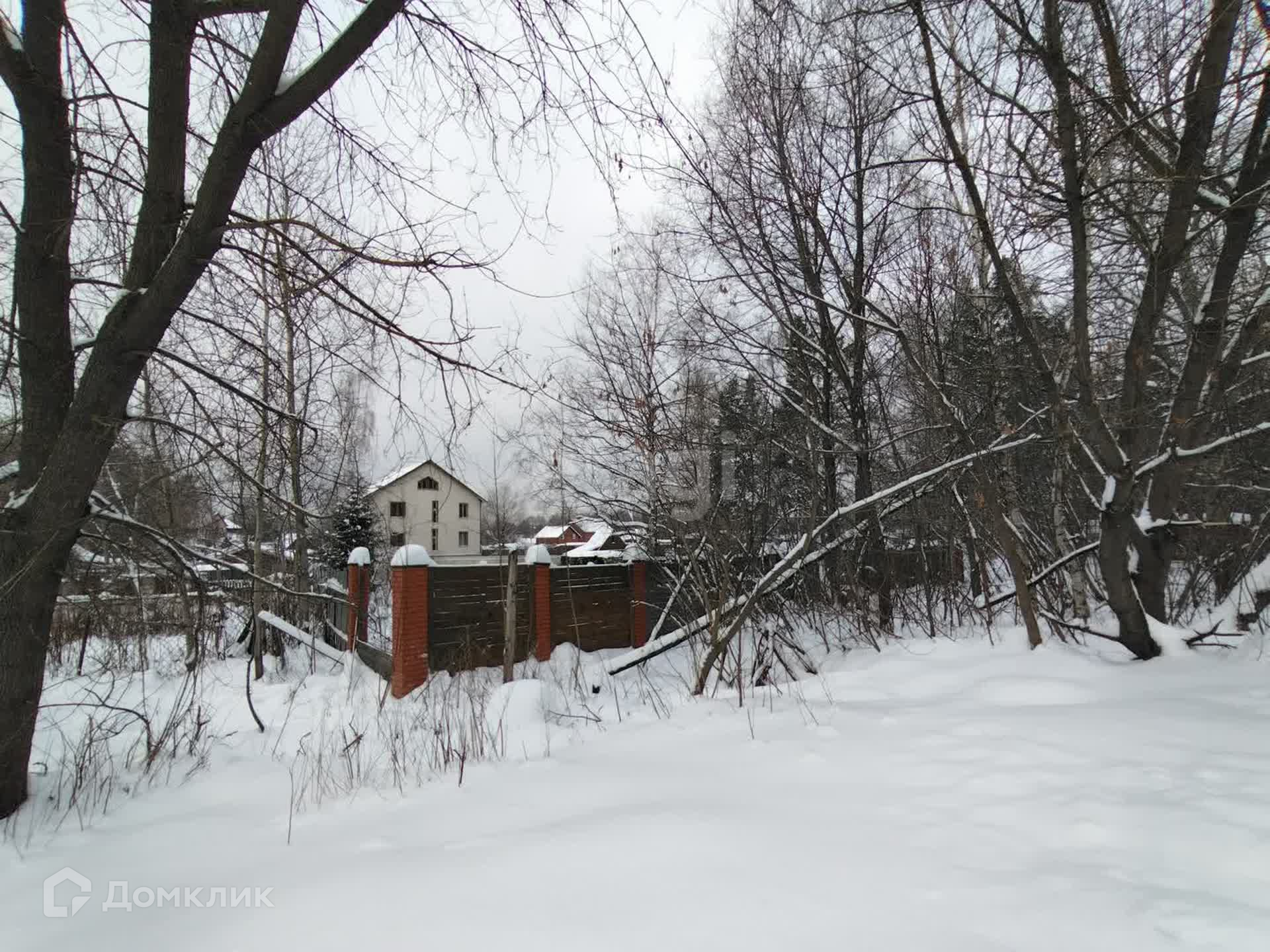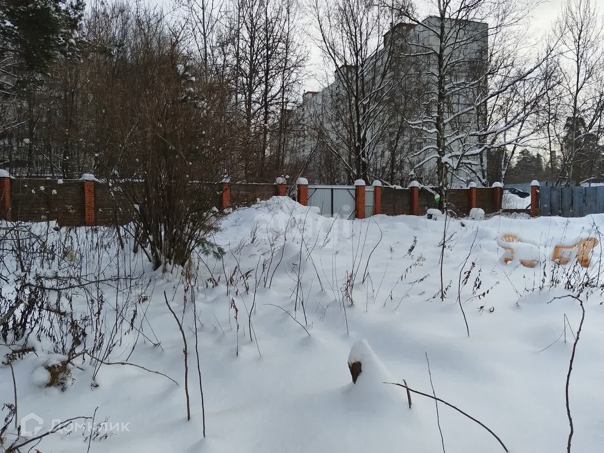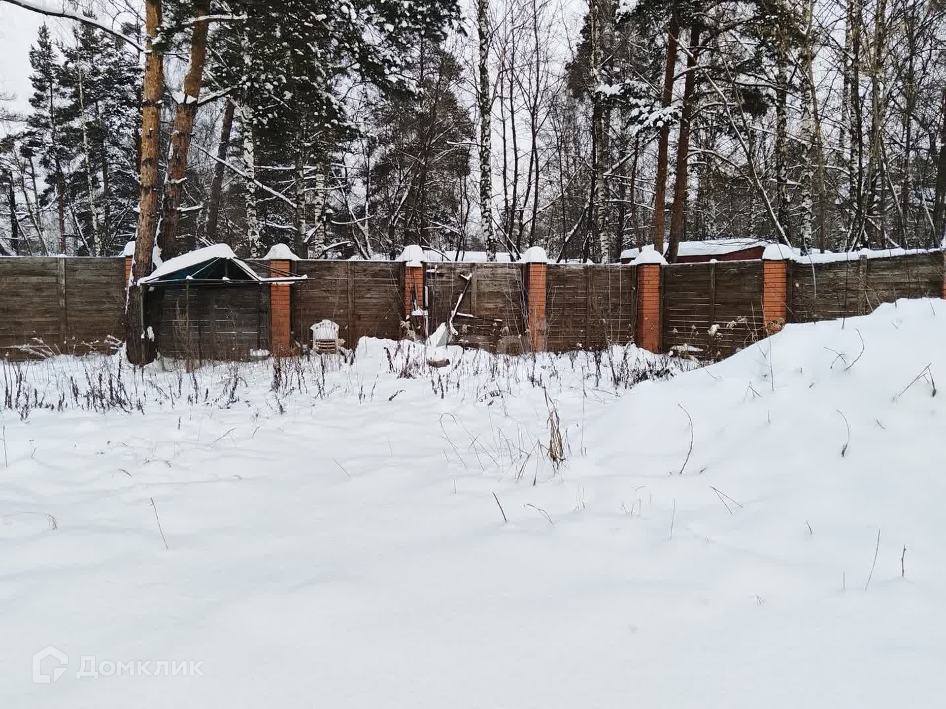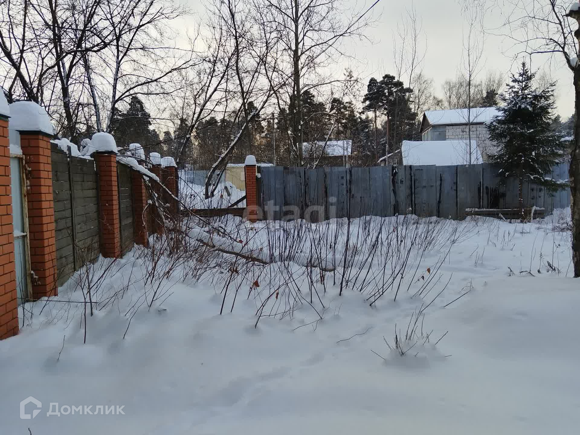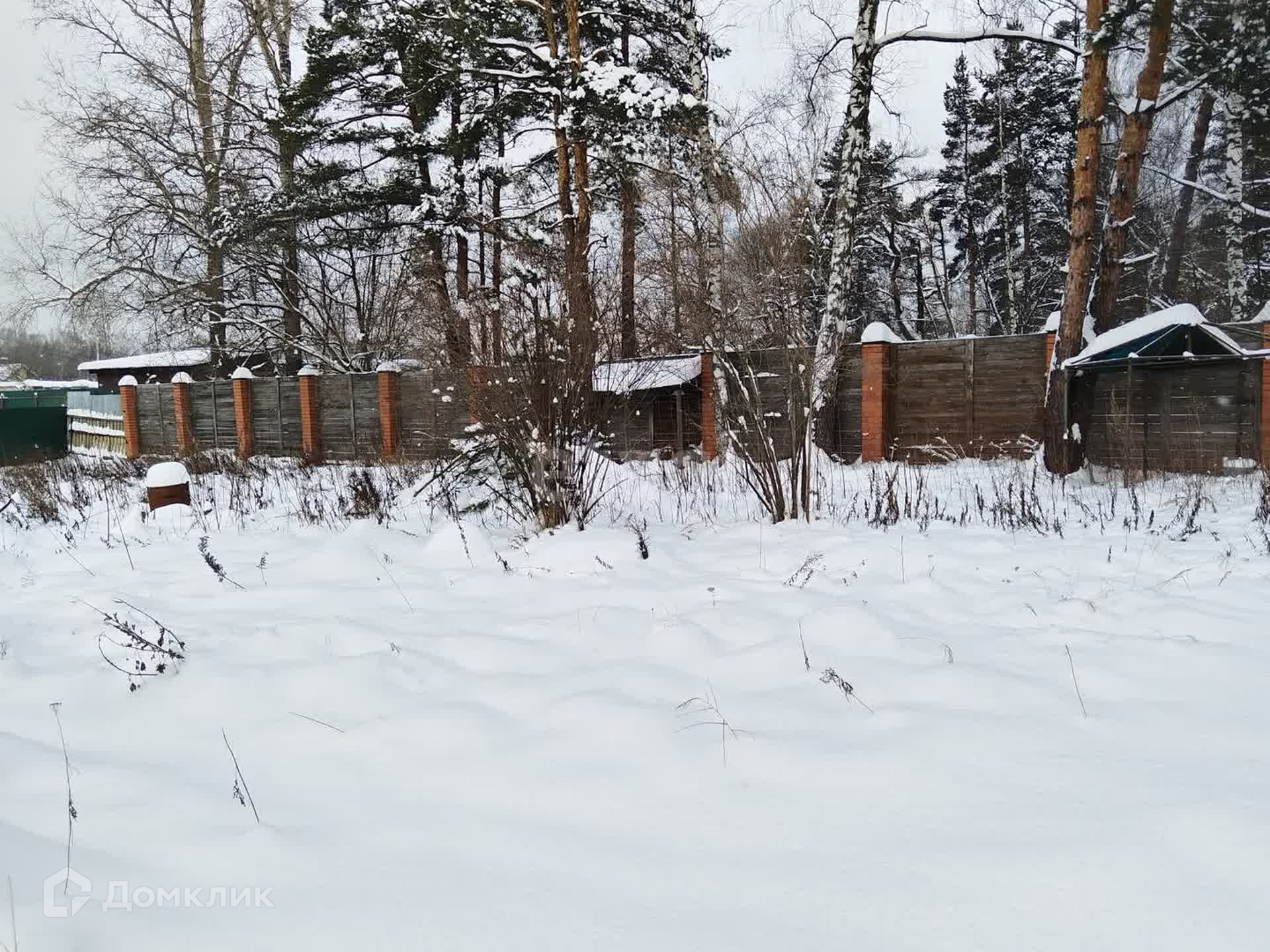 Участок правильной прямоугольной формы, по всему периметру забор (кирпичные столбы на фундаменте + дерево).