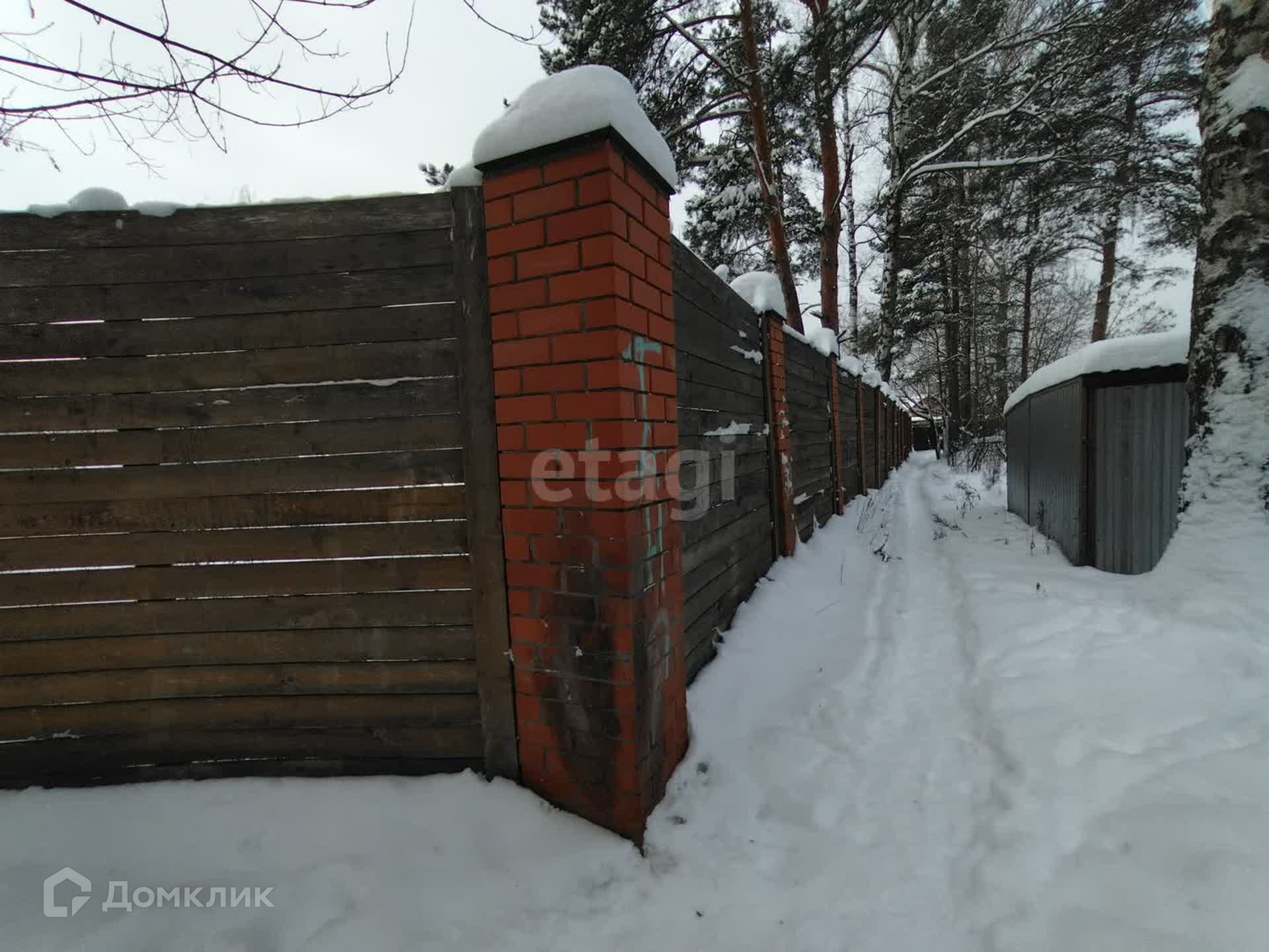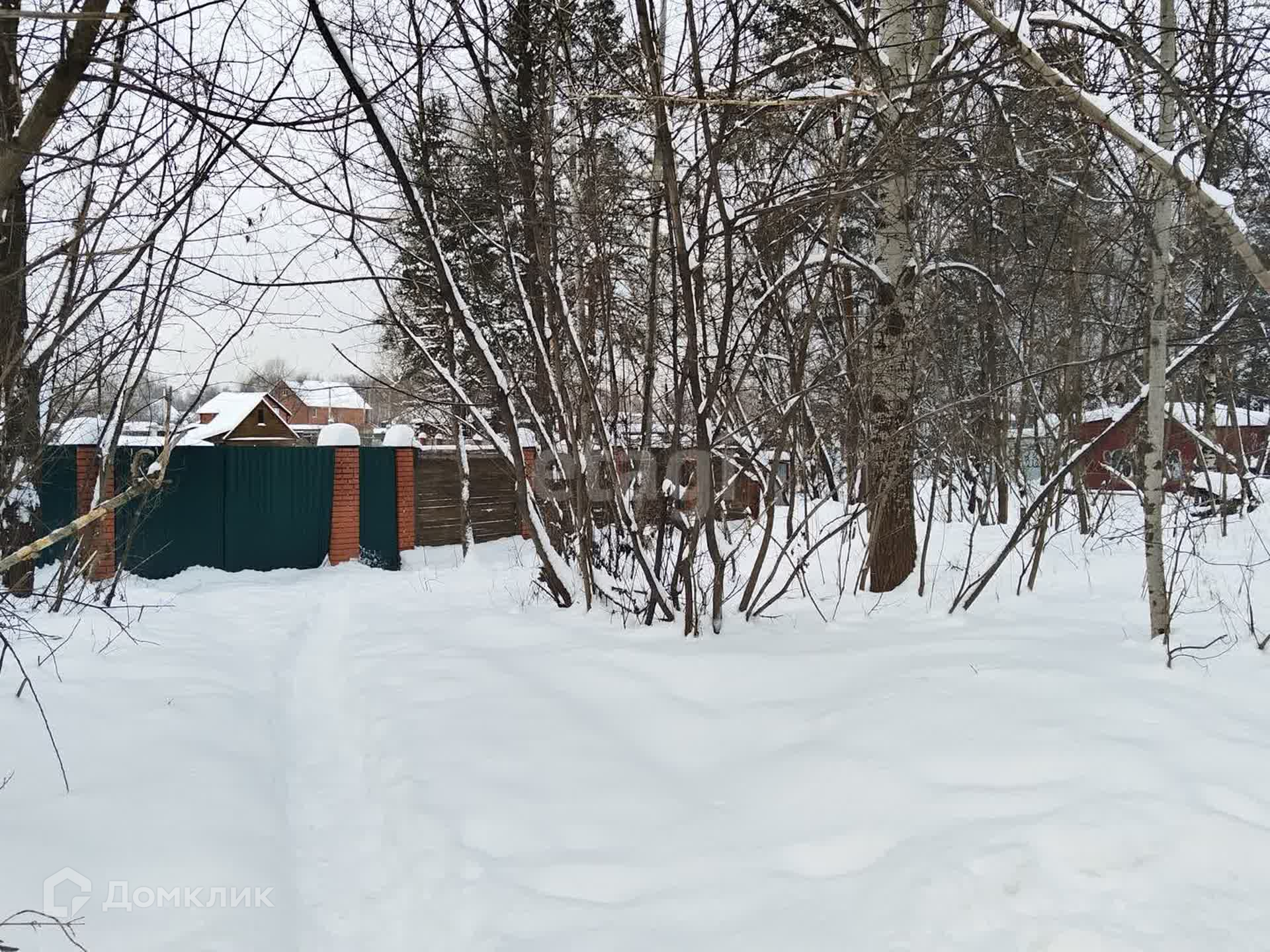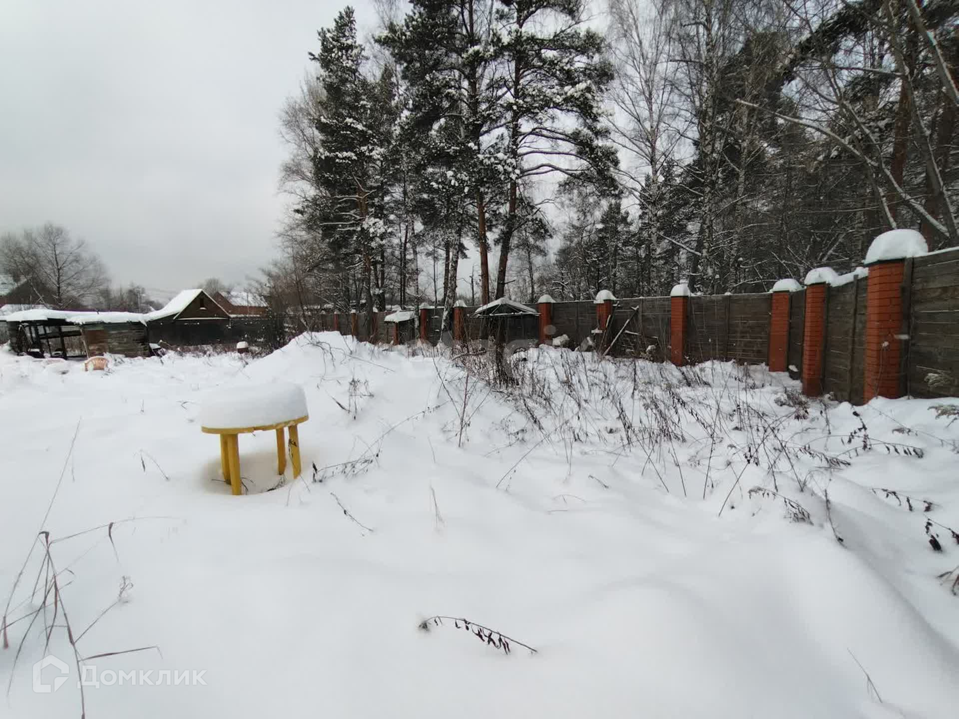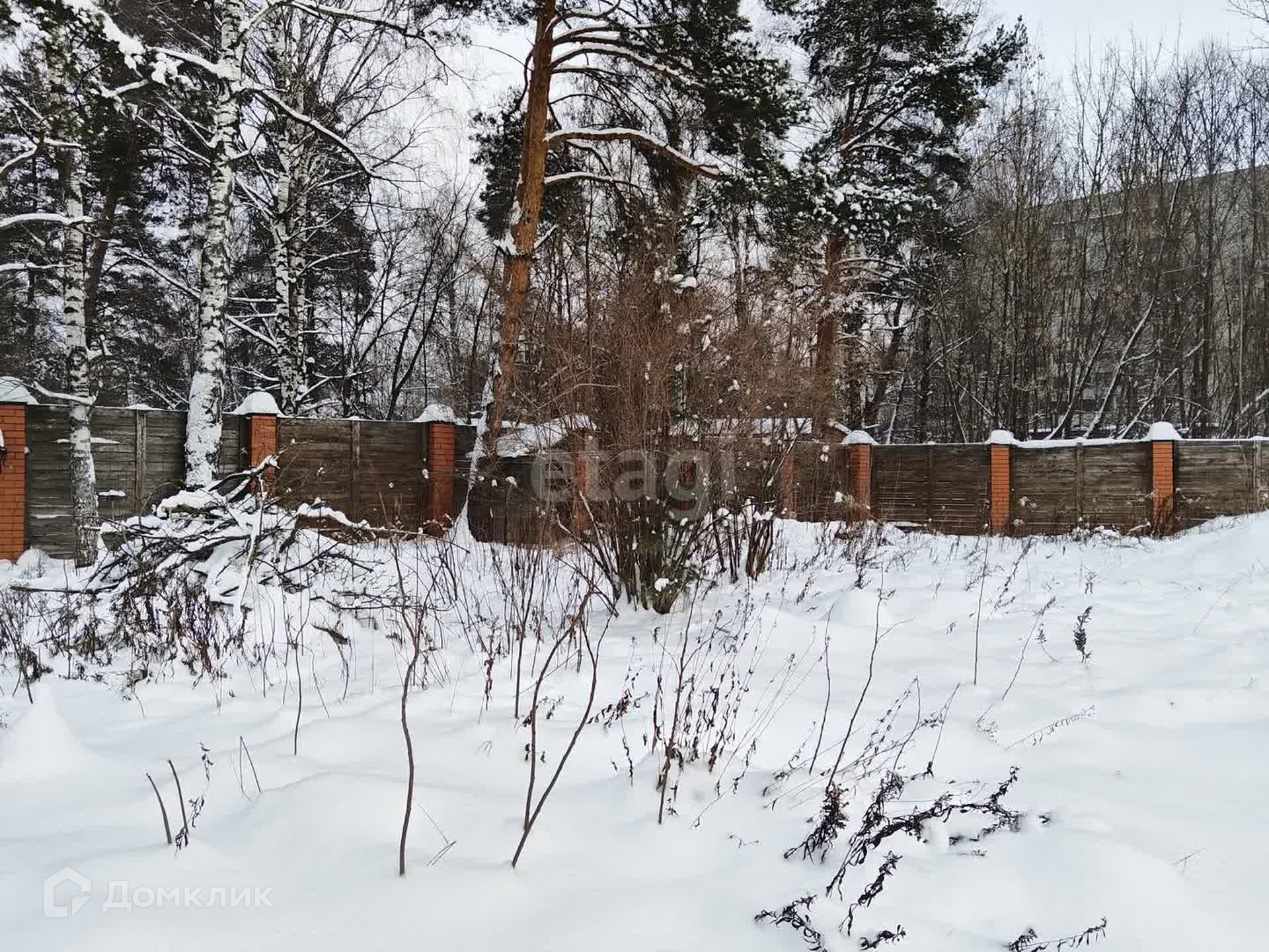 Участок правильной прямоугольной формы, по всему периметру забор (кирпичные столбы на фундаменте + дерево).