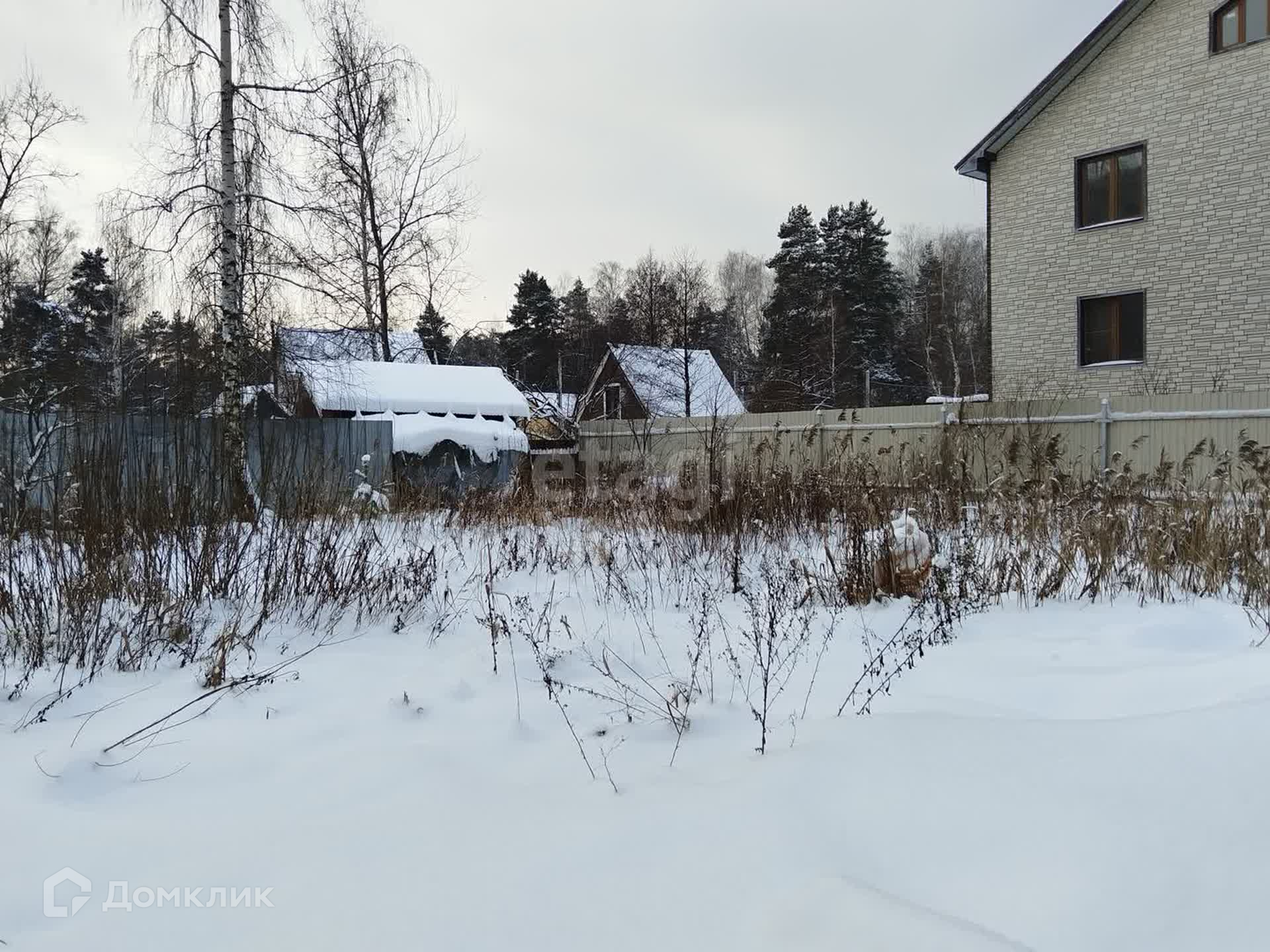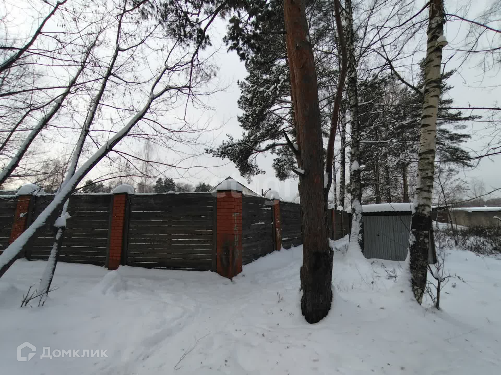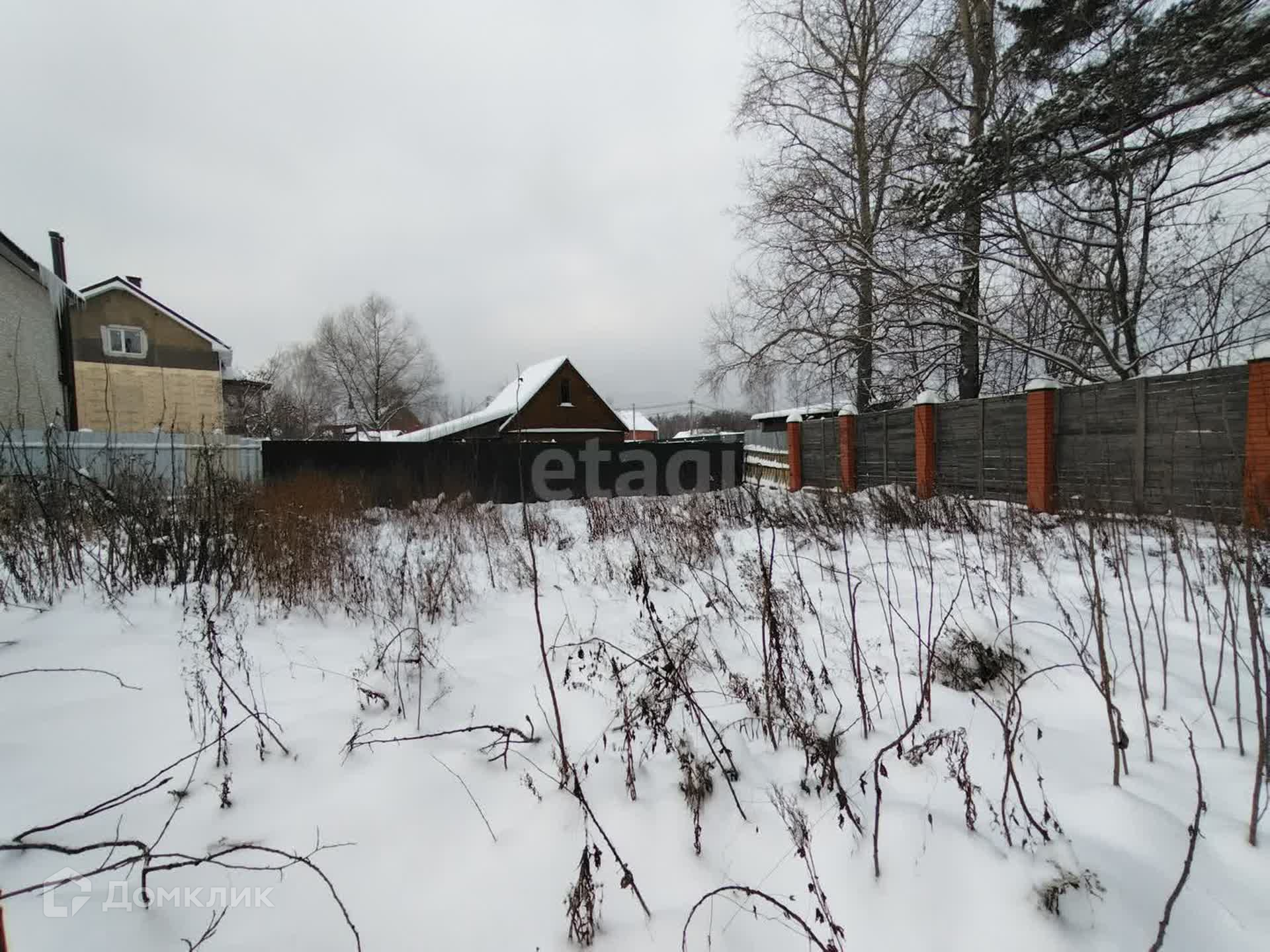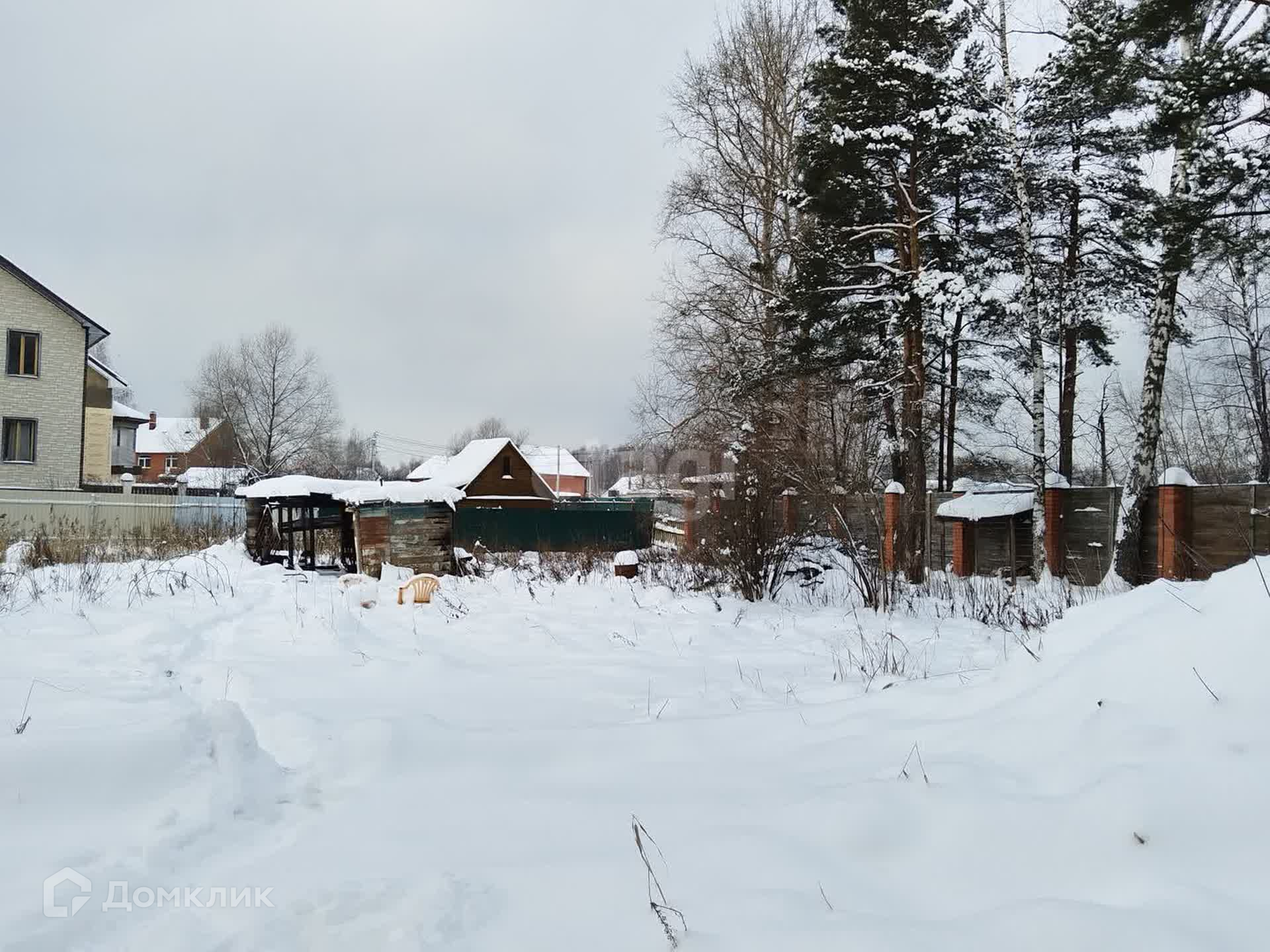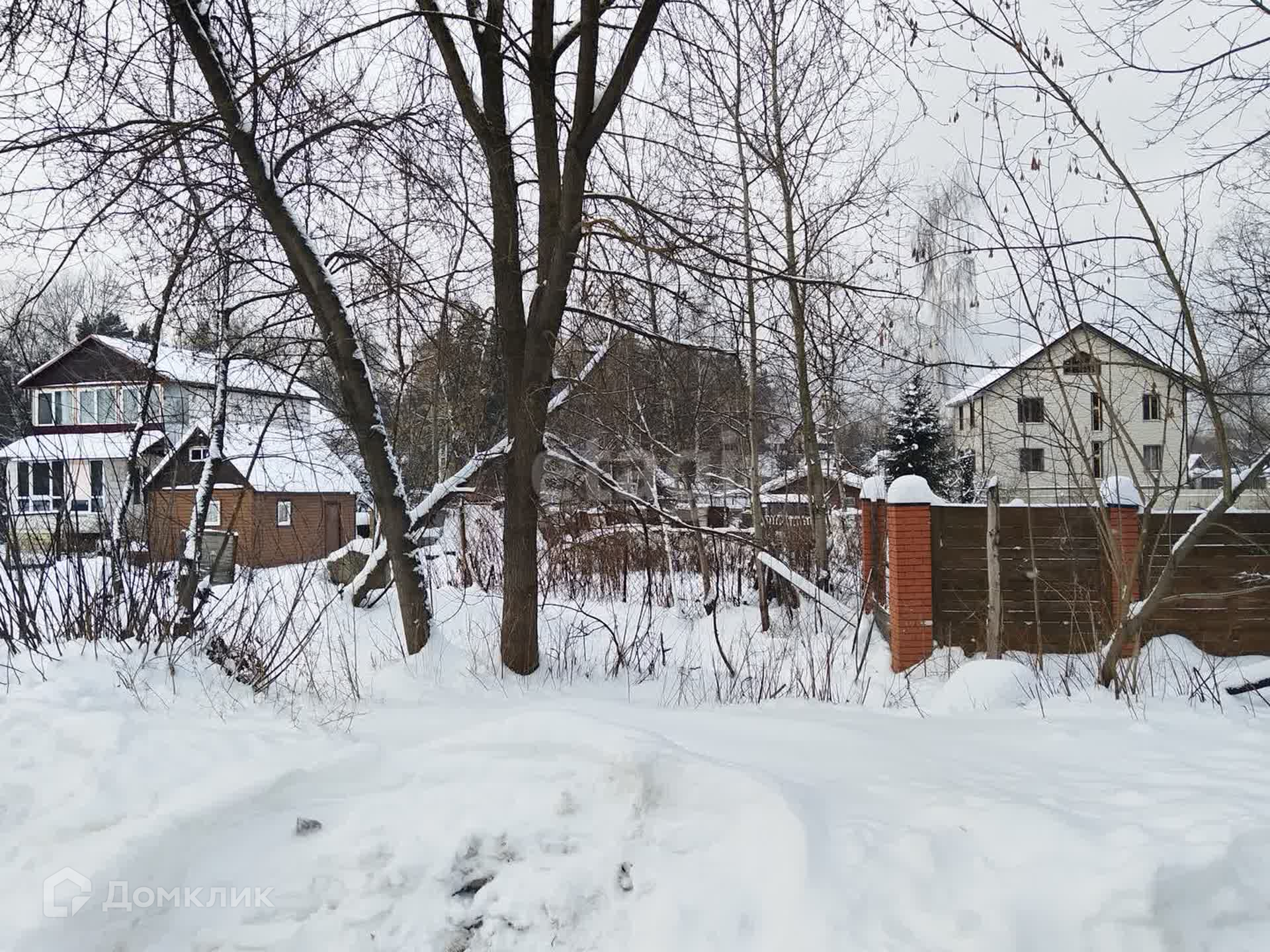 Участок правильной прямоугольной формы, по всему периметру забор (кирпичные столбы на фундаменте + дерево).
